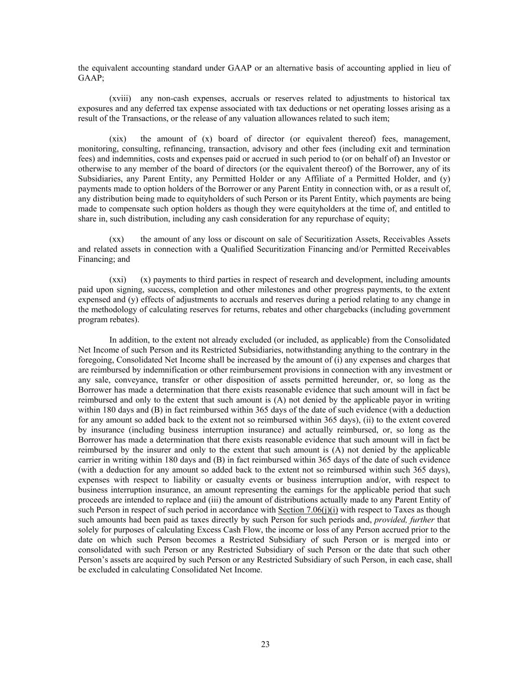 the equivalent accounting standard under GAAP or an alternative basis of accounting applied in lieu of GAAP; (xviii) any non-cash expenses, accruals or reserves related to adjustments to historical tax exposures and any deferred tax expense associated with tax deductions or net operating losses arising as a result of the Transactions, or the release of any valuation allowances related to such item; (xix) the amount of (x) board of director (or equivalent thereof) fees, management, monitoring, consulting, refinancing, transaction, advisory and other fees (including exit and termination fees) and indemnities, costs and expenses paid or accrued in such period to (or on behalf of) an Investor or otherwise to any member of the board of directors (or the equivalent thereof) of the Borrower, any of its Subsidiaries, any Parent Entity, any Permitted Holder or any Affiliate of a Permitted Holder, and (y) payments made to option holders of the Borrower or any Parent Entity in connection with, or as a result of, any distribution being made to equityholders of such Person or its Parent Entity, which payments are being made to compensate such option holders as though they were equityholders at the time of, and entitled to share in, such distribution, including any cash consideration for any repurchase of equity; (xx) the amount of any loss or discount on sale of Securitization Assets, Receivables Assets and related assets in connection with a Qualified Securitization Financing and/or Permitted Receivables Financing; and (xxi) (x) payments to third parties in respect of research and development, including amounts paid upon signing, success, completion and other milestones and other progress payments, to the extent expensed and (y) effects of adjustments to accruals and reserves during a period relating to any change in the methodology of calculating reserves for returns, rebates and other chargebacks (including government program rebates). In addition, to the extent not already excluded (or included, as applicable) from the Consolidated Net Income of such Person and its Restricted Subsidiaries, notwithstanding anything to the contrary in the foregoing, Consolidated Net Income shall be increased by the amount of (i) any expenses and charges that are reimbursed by indemnification or other reimbursement provisions in connection with any investment or any sale, conveyance, transfer or other disposition of assets permitted hereunder, or, so long as the Borrower has made a determination that there exists reasonable evidence that such amount will in fact be reimbursed and only to the extent that such amount is (A) not denied by the applicable payor in writing within 180 days and (B) in fact reimbursed within 365 days of the date of such evidence (with a deduction for any amount so added back to the extent not so reimbursed within 365 days), (ii) to the extent covered by insurance (including business interruption insurance) and actually reimbursed, or, so long as the Borrower has made a determination that there exists reasonable evidence that such amount will in fact be reimbursed by the insurer and only to the extent that such amount is (A) not denied by the applicable carrier in writing within 180 days and (B) in fact reimbursed within 365 days of the date of such evidence (with a deduction for any amount so added back to the extent not so reimbursed within such 365 days), expenses with respect to liability or casualty events or business interruption and/or, with respect to business interruption insurance, an amount representing the earnings for the applicable period that such proceeds are intended to replace and (iii) the amount of distributions actually made to any Parent Entity of such Person in respect of such period in accordance with Section 7.06(j)(i) with respect to Taxes as though such amounts had been paid as taxes directly by such Person for such periods and, provided, further that solely for purposes of calculating Excess Cash Flow, the income or loss of any Person accrued prior to the date on which such Person becomes a Restricted Subsidiary of such Person or is merged into or consolidated with such Person or any Restricted Subsidiary of such Person or the date that such other Person’s assets are acquired by such Person or any Restricted Subsidiary of such Person, in each case, shall be excluded in calculating Consolidated Net Income. 23