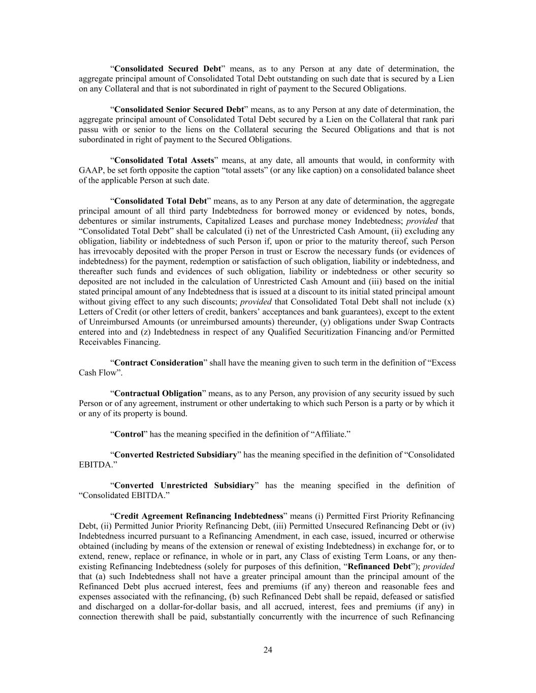 “Consolidated Secured Debt” means, as to any Person at any date of determination, the aggregate principal amount of Consolidated Total Debt outstanding on such date that is secured by a Lien on any Collateral and that is not subordinated in right of payment to the Secured Obligations. “Consolidated Senior Secured Debt” means, as to any Person at any date of determination, the aggregate principal amount of Consolidated Total Debt secured by a Lien on the Collateral that rank pari passu with or senior to the liens on the Collateral securing the Secured Obligations and that is not subordinated in right of payment to the Secured Obligations. “Consolidated Total Assets” means, at any date, all amounts that would, in conformity with GAAP, be set forth opposite the caption “total assets” (or any like caption) on a consolidated balance sheet of the applicable Person at such date. “Consolidated Total Debt” means, as to any Person at any date of determination, the aggregate principal amount of all third party Indebtedness for borrowed money or evidenced by notes, bonds, debentures or similar instruments, Capitalized Leases and purchase money Indebtedness; provided that “Consolidated Total Debt” shall be calculated (i) net of the Unrestricted Cash Amount, (ii) excluding any obligation, liability or indebtedness of such Person if, upon or prior to the maturity thereof, such Person has irrevocably deposited with the proper Person in trust or Escrow the necessary funds (or evidences of indebtedness) for the payment, redemption or satisfaction of such obligation, liability or indebtedness, and thereafter such funds and evidences of such obligation, liability or indebtedness or other security so deposited are not included in the calculation of Unrestricted Cash Amount and (iii) based on the initial stated principal amount of any Indebtedness that is issued at a discount to its initial stated principal amount without giving effect to any such discounts; provided that Consolidated Total Debt shall not include (x) Letters of Credit (or other letters of credit, bankers’ acceptances and bank guarantees), except to the extent of Unreimbursed Amounts (or unreimbursed amounts) thereunder, (y) obligations under Swap Contracts entered into and (z) Indebtedness in respect of any Qualified Securitization Financing and/or Permitted Receivables Financing. “Contract Consideration” shall have the meaning given to such term in the definition of “Excess Cash Flow”. “Contractual Obligation” means, as to any Person, any provision of any security issued by such Person or of any agreement, instrument or other undertaking to which such Person is a party or by which it or any of its property is bound. “Control” has the meaning specified in the definition of “Affiliate.” “Converted Restricted Subsidiary” has the meaning specified in the definition of “Consolidated EBITDA.” “Converted Unrestricted Subsidiary” has the meaning specified in the definition of “Consolidated EBITDA.” “Credit Agreement Refinancing Indebtedness” means (i) Permitted First Priority Refinancing Debt, (ii) Permitted Junior Priority Refinancing Debt, (iii) Permitted Unsecured Refinancing Debt or (iv) Indebtedness incurred pursuant to a Refinancing Amendment, in each case, issued, incurred or otherwise obtained (including by means of the extension or renewal of existing Indebtedness) in exchange for, or to extend, renew, replace or refinance, in whole or in part, any Class of existing Term Loans, or any then- existing Refinancing Indebtedness (solely for purposes of this definition, “Refinanced Debt”); provided that (a) such Indebtedness shall not have a greater principal amount than the principal amount of the Refinanced Debt plus accrued interest, fees and premiums (if any) thereon and reasonable fees and expenses associated with the refinancing, (b) such Refinanced Debt shall be repaid, defeased or satisfied and discharged on a dollar-for-dollar basis, and all accrued, interest, fees and premiums (if any) in connection therewith shall be paid, substantially concurrently with the incurrence of such Refinancing 24