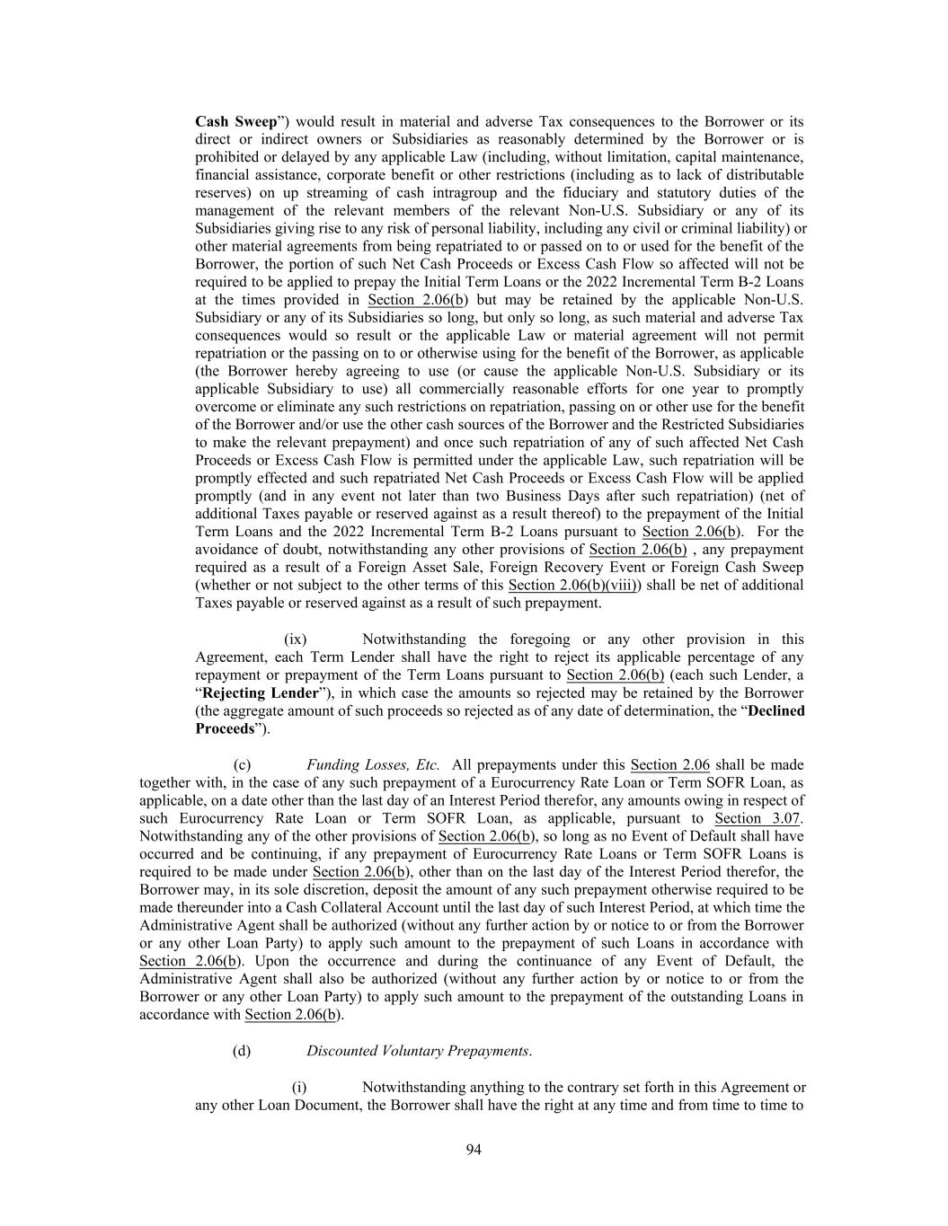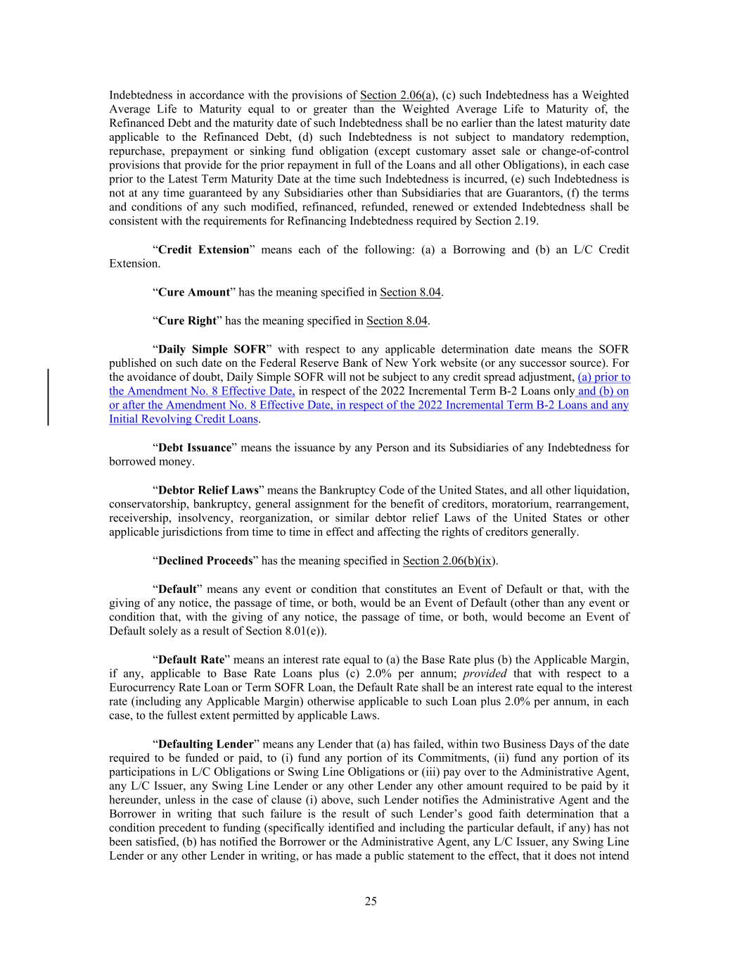 Indebtedness in accordance with the provisions of Section 2.06(a), (c) such Indebtedness has a Weighted Average Life to Maturity equal to or greater than the Weighted Average Life to Maturity of, the Refinanced Debt and the maturity date of such Indebtedness shall be no earlier than the latest maturity date applicable to the Refinanced Debt, (d) such Indebtedness is not subject to mandatory redemption, repurchase, prepayment or sinking fund obligation (except customary asset sale or change-of-control provisions that provide for the prior repayment in full of the Loans and all other Obligations), in each case prior to the Latest Term Maturity Date at the time such Indebtedness is incurred, (e) such Indebtedness is not at any time guaranteed by any Subsidiaries other than Subsidiaries that are Guarantors, (f) the terms and conditions of any such modified, refinanced, refunded, renewed or extended Indebtedness shall be consistent with the requirements for Refinancing Indebtedness required by Section 2.19. “Credit Extension” means each of the following: (a) a Borrowing and (b) an L/C Credit Extension. “Cure Amount” has the meaning specified in Section 8.04. “Cure Right” has the meaning specified in Section 8.04. “Daily Simple SOFR” with respect to any applicable determination date means the SOFR published on such date on the Federal Reserve Bank of New York website (or any successor source). For the avoidance of doubt, Daily Simple SOFR will not be subject to any credit spread adjustment, (a) prior to the Amendment No. 8 Effective Date, in respect of the 2022 Incremental Term B-2 Loans only and (b) on or after the Amendment No. 8 Effective Date, in respect of the 2022 Incremental Term B-2 Loans and any Initial Revolving Credit Loans. “Debt Issuance” means the issuance by any Person and its Subsidiaries of any Indebtedness for borrowed money. “Debtor Relief Laws” means the Bankruptcy Code of the United States, and all other liquidation, conservatorship, bankruptcy, general assignment for the benefit of creditors, moratorium, rearrangement, receivership, insolvency, reorganization, or similar debtor relief Laws of the United States or other applicable jurisdictions from time to time in effect and affecting the rights of creditors generally. “Declined Proceeds” has the meaning specified in Section 2.06(b)(ix). “Default” means any event or condition that constitutes an Event of Default or that, with the giving of any notice, the passage of time, or both, would be an Event of Default (other than any event or condition that, with the giving of any notice, the passage of time, or both, would become an Event of Default solely as a result of Section 8.01(e)). “Default Rate” means an interest rate equal to (a) the Base Rate plus (b) the Applicable Margin, if any, applicable to Base Rate Loans plus (c) 2.0% per annum; provided that with respect to a Eurocurrency Rate Loan or Term SOFR Loan, the Default Rate shall be an interest rate equal to the interest rate (including any Applicable Margin) otherwise applicable to such Loan plus 2.0% per annum, in each case, to the fullest extent permitted by applicable Laws. “Defaulting Lender” means any Lender that (a) has failed, within two Business Days of the date required to be funded or paid, to (i) fund any portion of its Commitments, (ii) fund any portion of its participations in L/C Obligations or Swing Line Obligations or (iii) pay over to the Administrative Agent, any L/C Issuer, any Swing Line Lender or any other Lender any other amount required to be paid by it hereunder, unless in the case of clause (i) above, such Lender notifies the Administrative Agent and the Borrower in writing that such failure is the result of such Lender’s good faith determination that a condition precedent to funding (specifically identified and including the particular default, if any) has not been satisfied, (b) has notified the Borrower or the Administrative Agent, any L/C Issuer, any Swing Line Lender or any other Lender in writing, or has made a public statement to the effect, that it does not intend 25