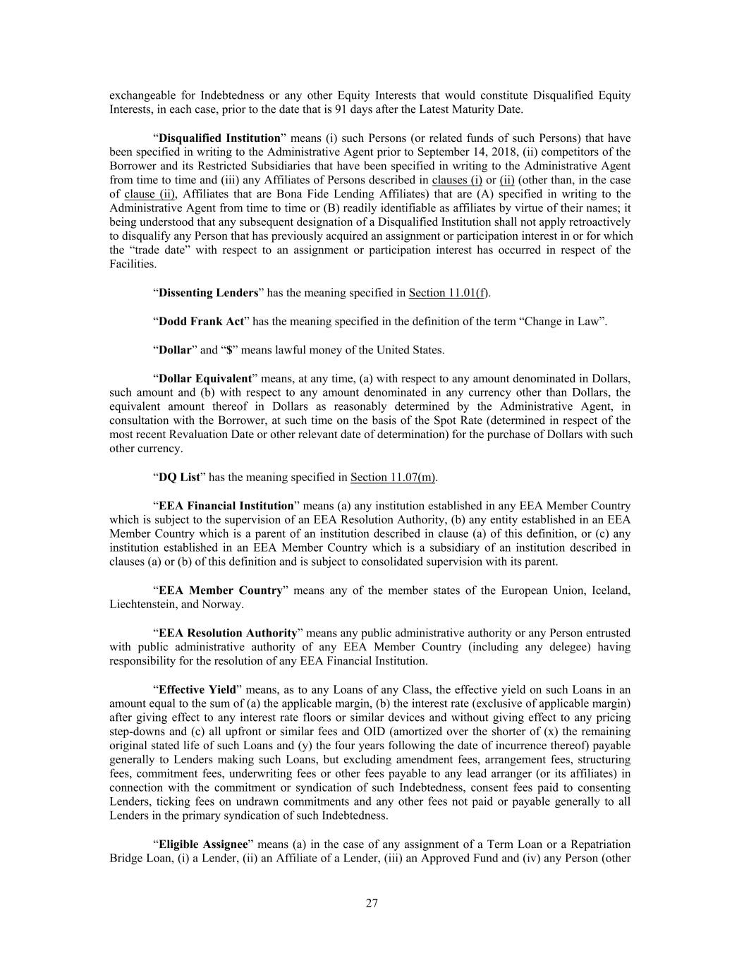 exchangeable for Indebtedness or any other Equity Interests that would constitute Disqualified Equity Interests, in each case, prior to the date that is 91 days after the Latest Maturity Date. “Disqualified Institution” means (i) such Persons (or related funds of such Persons) that have been specified in writing to the Administrative Agent prior to September 14, 2018, (ii) competitors of the Borrower and its Restricted Subsidiaries that have been specified in writing to the Administrative Agent from time to time and (iii) any Affiliates of Persons described in clauses (i) or (ii) (other than, in the case of clause (ii), Affiliates that are Bona Fide Lending Affiliates) that are (A) specified in writing to the Administrative Agent from time to time or (B) readily identifiable as affiliates by virtue of their names; it being understood that any subsequent designation of a Disqualified Institution shall not apply retroactively to disqualify any Person that has previously acquired an assignment or participation interest in or for which the “trade date” with respect to an assignment or participation interest has occurred in respect of the Facilities. “Dissenting Lenders” has the meaning specified in Section 11.01(f). “Dodd Frank Act” has the meaning specified in the definition of the term “Change in Law”. “Dollar” and “$” means lawful money of the United States. “Dollar Equivalent” means, at any time, (a) with respect to any amount denominated in Dollars, such amount and (b) with respect to any amount denominated in any currency other than Dollars, the equivalent amount thereof in Dollars as reasonably determined by the Administrative Agent, in consultation with the Borrower, at such time on the basis of the Spot Rate (determined in respect of the most recent Revaluation Date or other relevant date of determination) for the purchase of Dollars with such other currency. “DQ List” has the meaning specified in Section 11.07(m). “EEA Financial Institution” means (a) any institution established in any EEA Member Country which is subject to the supervision of an EEA Resolution Authority, (b) any entity established in an EEA Member Country which is a parent of an institution described in clause (a) of this definition, or (c) any institution established in an EEA Member Country which is a subsidiary of an institution described in clauses (a) or (b) of this definition and is subject to consolidated supervision with its parent. “EEA Member Country” means any of the member states of the European Union, Iceland, Liechtenstein, and Norway. “EEA Resolution Authority” means any public administrative authority or any Person entrusted with public administrative authority of any EEA Member Country (including any delegee) having responsibility for the resolution of any EEA Financial Institution. “Effective Yield” means, as to any Loans of any Class, the effective yield on such Loans in an amount equal to the sum of (a) the applicable margin, (b) the interest rate (exclusive of applicable margin) after giving effect to any interest rate floors or similar devices and without giving effect to any pricing step-downs and (c) all upfront or similar fees and OID (amortized over the shorter of (x) the remaining original stated life of such Loans and (y) the four years following the date of incurrence thereof) payable generally to Lenders making such Loans, but excluding amendment fees, arrangement fees, structuring fees, commitment fees, underwriting fees or other fees payable to any lead arranger (or its affiliates) in connection with the commitment or syndication of such Indebtedness, consent fees paid to consenting Lenders, ticking fees on undrawn commitments and any other fees not paid or payable generally to all Lenders in the primary syndication of such Indebtedness. “Eligible Assignee” means (a) in the case of any assignment of a Term Loan or a Repatriation Bridge Loan, (i) a Lender, (ii) an Affiliate of a Lender, (iii) an Approved Fund and (iv) any Person (other 27