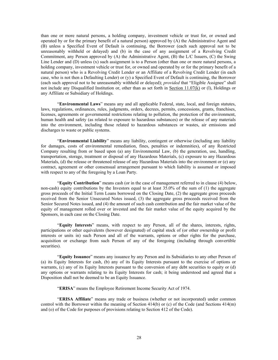 than one or more natural persons, a holding company, investment vehicle or trust for, or owned and operated by or for the primary benefit of a natural person) approved by (A) the Administrative Agent and (B) unless a Specified Event of Default is continuing, the Borrower (each such approval not to be unreasonably withheld or delayed) and (b) in the case of any assignment of a Revolving Credit Commitment, any Person approved by (A) the Administrative Agent, (B) the L/C Issuers, (C) the Swing Line Lender and (D) unless (x) such assignment is to a Person (other than one or more natural persons, a holding company, investment vehicle or trust for, or owned and operated by or for the primary benefit of a natural person) who is a Revolving Credit Lender or an Affiliate of a Revolving Credit Lender (in each case, who is not then a Defaulting Lender) or (y) a Specified Event of Default is continuing, the Borrower (each such approval not to be unreasonably withheld or delayed); provided that “Eligible Assignee” shall not include any Disqualified Institution or, other than as set forth in Section 11.07(k) or (l), Holdings or any Affiliate or Subsidiary of Holdings. “Environmental Laws” means any and all applicable Federal, state, local, and foreign statutes, laws, regulations, ordinances, rules, judgments, orders, decrees, permits, concessions, grants, franchises, licenses, agreements or governmental restrictions relating to pollution, the protection of the environment, human health and safety (as related to exposure to hazardous substances) or the release of any materials into the environment, including those related to hazardous substances or wastes, air emissions and discharges to waste or public systems. “Environmental Liability” means any liability, contingent or otherwise (including any liability for damages, costs of environmental remediation, fines, penalties or indemnities), of any Restricted Company resulting from or based upon (a) any Environmental Law, (b) the generation, use, handling, transportation, storage, treatment or disposal of any Hazardous Materials, (c) exposure to any Hazardous Materials, (d) the release or threatened release of any Hazardous Materials into the environment or (e) any contract, agreement or other consensual arrangement pursuant to which liability is assumed or imposed with respect to any of the foregoing by a Loan Party. “Equity Contribution” means cash (or in the case of management referred to in clause (4) below, non-cash) equity contributions by the Investors equal to at least 35.0% of the sum of (1) the aggregate gross proceeds of the Initial Term Loans borrowed on the Closing Date, (2) the aggregate gross proceeds received from the Senior Unsecured Notes issued, (3) the aggregate gross proceeds received from the Senior Secured Notes issued, and (4) the amount of such cash contribution and the fair market value of the equity of management rolled over or invested and the fair market value of the equity acquired by the Sponsors, in each case on the Closing Date. “Equity Interests” means, with respect to any Person, all of the shares, interests, rights, participations or other equivalents (however designated) of capital stock of (or other ownership or profit interests or units in) such Person and all of the warrants, options or other rights for the purchase, acquisition or exchange from such Person of any of the foregoing (including through convertible securities). “Equity Issuance” means any issuance by any Person and its Subsidiaries to any other Person of (a) its Equity Interests for cash, (b) any of its Equity Interests pursuant to the exercise of options or warrants, (c) any of its Equity Interests pursuant to the conversion of any debt securities to equity or (d) any options or warrants relating to its Equity Interests for cash; it being understood and agreed that a Disposition shall not be deemed to be an Equity Issuance. “ERISA” means the Employee Retirement Income Security Act of 1974. “ERISA Affiliate” means any trade or business (whether or not incorporated) under common control with the Borrower within the meaning of Section 414(b) or (c) of the Code (and Sections 414(m) and (o) of the Code for purposes of provisions relating to Section 412 of the Code). 28