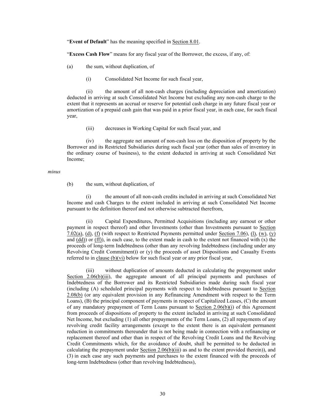 “Event of Default” has the meaning specified in Section 8.01. “Excess Cash Flow” means for any fiscal year of the Borrower, the excess, if any, of: (a) the sum, without duplication, of (i) Consolidated Net Income for such fiscal year, (ii) the amount of all non-cash charges (including depreciation and amortization) deducted in arriving at such Consolidated Net Income but excluding any non-cash charge to the extent that it represents an accrual or reserve for potential cash charge in any future fiscal year or amortization of a prepaid cash gain that was paid in a prior fiscal year, in each case, for such fiscal year, (iii) decreases in Working Capital for such fiscal year, and (iv) the aggregate net amount of non-cash loss on the disposition of property by the Borrower and its Restricted Subsidiaries during such fiscal year (other than sales of inventory in the ordinary course of business), to the extent deducted in arriving at such Consolidated Net Income; minus (b) the sum, without duplication, of (i) the amount of all non-cash credits included in arriving at such Consolidated Net Income and cash Charges to the extent included in arriving at such Consolidated Net Income pursuant to the definition thereof and not otherwise subtracted therefrom, (ii) Capital Expenditures, Permitted Acquisitions (including any earnout or other payment in respect thereof) and other Investments (other than Investments pursuant to Section 7.02(a), (d), (f) (with respect to Restricted Payments permitted under Section 7.06), (l), (w), (y) and (dd)) or (ff)), in each case, to the extent made in cash to the extent not financed with (x) the proceeds of long-term Indebtedness (other than any revolving Indebtedness (including under any Revolving Credit Commitment)) or (y) the proceeds of asset Dispositions and Casualty Events referred to in clause (b)(vi) below for such fiscal year or any prior fiscal year, (iii) without duplication of amounts deducted in calculating the prepayment under Section 2.06(b)(iii), the aggregate amount of all principal payments and purchases of Indebtedness of the Borrower and its Restricted Subsidiaries made during such fiscal year (including (A) scheduled principal payments with respect to Indebtedness pursuant to Section 2.08(b) (or any equivalent provision in any Refinancing Amendment with respect to the Term Loans), (B) the principal component of payments in respect of Capitalized Leases, (C) the amount of any mandatory prepayment of Term Loans pursuant to Section 2.06(b)(i) of this Agreement from proceeds of dispositions of property to the extent included in arriving at such Consolidated Net Income, but excluding (1) all other prepayments of the Term Loans, (2) all repayments of any revolving credit facility arrangements (except to the extent there is an equivalent permanent reduction in commitments thereunder that is not being made in connection with a refinancing or replacement thereof and other than in respect of the Revolving Credit Loans and the Revolving Credit Commitments which, for the avoidance of doubt, shall be permitted to be deducted in calculating the prepayment under Section 2.06(b)(iii) as and to the extent provided therein)), and (3) in each case any such payments and purchases to the extent financed with the proceeds of long-term Indebtedness (other than revolving Indebtedness), 30