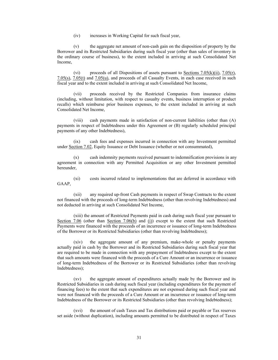 (iv) increases in Working Capital for such fiscal year, (v) the aggregate net amount of non-cash gain on the disposition of property by the Borrower and its Restricted Subsidiaries during such fiscal year (other than sales of inventory in the ordinary course of business), to the extent included in arriving at such Consolidated Net Income, (vi) proceeds of all Dispositions of assets pursuant to Sections 7.05(k)(ii), 7.05(r), 7.05(s), 7.05(t) and 7.05(u), and proceeds of all Casualty Events, in each case received in such fiscal year and to the extent included in arriving at such Consolidated Net Income, (vii) proceeds received by the Restricted Companies from insurance claims (including, without limitation, with respect to casualty events, business interruption or product recalls) which reimburse prior business expenses, to the extent included in arriving at such Consolidated Net Income, (viii) cash payments made in satisfaction of non-current liabilities (other than (A) payments in respect of Indebtedness under this Agreement or (B) regularly scheduled principal payments of any other Indebtedness), (ix) cash fees and expenses incurred in connection with any Investment permitted under Section 7.02, Equity Issuance or Debt Issuance (whether or not consummated), (x) cash indemnity payments received pursuant to indemnification provisions in any agreement in connection with any Permitted Acquisition or any other Investment permitted hereunder, (xi) costs incurred related to implementations that are deferred in accordance with GAAP, (xii) any required up-front Cash payments in respect of Swap Contracts to the extent not financed with the proceeds of long-term Indebtedness (other than revolving Indebtedness) and not deducted in arriving at such Consolidated Net Income, (xiii) the amount of Restricted Payments paid in cash during such fiscal year pursuant to Section 7.06 (other than Section 7.06(b) and (i)) except to the extent that such Restricted Payments were financed with the proceeds of an incurrence or issuance of long-term Indebtedness of the Borrower or its Restricted Subsidiaries (other than revolving Indebtedness); (xiv) the aggregate amount of any premium, make-whole or penalty payments actually paid in cash by the Borrower and its Restricted Subsidiaries during such fiscal year that are required to be made in connection with any prepayment of Indebtedness except to the extent that such amounts were financed with the proceeds of a Cure Amount or an incurrence or issuance of long-term Indebtedness of the Borrower or its Restricted Subsidiaries (other than revolving Indebtedness); (xv) the aggregate amount of expenditures actually made by the Borrower and its Restricted Subsidiaries in cash during such fiscal year (including expenditures for the payment of financing fees) to the extent that such expenditures are not expensed during such fiscal year and were not financed with the proceeds of a Cure Amount or an incurrence or issuance of long-term Indebtedness of the Borrower or its Restricted Subsidiaries (other than revolving Indebtedness); (xvi) the amount of cash Taxes and Tax distributions paid or payable or Tax reserves set aside (without duplication), including amounts permitted to be distributed in respect of Taxes 31