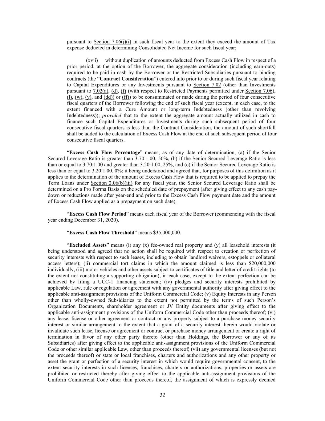 pursuant to Section 7.06(j)(i) in such fiscal year to the extent they exceed the amount of Tax expense deducted in determining Consolidated Net Income for such fiscal year; (xvii) without duplication of amounts deducted from Excess Cash Flow in respect of a prior period, at the option of the Borrower, the aggregate consideration (including earn-outs) required to be paid in cash by the Borrower or the Restricted Subsidiaries pursuant to binding contracts (the “Contract Consideration”) entered into prior to or during such fiscal year relating to Capital Expenditures or any Investments pursuant to Section 7.02 (other than Investments pursuant to 7.02(a), (d), (f) (with respect to Restricted Payments permitted under Section 7.06), (l), (w), (y), and (dd)) or (ff)) to be consummated or made during the period of four consecutive fiscal quarters of the Borrower following the end of such fiscal year (except, in each case, to the extent financed with a Cure Amount or long-term Indebtedness (other than revolving Indebtedness)); provided that to the extent the aggregate amount actually utilized in cash to finance such Capital Expenditures or Investments during such subsequent period of four consecutive fiscal quarters is less than the Contract Consideration, the amount of such shortfall shall be added to the calculation of Excess Cash Flow at the end of such subsequent period of four consecutive fiscal quarters. “Excess Cash Flow Percentage” means, as of any date of determination, (a) if the Senior Secured Leverage Ratio is greater than 3.70:1.00, 50%, (b) if the Senior Secured Leverage Ratio is less than or equal to 3.70:1.00 and greater than 3.20:1.00, 25%, and (c) if the Senior Secured Leverage Ratio is less than or equal to 3.20:1.00, 0%; it being understood and agreed that, for purposes of this definition as it applies to the determination of the amount of Excess Cash Flow that is required to be applied to prepay the Term Loans under Section 2.06(b)(iii) for any fiscal year, the Senior Secured Leverage Ratio shall be determined on a Pro Forma Basis on the scheduled date of prepayment (after giving effect to any cash pay- down or reductions made after year-end and prior to the Excess Cash Flow payment date and the amount of Excess Cash Flow applied as a prepayment on such date). “Excess Cash Flow Period” means each fiscal year of the Borrower (commencing with the fiscal year ending December 31, 2020). “Excess Cash Flow Threshold” means $35,000,000. “Excluded Assets” means (i) any (x) fee-owned real property and (y) all leasehold interests (it being understood and agreed that no action shall be required with respect to creation or perfection of security interests with respect to such leases, including to obtain landlord waivers, estoppels or collateral access letters); (ii) commercial tort claims in which the amount claimed is less than $20,000,000 individually, (iii) motor vehicles and other assets subject to certificates of title and letter of credit rights (to the extent not constituting a supporting obligation), in each case, except to the extent perfection can be achieved by filing a UCC-1 financing statement; (iv) pledges and security interests prohibited by applicable Law, rule or regulation or agreement with any governmental authority after giving effect to the applicable anti-assignment provisions of the Uniform Commercial Code; (v) Equity Interests in any Person other than wholly-owned Subsidiaries to the extent not permitted by the terms of such Person’s Organization Documents, shareholder agreement or JV Entity documents after giving effect to the applicable anti-assignment provisions of the Uniform Commercial Code other than proceeds thereof; (vi) any lease, license or other agreement or contract or any property subject to a purchase money security interest or similar arrangement to the extent that a grant of a security interest therein would violate or invalidate such lease, license or agreement or contract or purchase money arrangement or create a right of termination in favor of any other party thereto (other than Holdings, the Borrower or any of its Subsidiaries) after giving effect to the applicable anti-assignment provisions of the Uniform Commercial Code or other similar applicable Law, other than proceeds thereof; (vii) any governmental licenses (but not the proceeds thereof) or state or local franchises, charters and authorizations and any other property or asset the grant or perfection of a security interest in which would require governmental consent, to the extent security interests in such licenses, franchises, charters or authorizations, properties or assets are prohibited or restricted thereby after giving effect to the applicable anti-assignment provisions of the Uniform Commercial Code other than proceeds thereof, the assignment of which is expressly deemed 32