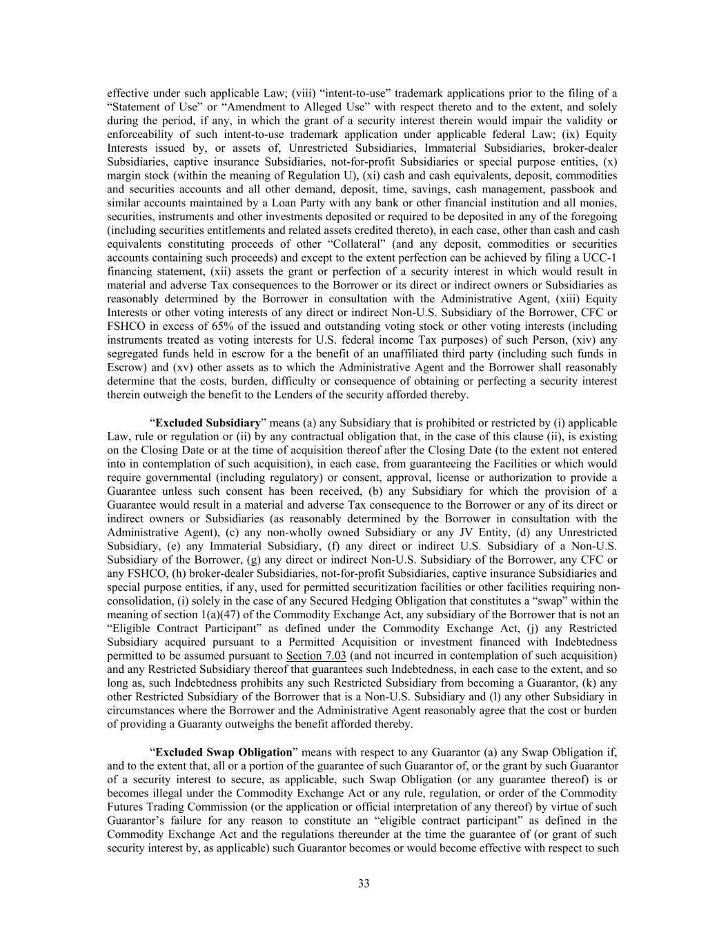 effective under such applicable Law; (viii) “intent-to-use” trademark applications prior to the filing of a “Statement of Use” or “Amendment to Alleged Use” with respect thereto and to the extent, and solely during the period, if any, in which the grant of a security interest therein would impair the validity or enforceability of such intent-to-use trademark application under applicable federal Law; (ix) Equity Interests issued by, or assets of, Unrestricted Subsidiaries, Immaterial Subsidiaries, broker-dealer Subsidiaries, captive insurance Subsidiaries, not-for-profit Subsidiaries or special purpose entities, (x) margin stock (within the meaning of Regulation U), (xi) cash and cash equivalents, deposit, commodities and securities accounts and all other demand, deposit, time, savings, cash management, passbook and similar accounts maintained by a Loan Party with any bank or other financial institution and all monies, securities, instruments and other investments deposited or required to be deposited in any of the foregoing (including securities entitlements and related assets credited thereto), in each case, other than cash and cash equivalents constituting proceeds of other “Collateral” (and any deposit, commodities or securities accounts containing such proceeds) and except to the extent perfection can be achieved by filing a UCC-1 financing statement, (xii) assets the grant or perfection of a security interest in which would result in material and adverse Tax consequences to the Borrower or its direct or indirect owners or Subsidiaries as reasonably determined by the Borrower in consultation with the Administrative Agent, (xiii) Equity Interests or other voting interests of any direct or indirect Non-U.S. Subsidiary of the Borrower, CFC or FSHCO in excess of 65% of the issued and outstanding voting stock or other voting interests (including instruments treated as voting interests for U.S. federal income Tax purposes) of such Person, (xiv) any segregated funds held in escrow for a the benefit of an unaffiliated third party (including such funds in Escrow) and (xv) other assets as to which the Administrative Agent and the Borrower shall reasonably determine that the costs, burden, difficulty or consequence of obtaining or perfecting a security interest therein outweigh the benefit to the Lenders of the security afforded thereby. “Excluded Subsidiary” means (a) any Subsidiary that is prohibited or restricted by (i) applicable Law, rule or regulation or (ii) by any contractual obligation that, in the case of this clause (ii), is existing on the Closing Date or at the time of acquisition thereof after the Closing Date (to the extent not entered into in contemplation of such acquisition), in each case, from guaranteeing the Facilities or which would require governmental (including regulatory) or consent, approval, license or authorization to provide a Guarantee unless such consent has been received, (b) any Subsidiary for which the provision of a Guarantee would result in a material and adverse Tax consequence to the Borrower or any of its direct or indirect owners or Subsidiaries (as reasonably determined by the Borrower in consultation with the Administrative Agent), (c) any non-wholly owned Subsidiary or any JV Entity, (d) any Unrestricted Subsidiary, (e) any Immaterial Subsidiary, (f) any direct or indirect U.S. Subsidiary of a Non-U.S. Subsidiary of the Borrower, (g) any direct or indirect Non-U.S. Subsidiary of the Borrower, any CFC or any FSHCO, (h) broker-dealer Subsidiaries, not-for-profit Subsidiaries, captive insurance Subsidiaries and special purpose entities, if any, used for permitted securitization facilities or other facilities requiring non- consolidation, (i) solely in the case of any Secured Hedging Obligation that constitutes a “swap” within the meaning of section 1(a)(47) of the Commodity Exchange Act, any subsidiary of the Borrower that is not an “Eligible Contract Participant” as defined under the Commodity Exchange Act, (j) any Restricted Subsidiary acquired pursuant to a Permitted Acquisition or investment financed with Indebtedness permitted to be assumed pursuant to Section 7.03 (and not incurred in contemplation of such acquisition) and any Restricted Subsidiary thereof that guarantees such Indebtedness, in each case to the extent, and so long as, such Indebtedness prohibits any such Restricted Subsidiary from becoming a Guarantor, (k) any other Restricted Subsidiary of the Borrower that is a Non-U.S. Subsidiary and (l) any other Subsidiary in circumstances where the Borrower and the Administrative Agent reasonably agree that the cost or burden of providing a Guaranty outweighs the benefit afforded thereby. “Excluded Swap Obligation” means with respect to any Guarantor (a) any Swap Obligation if, and to the extent that, all or a portion of the guarantee of such Guarantor of, or the grant by such Guarantor of a security interest to secure, as applicable, such Swap Obligation (or any guarantee thereof) is or becomes illegal under the Commodity Exchange Act or any rule, regulation, or order of the Commodity Futures Trading Commission (or the application or official interpretation of any thereof) by virtue of such Guarantor’s failure for any reason to constitute an “eligible contract participant” as defined in the Commodity Exchange Act and the regulations thereunder at the time the guarantee of (or grant of such security interest by, as applicable) such Guarantor becomes or would become effective with respect to such 33