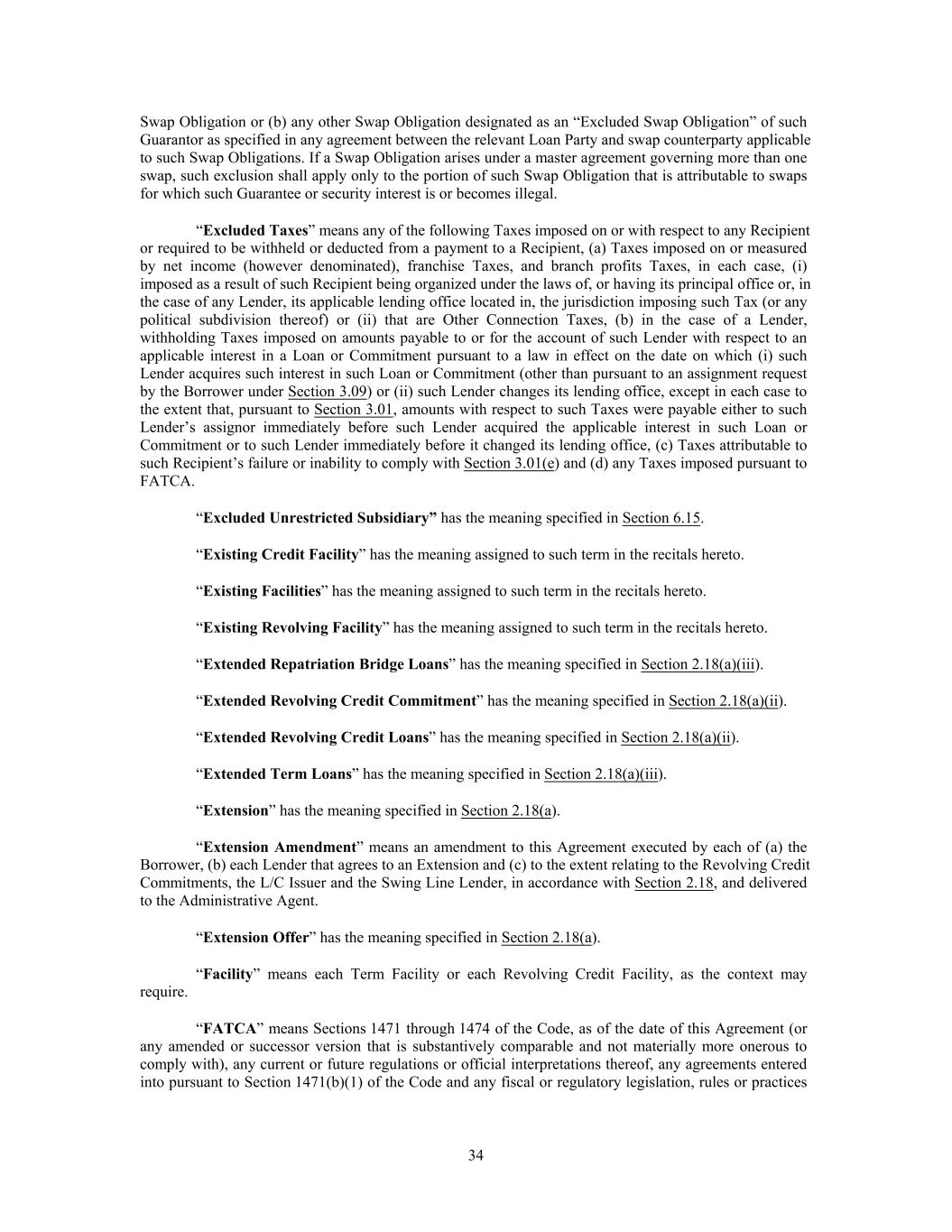 Swap Obligation or (b) any other Swap Obligation designated as an “Excluded Swap Obligation” of such Guarantor as specified in any agreement between the relevant Loan Party and swap counterparty applicable to such Swap Obligations. If a Swap Obligation arises under a master agreement governing more than one swap, such exclusion shall apply only to the portion of such Swap Obligation that is attributable to swaps for which such Guarantee or security interest is or becomes illegal. “Excluded Taxes” means any of the following Taxes imposed on or with respect to any Recipient or required to be withheld or deducted from a payment to a Recipient, (a) Taxes imposed on or measured by net income (however denominated), franchise Taxes, and branch profits Taxes, in each case, (i) imposed as a result of such Recipient being organized under the laws of, or having its principal office or, in the case of any Lender, its applicable lending office located in, the jurisdiction imposing such Tax (or any political subdivision thereof) or (ii) that are Other Connection Taxes, (b) in the case of a Lender, withholding Taxes imposed on amounts payable to or for the account of such Lender with respect to an applicable interest in a Loan or Commitment pursuant to a law in effect on the date on which (i) such Lender acquires such interest in such Loan or Commitment (other than pursuant to an assignment request by the Borrower under Section 3.09) or (ii) such Lender changes its lending office, except in each case to the extent that, pursuant to Section 3.01, amounts with respect to such Taxes were payable either to such Lender’s assignor immediately before such Lender acquired the applicable interest in such Loan or Commitment or to such Lender immediately before it changed its lending office, (c) Taxes attributable to such Recipient’s failure or inability to comply with Section 3.01(e) and (d) any Taxes imposed pursuant to FATCA. “Excluded Unrestricted Subsidiary” has the meaning specified in Section 6.15. “Existing Credit Facility” has the meaning assigned to such term in the recitals hereto. “Existing Facilities” has the meaning assigned to such term in the recitals hereto. “Existing Revolving Facility” has the meaning assigned to such term in the recitals hereto. “Extended Repatriation Bridge Loans” has the meaning specified in Section 2.18(a)(iii). “Extended Revolving Credit Commitment” has the meaning specified in Section 2.18(a)(ii). “Extended Revolving Credit Loans” has the meaning specified in Section 2.18(a)(ii). “Extended Term Loans” has the meaning specified in Section 2.18(a)(iii). “Extension” has the meaning specified in Section 2.18(a). “Extension Amendment” means an amendment to this Agreement executed by each of (a) the Borrower, (b) each Lender that agrees to an Extension and (c) to the extent relating to the Revolving Credit Commitments, the L/C Issuer and the Swing Line Lender, in accordance with Section 2.18, and delivered to the Administrative Agent. “Extension Offer” has the meaning specified in Section 2.18(a). “Facility” means each Term Facility or each Revolving Credit Facility, as the context may require. “FATCA” means Sections 1471 through 1474 of the Code, as of the date of this Agreement (or any amended or successor version that is substantively comparable and not materially more onerous to comply with), any current or future regulations or official interpretations thereof, any agreements entered into pursuant to Section 1471(b)(1) of the Code and any fiscal or regulatory legislation, rules or practices 34