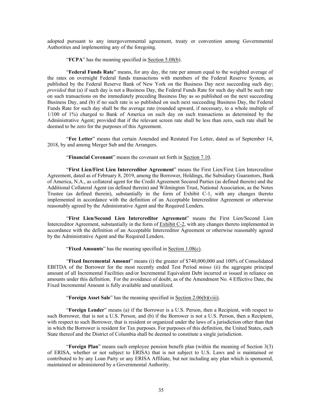 adopted pursuant to any intergovernmental agreement, treaty or convention among Governmental Authorities and implementing any of the foregoing. “FCPA” has the meaning specified in Section 5.08(b). “Federal Funds Rate” means, for any day, the rate per annum equal to the weighted average of the rates on overnight Federal funds transactions with members of the Federal Reserve System, as published by the Federal Reserve Bank of New York on the Business Day next succeeding such day; provided that (a) if such day is not a Business Day, the Federal Funds Rate for such day shall be such rate on such transactions on the immediately preceding Business Day as so published on the next succeeding Business Day, and (b) if no such rate is so published on such next succeeding Business Day, the Federal Funds Rate for such day shall be the average rate (rounded upward, if necessary, to a whole multiple of 1/100 of 1%) charged to Bank of America on such day on such transactions as determined by the Administrative Agent; provided that if the relevant screen rate shall be less than zero, such rate shall be deemed to be zero for the purposes of this Agreement. “Fee Letter” means that certain Amended and Restated Fee Letter, dated as of September 14, 2018, by and among Merger Sub and the Arrangers. “Financial Covenant” means the covenant set forth in Section 7.10. “First Lien/First Lien Intercreditor Agreement” means the First Lien/First Lien Intercreditor Agreement, dated as of February 8, 2019, among the Borrower, Holdings, the Subsidiary Guarantors, Bank of America, N.A., as collateral agent for the Credit Agreement Secured Parties (as defined therein) and the Additional Collateral Agent (as defined therein) and Wilmington Trust, National Association, as the Notes Trustee (as defined therein), substantially in the form of Exhibit C-1, with any changes thereto implemented in accordance with the definition of an Acceptable Intercreditor Agreement or otherwise reasonably agreed by the Administrative Agent and the Required Lenders. “First Lien/Second Lien Intercreditor Agreement” means the First Lien/Second Lien Intercreditor Agreement, substantially in the form of Exhibit C-2, with any changes thereto implemented in accordance with the definition of an Acceptable Intercreditor Agreement or otherwise reasonably agreed by the Administrative Agent and the Required Lenders. “Fixed Amounts” has the meaning specified in Section 1.08(c). “Fixed Incremental Amount” means (i) the greater of $740,000,000 and 100% of Consolidated EBITDA of the Borrower for the most recently ended Test Period minus (ii) the aggregate principal amount of all Incremental Facilities and/or Incremental Equivalent Debt incurred or issued in reliance on amounts under this definition. For the avoidance of doubt, as of the Amendment No. 4 Effective Date, the Fixed Incremental Amount is fully available and unutilized. “Foreign Asset Sale” has the meaning specified in Section 2.06(b)(viii). “Foreign Lender” means (a) if the Borrower is a U.S. Person, then a Recipient, with respect to such Borrower, that is not a U.S. Person, and (b) if the Borrower is not a U.S. Person, then a Recipient, with respect to such Borrower, that is resident or organized under the laws of a jurisdiction other than that in which the Borrower is resident for Tax purposes. For purposes of this definition, the United States, each State thereof and the District of Columbia shall be deemed to constitute a single jurisdiction. “Foreign Plan” means each employee pension benefit plan (within the meaning of Section 3(3) of ERISA, whether or not subject to ERISA) that is not subject to U.S. Laws and is maintained or contributed to by any Loan Party or any ERISA Affiliate, but not including any plan which is sponsored, maintained or administered by a Governmental Authority. 35