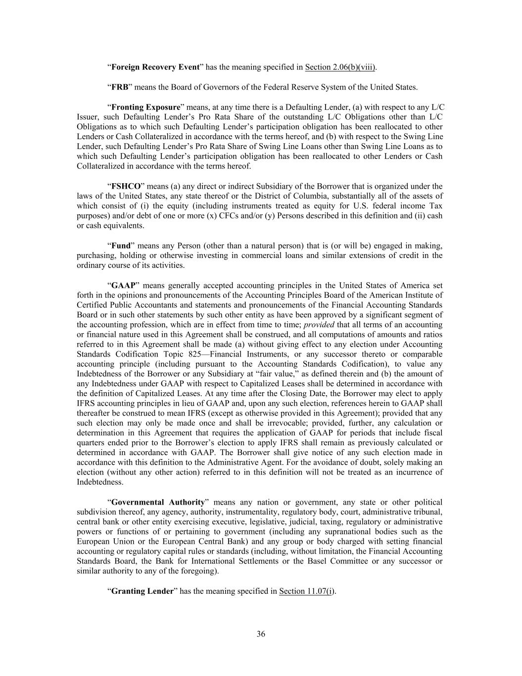“Foreign Recovery Event” has the meaning specified in Section 2.06(b)(viii). “FRB” means the Board of Governors of the Federal Reserve System of the United States. “Fronting Exposure” means, at any time there is a Defaulting Lender, (a) with respect to any L/C Issuer, such Defaulting Lender’s Pro Rata Share of the outstanding L/C Obligations other than L/C Obligations as to which such Defaulting Lender’s participation obligation has been reallocated to other Lenders or Cash Collateralized in accordance with the terms hereof, and (b) with respect to the Swing Line Lender, such Defaulting Lender’s Pro Rata Share of Swing Line Loans other than Swing Line Loans as to which such Defaulting Lender’s participation obligation has been reallocated to other Lenders or Cash Collateralized in accordance with the terms hereof. “FSHCO” means (a) any direct or indirect Subsidiary of the Borrower that is organized under the laws of the United States, any state thereof or the District of Columbia, substantially all of the assets of which consist of (i) the equity (including instruments treated as equity for U.S. federal income Tax purposes) and/or debt of one or more (x) CFCs and/or (y) Persons described in this definition and (ii) cash or cash equivalents. “Fund” means any Person (other than a natural person) that is (or will be) engaged in making, purchasing, holding or otherwise investing in commercial loans and similar extensions of credit in the ordinary course of its activities. “GAAP” means generally accepted accounting principles in the United States of America set forth in the opinions and pronouncements of the Accounting Principles Board of the American Institute of Certified Public Accountants and statements and pronouncements of the Financial Accounting Standards Board or in such other statements by such other entity as have been approved by a significant segment of the accounting profession, which are in effect from time to time; provided that all terms of an accounting or financial nature used in this Agreement shall be construed, and all computations of amounts and ratios referred to in this Agreement shall be made (a) without giving effect to any election under Accounting Standards Codification Topic 825—Financial Instruments, or any successor thereto or comparable accounting principle (including pursuant to the Accounting Standards Codification), to value any Indebtedness of the Borrower or any Subsidiary at “fair value,” as defined therein and (b) the amount of any Indebtedness under GAAP with respect to Capitalized Leases shall be determined in accordance with the definition of Capitalized Leases. At any time after the Closing Date, the Borrower may elect to apply IFRS accounting principles in lieu of GAAP and, upon any such election, references herein to GAAP shall thereafter be construed to mean IFRS (except as otherwise provided in this Agreement); provided that any such election may only be made once and shall be irrevocable; provided, further, any calculation or determination in this Agreement that requires the application of GAAP for periods that include fiscal quarters ended prior to the Borrower’s election to apply IFRS shall remain as previously calculated or determined in accordance with GAAP. The Borrower shall give notice of any such election made in accordance with this definition to the Administrative Agent. For the avoidance of doubt, solely making an election (without any other action) referred to in this definition will not be treated as an incurrence of Indebtedness. “Governmental Authority” means any nation or government, any state or other political subdivision thereof, any agency, authority, instrumentality, regulatory body, court, administrative tribunal, central bank or other entity exercising executive, legislative, judicial, taxing, regulatory or administrative powers or functions of or pertaining to government (including any supranational bodies such as the European Union or the European Central Bank) and any group or body charged with setting financial accounting or regulatory capital rules or standards (including, without limitation, the Financial Accounting Standards Board, the Bank for International Settlements or the Basel Committee or any successor or similar authority to any of the foregoing). “Granting Lender” has the meaning specified in Section 11.07(i). 36