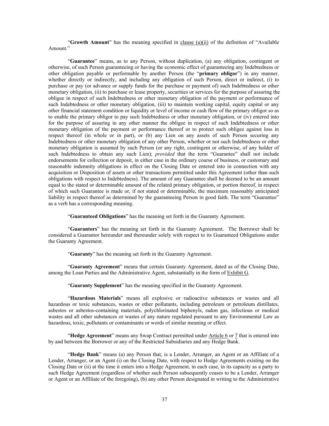 “Growth Amount” has the meaning specified in clause (a)(ii) of the definition of “Available Amount.” “Guarantee” means, as to any Person, without duplication, (a) any obligation, contingent or otherwise, of such Person guaranteeing or having the economic effect of guaranteeing any Indebtedness or other obligation payable or performable by another Person (the “primary obligor”) in any manner, whether directly or indirectly, and including any obligation of such Person, direct or indirect, (i) to purchase or pay (or advance or supply funds for the purchase or payment of) such Indebtedness or other monetary obligation, (ii) to purchase or lease property, securities or services for the purpose of assuring the obligee in respect of such Indebtedness or other monetary obligation of the payment or performance of such Indebtedness or other monetary obligation, (iii) to maintain working capital, equity capital or any other financial statement condition or liquidity or level of income or cash flow of the primary obligor so as to enable the primary obligor to pay such Indebtedness or other monetary obligation, or (iv) entered into for the purpose of assuring in any other manner the obligee in respect of such Indebtedness or other monetary obligation of the payment or performance thereof or to protect such obligee against loss in respect thereof (in whole or in part), or (b) any Lien on any assets of such Person securing any Indebtedness or other monetary obligation of any other Person, whether or not such Indebtedness or other monetary obligation is assumed by such Person (or any right, contingent or otherwise, of any holder of such Indebtedness to obtain any such Lien); provided that the term “Guarantee” shall not include endorsements for collection or deposit, in either case in the ordinary course of business, or customary and reasonable indemnity obligations in effect on the Closing Date or entered into in connection with any acquisition or Disposition of assets or other transactions permitted under this Agreement (other than such obligations with respect to Indebtedness). The amount of any Guarantee shall be deemed to be an amount equal to the stated or determinable amount of the related primary obligation, or portion thereof, in respect of which such Guarantee is made or, if not stated or determinable, the maximum reasonably anticipated liability in respect thereof as determined by the guaranteeing Person in good faith. The term “Guarantee” as a verb has a corresponding meaning. “Guaranteed Obligations” has the meaning set forth in the Guaranty Agreement. “Guarantors” has the meaning set forth in the Guaranty Agreement. The Borrower shall be considered a Guarantor hereunder and thereunder solely with respect to its Guaranteed Obligations under the Guaranty Agreement. “Guaranty” has the meaning set forth in the Guaranty Agreement. “Guaranty Agreement” means that certain Guaranty Agreement, dated as of the Closing Date, among the Loan Parties and the Administrative Agent, substantially in the form of Exhibit G. “Guaranty Supplement” has the meaning specified in the Guaranty Agreement. “Hazardous Materials” means all explosive or radioactive substances or wastes and all hazardous or toxic substances, wastes or other pollutants, including petroleum or petroleum distillates, asbestos or asbestos-containing materials, polychlorinated biphenyls, radon gas, infectious or medical wastes and all other substances or wastes of any nature regulated pursuant to any Environmental Law as hazardous, toxic, pollutants or contaminants or words of similar meaning or effect. “Hedge Agreement” means any Swap Contract permitted under Article 6 or 7 that is entered into by and between the Borrower or any of the Restricted Subsidiaries and any Hedge Bank. “Hedge Bank” means (a) any Person that, is a Lender, Arranger, an Agent or an Affiliate of a Lender, Arranger, or an Agent (i) on the Closing Date, with respect to Hedge Agreements existing on the Closing Date or (ii) at the time it enters into a Hedge Agreement, in each case, in its capacity as a party to such Hedge Agreement (regardless of whether such Person subsequently ceases to be a Lender, Arranger or Agent or an Affiliate of the foregoing), (b) any other Person designated in writing to the Administrative 37