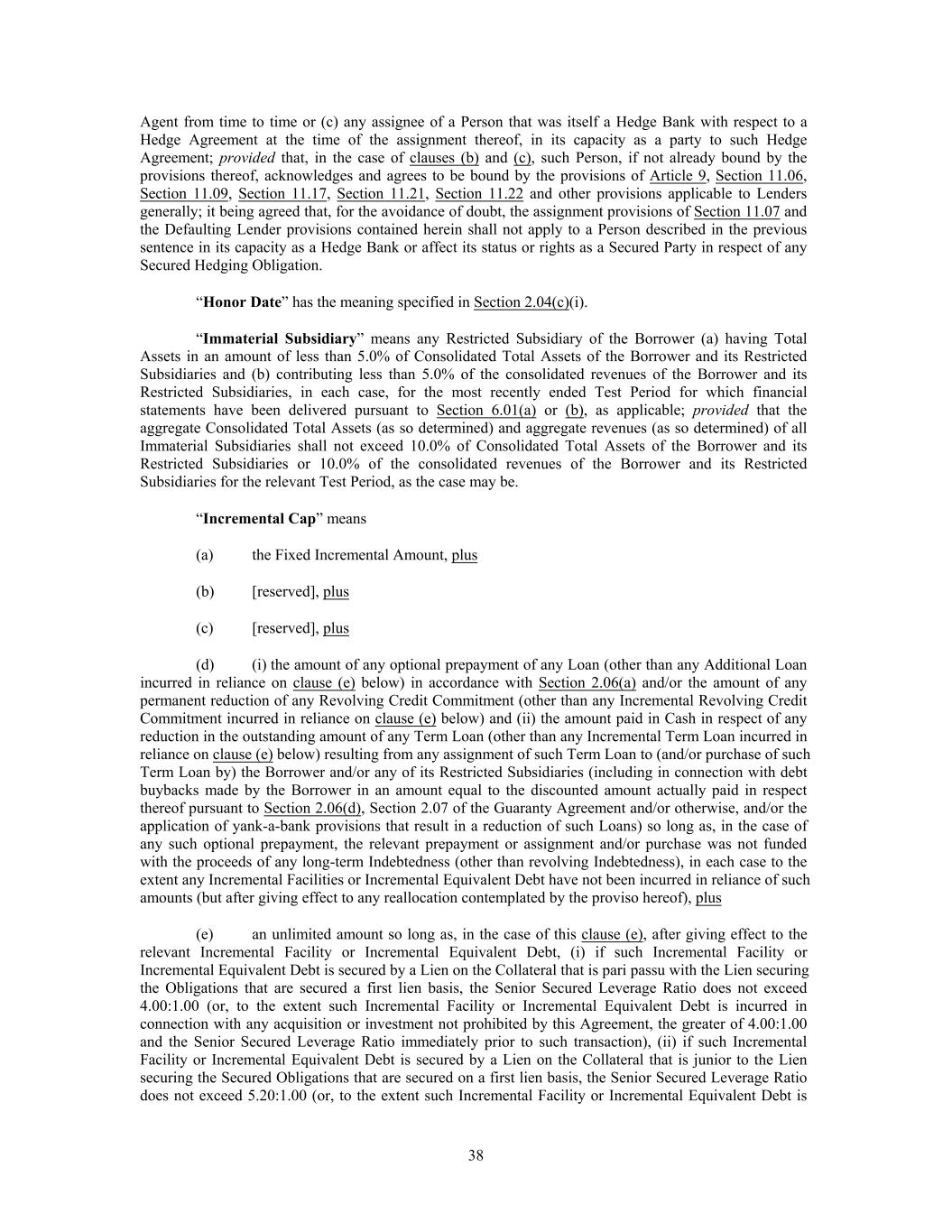 Agent from time to time or (c) any assignee of a Person that was itself a Hedge Bank with respect to a Hedge Agreement at the time of the assignment thereof, in its capacity as a party to such Hedge Agreement; provided that, in the case of clauses (b) and (c), such Person, if not already bound by the provisions thereof, acknowledges and agrees to be bound by the provisions of Article 9, Section 11.06, Section 11.09, Section 11.17, Section 11.21, Section 11.22 and other provisions applicable to Lenders generally; it being agreed that, for the avoidance of doubt, the assignment provisions of Section 11.07 and the Defaulting Lender provisions contained herein shall not apply to a Person described in the previous sentence in its capacity as a Hedge Bank or affect its status or rights as a Secured Party in respect of any Secured Hedging Obligation. “Honor Date” has the meaning specified in Section 2.04(c)(i). “Immaterial Subsidiary” means any Restricted Subsidiary of the Borrower (a) having Total Assets in an amount of less than 5.0% of Consolidated Total Assets of the Borrower and its Restricted Subsidiaries and (b) contributing less than 5.0% of the consolidated revenues of the Borrower and its Restricted Subsidiaries, in each case, for the most recently ended Test Period for which financial statements have been delivered pursuant to Section 6.01(a) or (b), as applicable; provided that the aggregate Consolidated Total Assets (as so determined) and aggregate revenues (as so determined) of all Immaterial Subsidiaries shall not exceed 10.0% of Consolidated Total Assets of the Borrower and its Restricted Subsidiaries or 10.0% of the consolidated revenues of the Borrower and its Restricted Subsidiaries for the relevant Test Period, as the case may be. “Incremental Cap” means (a) the Fixed Incremental Amount, plus (b) [reserved], plus (c) [reserved], plus (d) (i) the amount of any optional prepayment of any Loan (other than any Additional Loan incurred in reliance on clause (e) below) in accordance with Section 2.06(a) and/or the amount of any permanent reduction of any Revolving Credit Commitment (other than any Incremental Revolving Credit Commitment incurred in reliance on clause (e) below) and (ii) the amount paid in Cash in respect of any reduction in the outstanding amount of any Term Loan (other than any Incremental Term Loan incurred in reliance on clause (e) below) resulting from any assignment of such Term Loan to (and/or purchase of such Term Loan by) the Borrower and/or any of its Restricted Subsidiaries (including in connection with debt buybacks made by the Borrower in an amount equal to the discounted amount actually paid in respect thereof pursuant to Section 2.06(d), Section 2.07 of the Guaranty Agreement and/or otherwise, and/or the application of yank-a-bank provisions that result in a reduction of such Loans) so long as, in the case of any such optional prepayment, the relevant prepayment or assignment and/or purchase was not funded with the proceeds of any long-term Indebtedness (other than revolving Indebtedness), in each case to the extent any Incremental Facilities or Incremental Equivalent Debt have not been incurred in reliance of such amounts (but after giving effect to any reallocation contemplated by the proviso hereof), plus (e) an unlimited amount so long as, in the case of this clause (e), after giving effect to the relevant Incremental Facility or Incremental Equivalent Debt, (i) if such Incremental Facility or Incremental Equivalent Debt is secured by a Lien on the Collateral that is pari passu with the Lien securing the Obligations that are secured a first lien basis, the Senior Secured Leverage Ratio does not exceed 4.00:1.00 (or, to the extent such Incremental Facility or Incremental Equivalent Debt is incurred in connection with any acquisition or investment not prohibited by this Agreement, the greater of 4.00:1.00 and the Senior Secured Leverage Ratio immediately prior to such transaction), (ii) if such Incremental Facility or Incremental Equivalent Debt is secured by a Lien on the Collateral that is junior to the Lien securing the Secured Obligations that are secured on a first lien basis, the Senior Secured Leverage Ratio does not exceed 5.20:1.00 (or, to the extent such Incremental Facility or Incremental Equivalent Debt is 38