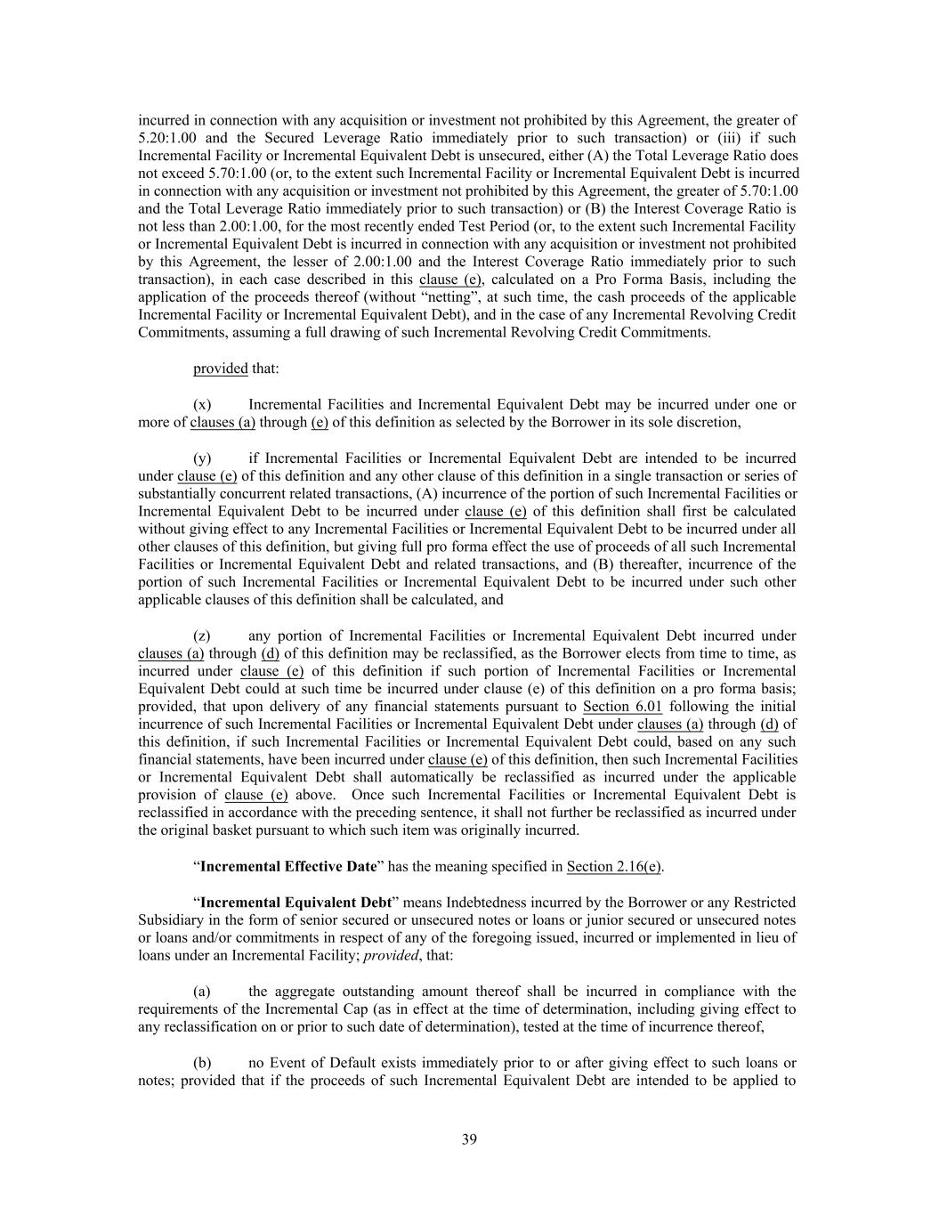 incurred in connection with any acquisition or investment not prohibited by this Agreement, the greater of 5.20:1.00 and the Secured Leverage Ratio immediately prior to such transaction) or (iii) if such Incremental Facility or Incremental Equivalent Debt is unsecured, either (A) the Total Leverage Ratio does not exceed 5.70:1.00 (or, to the extent such Incremental Facility or Incremental Equivalent Debt is incurred in connection with any acquisition or investment not prohibited by this Agreement, the greater of 5.70:1.00 and the Total Leverage Ratio immediately prior to such transaction) or (B) the Interest Coverage Ratio is not less than 2.00:1.00, for the most recently ended Test Period (or, to the extent such Incremental Facility or Incremental Equivalent Debt is incurred in connection with any acquisition or investment not prohibited by this Agreement, the lesser of 2.00:1.00 and the Interest Coverage Ratio immediately prior to such transaction), in each case described in this clause (e), calculated on a Pro Forma Basis, including the application of the proceeds thereof (without “netting”, at such time, the cash proceeds of the applicable Incremental Facility or Incremental Equivalent Debt), and in the case of any Incremental Revolving Credit Commitments, assuming a full drawing of such Incremental Revolving Credit Commitments. provided that: (x) Incremental Facilities and Incremental Equivalent Debt may be incurred under one or more of clauses (a) through (e) of this definition as selected by the Borrower in its sole discretion, (y) if Incremental Facilities or Incremental Equivalent Debt are intended to be incurred under clause (e) of this definition and any other clause of this definition in a single transaction or series of substantially concurrent related transactions, (A) incurrence of the portion of such Incremental Facilities or Incremental Equivalent Debt to be incurred under clause (e) of this definition shall first be calculated without giving effect to any Incremental Facilities or Incremental Equivalent Debt to be incurred under all other clauses of this definition, but giving full pro forma effect the use of proceeds of all such Incremental Facilities or Incremental Equivalent Debt and related transactions, and (B) thereafter, incurrence of the portion of such Incremental Facilities or Incremental Equivalent Debt to be incurred under such other applicable clauses of this definition shall be calculated, and (z) any portion of Incremental Facilities or Incremental Equivalent Debt incurred under clauses (a) through (d) of this definition may be reclassified, as the Borrower elects from time to time, as incurred under clause (e) of this definition if such portion of Incremental Facilities or Incremental Equivalent Debt could at such time be incurred under clause (e) of this definition on a pro forma basis; provided, that upon delivery of any financial statements pursuant to Section 6.01 following the initial incurrence of such Incremental Facilities or Incremental Equivalent Debt under clauses (a) through (d) of this definition, if such Incremental Facilities or Incremental Equivalent Debt could, based on any such financial statements, have been incurred under clause (e) of this definition, then such Incremental Facilities or Incremental Equivalent Debt shall automatically be reclassified as incurred under the applicable provision of clause (e) above. Once such Incremental Facilities or Incremental Equivalent Debt is reclassified in accordance with the preceding sentence, it shall not further be reclassified as incurred under the original basket pursuant to which such item was originally incurred. “Incremental Effective Date” has the meaning specified in Section 2.16(e). “Incremental Equivalent Debt” means Indebtedness incurred by the Borrower or any Restricted Subsidiary in the form of senior secured or unsecured notes or loans or junior secured or unsecured notes or loans and/or commitments in respect of any of the foregoing issued, incurred or implemented in lieu of loans under an Incremental Facility; provided, that: (a) the aggregate outstanding amount thereof shall be incurred in compliance with the requirements of the Incremental Cap (as in effect at the time of determination, including giving effect to any reclassification on or prior to such date of determination), tested at the time of incurrence thereof, (b) no Event of Default exists immediately prior to or after giving effect to such loans or notes; provided that if the proceeds of such Incremental Equivalent Debt are intended to be applied to 39