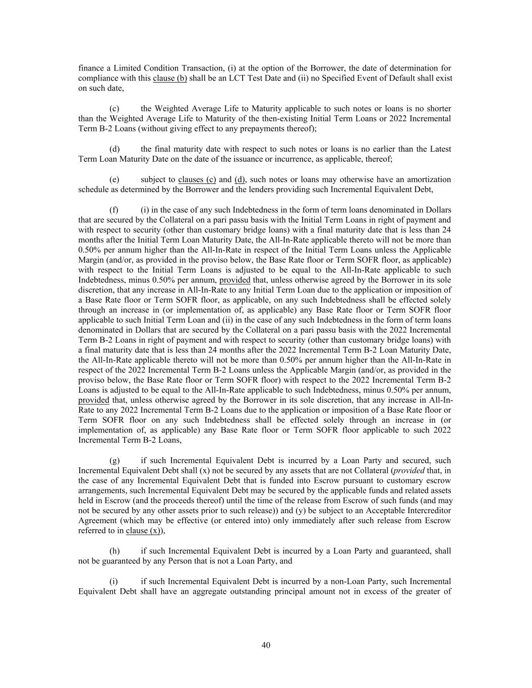 finance a Limited Condition Transaction, (i) at the option of the Borrower, the date of determination for compliance with this clause (b) shall be an LCT Test Date and (ii) no Specified Event of Default shall exist on such date, (c) the Weighted Average Life to Maturity applicable to such notes or loans is no shorter than the Weighted Average Life to Maturity of the then-existing Initial Term Loans or 2022 Incremental Term B-2 Loans (without giving effect to any prepayments thereof); (d) the final maturity date with respect to such notes or loans is no earlier than the Latest Term Loan Maturity Date on the date of the issuance or incurrence, as applicable, thereof; (e) subject to clauses (c) and (d), such notes or loans may otherwise have an amortization schedule as determined by the Borrower and the lenders providing such Incremental Equivalent Debt, (f) (i) in the case of any such Indebtedness in the form of term loans denominated in Dollars that are secured by the Collateral on a pari passu basis with the Initial Term Loans in right of payment and with respect to security (other than customary bridge loans) with a final maturity date that is less than 24 months after the Initial Term Loan Maturity Date, the All-In-Rate applicable thereto will not be more than 0.50% per annum higher than the All-In-Rate in respect of the Initial Term Loans unless the Applicable Margin (and/or, as provided in the proviso below, the Base Rate floor or Term SOFR floor, as applicable) with respect to the Initial Term Loans is adjusted to be equal to the All-In-Rate applicable to such Indebtedness, minus 0.50% per annum, provided that, unless otherwise agreed by the Borrower in its sole discretion, that any increase in All-In-Rate to any Initial Term Loan due to the application or imposition of a Base Rate floor or Term SOFR floor, as applicable, on any such Indebtedness shall be effected solely through an increase in (or implementation of, as applicable) any Base Rate floor or Term SOFR floor applicable to such Initial Term Loan and (ii) in the case of any such Indebtedness in the form of term loans denominated in Dollars that are secured by the Collateral on a pari passu basis with the 2022 Incremental Term B-2 Loans in right of payment and with respect to security (other than customary bridge loans) with a final maturity date that is less than 24 months after the 2022 Incremental Term B-2 Loan Maturity Date, the All-In-Rate applicable thereto will not be more than 0.50% per annum higher than the All-In-Rate in respect of the 2022 Incremental Term B-2 Loans unless the Applicable Margin (and/or, as provided in the proviso below, the Base Rate floor or Term SOFR floor) with respect to the 2022 Incremental Term B-2 Loans is adjusted to be equal to the All-In-Rate applicable to such Indebtedness, minus 0.50% per annum, provided that, unless otherwise agreed by the Borrower in its sole discretion, that any increase in All-In- Rate to any 2022 Incremental Term B-2 Loans due to the application or imposition of a Base Rate floor or Term SOFR floor on any such Indebtedness shall be effected solely through an increase in (or implementation of, as applicable) any Base Rate floor or Term SOFR floor applicable to such 2022 Incremental Term B-2 Loans, (g) if such Incremental Equivalent Debt is incurred by a Loan Party and secured, such Incremental Equivalent Debt shall (x) not be secured by any assets that are not Collateral (provided that, in the case of any Incremental Equivalent Debt that is funded into Escrow pursuant to customary escrow arrangements, such Incremental Equivalent Debt may be secured by the applicable funds and related assets held in Escrow (and the proceeds thereof) until the time of the release from Escrow of such funds (and may not be secured by any other assets prior to such release)) and (y) be subject to an Acceptable Intercreditor Agreement (which may be effective (or entered into) only immediately after such release from Escrow referred to in clause (x)), (h) if such Incremental Equivalent Debt is incurred by a Loan Party and guaranteed, shall not be guaranteed by any Person that is not a Loan Party, and (i) if such Incremental Equivalent Debt is incurred by a non-Loan Party, such Incremental Equivalent Debt shall have an aggregate outstanding principal amount not in excess of the greater of 40