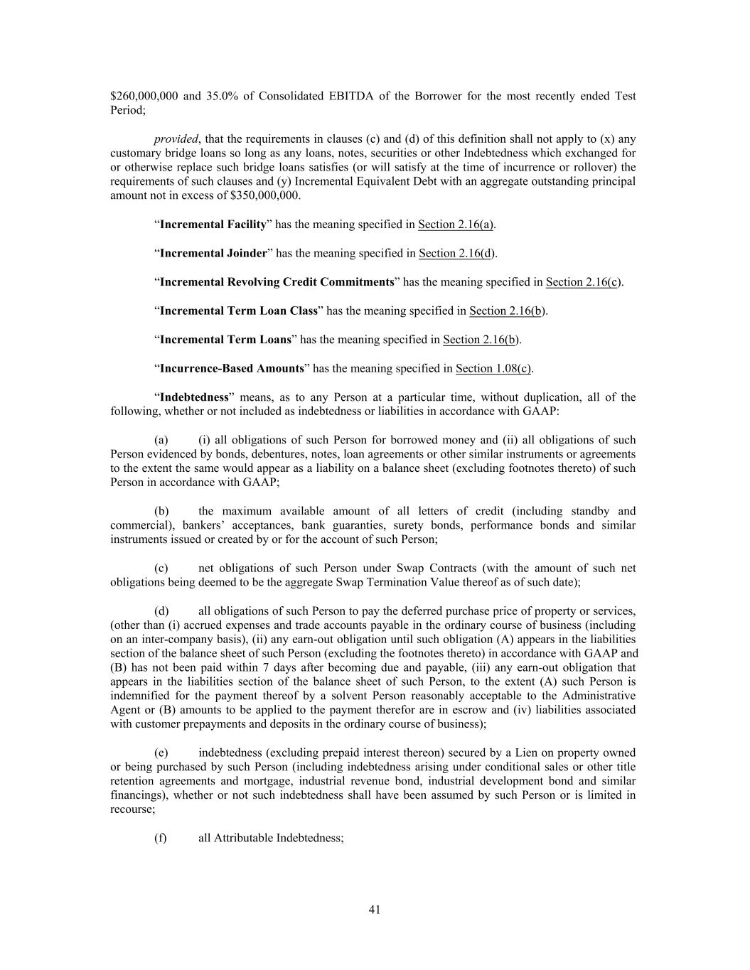 $260,000,000 and 35.0% of Consolidated EBITDA of the Borrower for the most recently ended Test Period; provided, that the requirements in clauses (c) and (d) of this definition shall not apply to (x) any customary bridge loans so long as any loans, notes, securities or other Indebtedness which exchanged for or otherwise replace such bridge loans satisfies (or will satisfy at the time of incurrence or rollover) the requirements of such clauses and (y) Incremental Equivalent Debt with an aggregate outstanding principal amount not in excess of $350,000,000. “Incremental Facility” has the meaning specified in Section 2.16(a). “Incremental Joinder” has the meaning specified in Section 2.16(d). “Incremental Revolving Credit Commitments” has the meaning specified in Section 2.16(c). “Incremental Term Loan Class” has the meaning specified in Section 2.16(b). “Incremental Term Loans” has the meaning specified in Section 2.16(b). “Incurrence-Based Amounts” has the meaning specified in Section 1.08(c). “Indebtedness” means, as to any Person at a particular time, without duplication, all of the following, whether or not included as indebtedness or liabilities in accordance with GAAP: (a) (i) all obligations of such Person for borrowed money and (ii) all obligations of such Person evidenced by bonds, debentures, notes, loan agreements or other similar instruments or agreements to the extent the same would appear as a liability on a balance sheet (excluding footnotes thereto) of such Person in accordance with GAAP; (b) the maximum available amount of all letters of credit (including standby and commercial), bankers’ acceptances, bank guaranties, surety bonds, performance bonds and similar instruments issued or created by or for the account of such Person; (c) net obligations of such Person under Swap Contracts (with the amount of such net obligations being deemed to be the aggregate Swap Termination Value thereof as of such date); (d) all obligations of such Person to pay the deferred purchase price of property or services, (other than (i) accrued expenses and trade accounts payable in the ordinary course of business (including on an inter-company basis), (ii) any earn-out obligation until such obligation (A) appears in the liabilities section of the balance sheet of such Person (excluding the footnotes thereto) in accordance with GAAP and (B) has not been paid within 7 days after becoming due and payable, (iii) any earn-out obligation that appears in the liabilities section of the balance sheet of such Person, to the extent (A) such Person is indemnified for the payment thereof by a solvent Person reasonably acceptable to the Administrative Agent or (B) amounts to be applied to the payment therefor are in escrow and (iv) liabilities associated with customer prepayments and deposits in the ordinary course of business); (e) indebtedness (excluding prepaid interest thereon) secured by a Lien on property owned or being purchased by such Person (including indebtedness arising under conditional sales or other title retention agreements and mortgage, industrial revenue bond, industrial development bond and similar financings), whether or not such indebtedness shall have been assumed by such Person or is limited in recourse; (f) all Attributable Indebtedness; 41