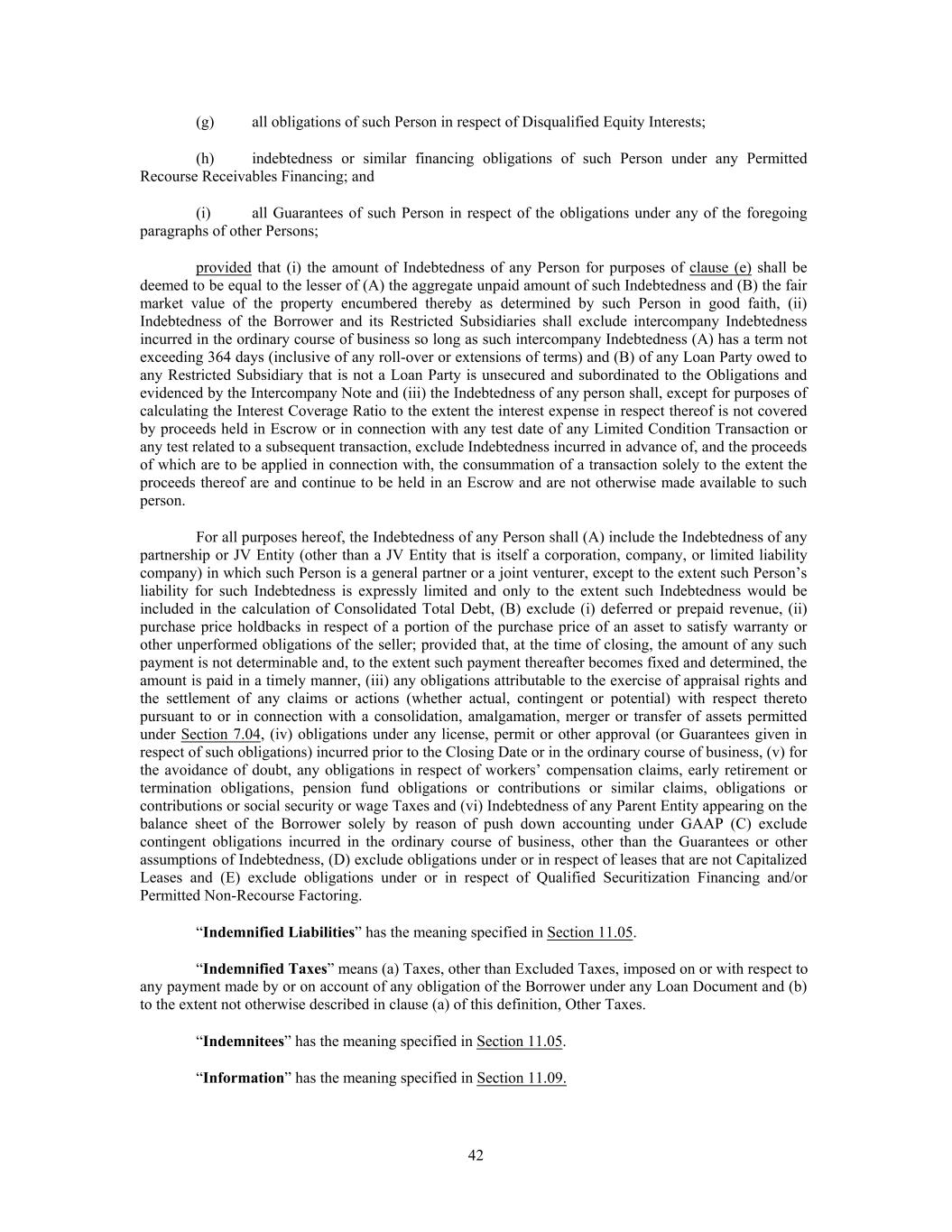(g) all obligations of such Person in respect of Disqualified Equity Interests; (h) indebtedness or similar financing obligations of such Person under any Permitted Recourse Receivables Financing; and (i) all Guarantees of such Person in respect of the obligations under any of the foregoing paragraphs of other Persons; provided that (i) the amount of Indebtedness of any Person for purposes of clause (e) shall be deemed to be equal to the lesser of (A) the aggregate unpaid amount of such Indebtedness and (B) the fair market value of the property encumbered thereby as determined by such Person in good faith, (ii) Indebtedness of the Borrower and its Restricted Subsidiaries shall exclude intercompany Indebtedness incurred in the ordinary course of business so long as such intercompany Indebtedness (A) has a term not exceeding 364 days (inclusive of any roll-over or extensions of terms) and (B) of any Loan Party owed to any Restricted Subsidiary that is not a Loan Party is unsecured and subordinated to the Obligations and evidenced by the Intercompany Note and (iii) the Indebtedness of any person shall, except for purposes of calculating the Interest Coverage Ratio to the extent the interest expense in respect thereof is not covered by proceeds held in Escrow or in connection with any test date of any Limited Condition Transaction or any test related to a subsequent transaction, exclude Indebtedness incurred in advance of, and the proceeds of which are to be applied in connection with, the consummation of a transaction solely to the extent the proceeds thereof are and continue to be held in an Escrow and are not otherwise made available to such person. For all purposes hereof, the Indebtedness of any Person shall (A) include the Indebtedness of any partnership or JV Entity (other than a JV Entity that is itself a corporation, company, or limited liability company) in which such Person is a general partner or a joint venturer, except to the extent such Person’s liability for such Indebtedness is expressly limited and only to the extent such Indebtedness would be included in the calculation of Consolidated Total Debt, (B) exclude (i) deferred or prepaid revenue, (ii) purchase price holdbacks in respect of a portion of the purchase price of an asset to satisfy warranty or other unperformed obligations of the seller; provided that, at the time of closing, the amount of any such payment is not determinable and, to the extent such payment thereafter becomes fixed and determined, the amount is paid in a timely manner, (iii) any obligations attributable to the exercise of appraisal rights and the settlement of any claims or actions (whether actual, contingent or potential) with respect thereto pursuant to or in connection with a consolidation, amalgamation, merger or transfer of assets permitted under Section 7.04, (iv) obligations under any license, permit or other approval (or Guarantees given in respect of such obligations) incurred prior to the Closing Date or in the ordinary course of business, (v) for the avoidance of doubt, any obligations in respect of workers’ compensation claims, early retirement or termination obligations, pension fund obligations or contributions or similar claims, obligations or contributions or social security or wage Taxes and (vi) Indebtedness of any Parent Entity appearing on the balance sheet of the Borrower solely by reason of push down accounting under GAAP (C) exclude contingent obligations incurred in the ordinary course of business, other than the Guarantees or other assumptions of Indebtedness, (D) exclude obligations under or in respect of leases that are not Capitalized Leases and (E) exclude obligations under or in respect of Qualified Securitization Financing and/or Permitted Non-Recourse Factoring. “Indemnified Liabilities” has the meaning specified in Section 11.05. “Indemnified Taxes” means (a) Taxes, other than Excluded Taxes, imposed on or with respect to any payment made by or on account of any obligation of the Borrower under any Loan Document and (b) to the extent not otherwise described in clause (a) of this definition, Other Taxes. “Indemnitees” has the meaning specified in Section 11.05. “Information” has the meaning specified in Section 11.09. 42