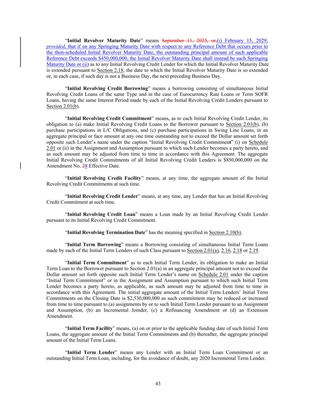 “Initial Revolver Maturity Date” means September 11, 2025, or,(i) February 15, 2029; provided, that if on any Springing Maturity Date with respect to any Reference Debt that occurs prior to the then-scheduled Initial Revolver Maturity Date, the outstanding principal amount of such applicable Reference Debt exceeds $450,000,000, the Initial Revolver Maturity Date shall instead be such Springing Maturity Date or (ii) as to any Initial Revolving Credit Lender for which the Initial Revolver Maturity Date is extended pursuant to Section 2.18, the date to which the Initial Revolver Maturity Date is so extended or, in each case, if such day is not a Business Day, the next preceding Business Day. “Initial Revolving Credit Borrowing” means a borrowing consisting of simultaneous Initial Revolving Credit Loans of the same Type and in the case of Eurocurrency Rate Loans or Term SOFR Loans, having the same Interest Period made by each of the Initial Revolving Credit Lenders pursuant to Section 2.01(b). “Initial Revolving Credit Commitment” means, as to each Initial Revolving Credit Lender, its obligation to (a) make Initial Revolving Credit Loans to the Borrower pursuant to Section 2.01(b), (b) purchase participations in L/C Obligations, and (c) purchase participations in Swing Line Loans, in an aggregate principal or face amount at any one time outstanding not to exceed the Dollar amount set forth opposite such Lender’s name under the caption “Initial Revolving Credit Commitment” (i) on Schedule 2.01 or (ii) in the Assignment and Assumption pursuant to which such Lender becomes a party hereto, and as such amount may be adjusted from time to time in accordance with this Agreement. The aggregate Initial Revolving Credit Commitments of all Initial Revolving Credit Lenders is $850,000,000 on the Amendment No. 28 Effective Date. “Initial Revolving Credit Facility” means, at any time, the aggregate amount of the Initial Revolving Credit Commitments at such time. “Initial Revolving Credit Lender” means, at any time, any Lender that has an Initial Revolving Credit Commitment at such time. “Initial Revolving Credit Loan” means a Loan made by an Initial Revolving Credit Lender pursuant to its Initial Revolving Credit Commitment. “Initial Revolving Termination Date” has the meaning specified in Section 2.10(b). “Initial Term Borrowing” means a Borrowing consisting of simultaneous Initial Term Loans made by each of the Initial Term Lenders of such Class pursuant to Section 2.01(a), 2.16, 2.18 or 2.19. “Initial Term Commitment” as to each Initial Term Lender, its obligation to make an Initial Term Loan to the Borrower pursuant to Section 2.01(a) in an aggregate principal amount not to exceed the Dollar amount set forth opposite such Initial Term Lender’s name on Schedule 2.01 under the caption “Initial Term Commitment” or in the Assignment and Assumption pursuant to which such Initial Term Lender becomes a party hereto, as applicable, as such amount may be adjusted from time to time in accordance with this Agreement. The initial aggregate amount of the Initial Term Lenders’ Initial Term Commitments on the Closing Date is $2,530,000,000 as such commitment may be reduced or increased from time to time pursuant to (a) assignments by or to such Initial Term Lender pursuant to an Assignment and Assumption, (b) an Incremental Joinder, (c) a Refinancing Amendment or (d) an Extension Amendment. “Initial Term Facility” means, (a) on or prior to the applicable funding date of such Initial Term Loans, the aggregate amount of the Initial Term Commitments and (b) thereafter, the aggregate principal amount of the Initial Term Loans. “Initial Term Lender” means any Lender with an Initial Term Loan Commitment or an outstanding Initial Term Loan, including, for the avoidance of doubt, any 2020 Incremental Term Lender. 43