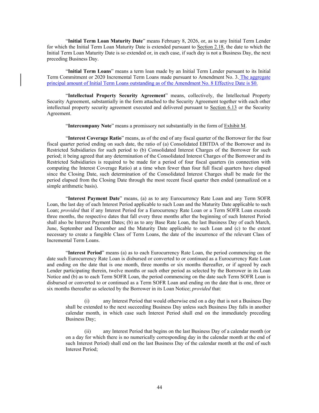 “Initial Term Loan Maturity Date” means February 8, 2026, or, as to any Initial Term Lender for which the Initial Term Loan Maturity Date is extended pursuant to Section 2.18, the date to which the Initial Term Loan Maturity Date is so extended or, in each case, if such day is not a Business Day, the next preceding Business Day. “Initial Term Loans” means a term loan made by an Initial Term Lender pursuant to its Initial Term Commitment or 2020 Incremental Term Loans made pursuant to Amendment No. 3. The aggregate principal amount of Initial Term Loans outstanding as of the Amendment No. 8 Effective Date is $0. “Intellectual Property Security Agreement” means, collectively, the Intellectual Property Security Agreement, substantially in the form attached to the Security Agreement together with each other intellectual property security agreement executed and delivered pursuant to Section 6.13 or the Security Agreement. “Intercompany Note” means a promissory not substantially in the form of Exhibit M. “Interest Coverage Ratio” means, as of the end of any fiscal quarter of the Borrower for the four fiscal quarter period ending on such date, the ratio of (a) Consolidated EBITDA of the Borrower and its Restricted Subsidiaries for such period to (b) Consolidated Interest Charges of the Borrower for such period; it being agreed that any determination of the Consolidated Interest Charges of the Borrower and its Restricted Subsidiaries is required to be made for a period of four fiscal quarters (in connection with computing the Interest Coverage Ratio) at a time when fewer than four full fiscal quarters have elapsed since the Closing Date, such determination of the Consolidated Interest Charges shall be made for the period elapsed from the Closing Date through the most recent fiscal quarter then ended (annualized on a simple arithmetic basis). “Interest Payment Date” means, (a) as to any Eurocurrency Rate Loan and any Term SOFR Loan, the last day of each Interest Period applicable to such Loan and the Maturity Date applicable to such Loan; provided that if any Interest Period for a Eurocurrency Rate Loan or a Term SOFR Loan exceeds three months, the respective dates that fall every three months after the beginning of such Interest Period shall also be Interest Payment Dates; (b) as to any Base Rate Loan, the last Business Day of each March, June, September and December and the Maturity Date applicable to such Loan and (c) to the extent necessary to create a fungible Class of Term Loans, the date of the incurrence of the relevant Class of Incremental Term Loans. “Interest Period” means (a) as to each Eurocurrency Rate Loan, the period commencing on the date such Eurocurrency Rate Loan is disbursed or converted to or continued as a Eurocurrency Rate Loan and ending on the date that is one month, three months or six months thereafter, or if agreed by each Lender participating therein, twelve months or such other period as selected by the Borrower in its Loan Notice and (b) as to each Term SOFR Loan, the period commencing on the date such Term SOFR Loan is disbursed or converted to or continued as a Term SOFR Loan and ending on the date that is one, three or six months thereafter as selected by the Borrower in its Loan Notice; provided that: (i) any Interest Period that would otherwise end on a day that is not a Business Day shall be extended to the next succeeding Business Day unless such Business Day falls in another calendar month, in which case such Interest Period shall end on the immediately preceding Business Day; (ii) any Interest Period that begins on the last Business Day of a calendar month (or on a day for which there is no numerically corresponding day in the calendar month at the end of such Interest Period) shall end on the last Business Day of the calendar month at the end of such Interest Period; 44