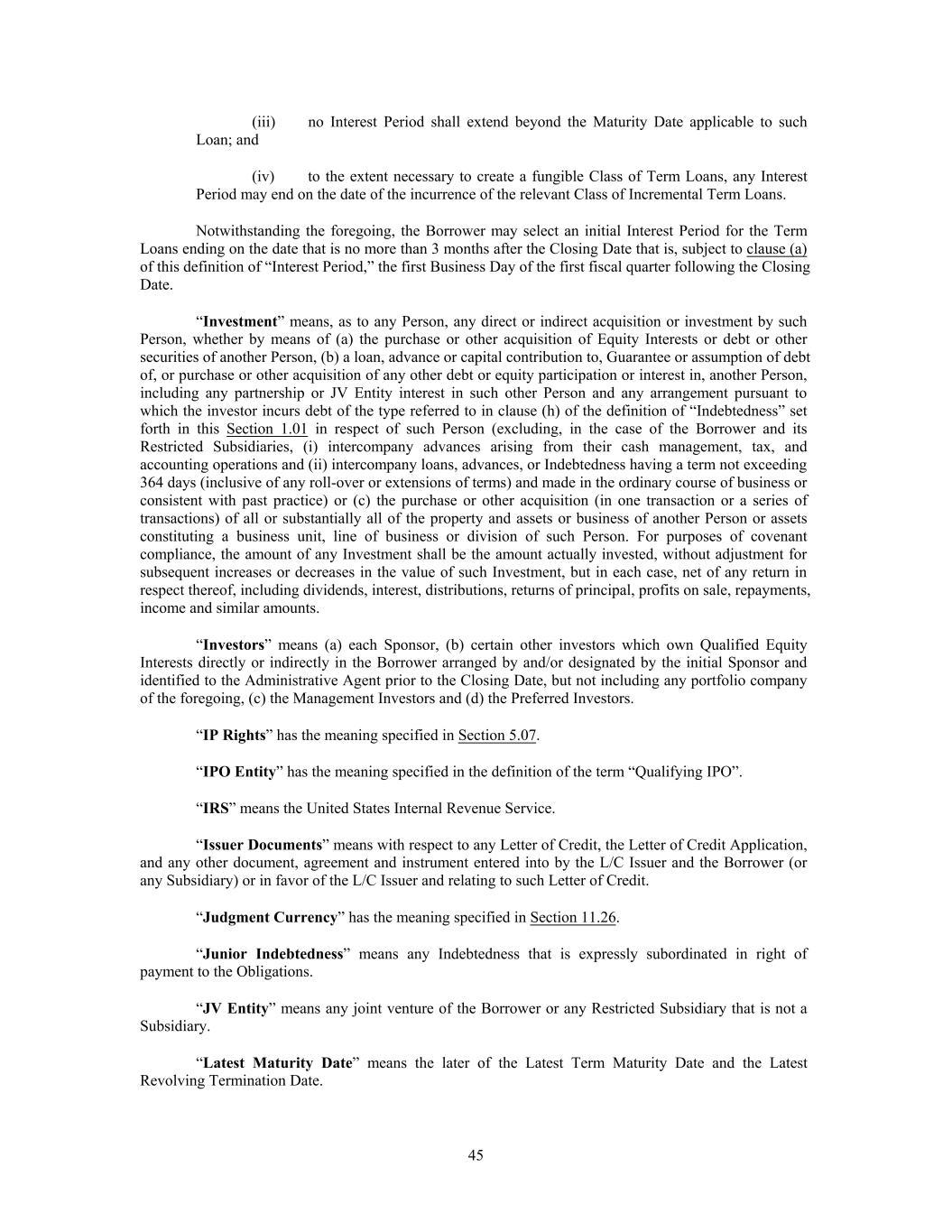 (iii) no Interest Period shall extend beyond the Maturity Date applicable to such Loan; and (iv) to the extent necessary to create a fungible Class of Term Loans, any Interest Period may end on the date of the incurrence of the relevant Class of Incremental Term Loans. Notwithstanding the foregoing, the Borrower may select an initial Interest Period for the Term Loans ending on the date that is no more than 3 months after the Closing Date that is, subject to clause (a) of this definition of “Interest Period,” the first Business Day of the first fiscal quarter following the Closing Date. “Investment” means, as to any Person, any direct or indirect acquisition or investment by such Person, whether by means of (a) the purchase or other acquisition of Equity Interests or debt or other securities of another Person, (b) a loan, advance or capital contribution to, Guarantee or assumption of debt of, or purchase or other acquisition of any other debt or equity participation or interest in, another Person, including any partnership or JV Entity interest in such other Person and any arrangement pursuant to which the investor incurs debt of the type referred to in clause (h) of the definition of “Indebtedness” set forth in this Section 1.01 in respect of such Person (excluding, in the case of the Borrower and its Restricted Subsidiaries, (i) intercompany advances arising from their cash management, tax, and accounting operations and (ii) intercompany loans, advances, or Indebtedness having a term not exceeding 364 days (inclusive of any roll-over or extensions of terms) and made in the ordinary course of business or consistent with past practice) or (c) the purchase or other acquisition (in one transaction or a series of transactions) of all or substantially all of the property and assets or business of another Person or assets constituting a business unit, line of business or division of such Person. For purposes of covenant compliance, the amount of any Investment shall be the amount actually invested, without adjustment for subsequent increases or decreases in the value of such Investment, but in each case, net of any return in respect thereof, including dividends, interest, distributions, returns of principal, profits on sale, repayments, income and similar amounts. “Investors” means (a) each Sponsor, (b) certain other investors which own Qualified Equity Interests directly or indirectly in the Borrower arranged by and/or designated by the initial Sponsor and identified to the Administrative Agent prior to the Closing Date, but not including any portfolio company of the foregoing, (c) the Management Investors and (d) the Preferred Investors. “IP Rights” has the meaning specified in Section 5.07. “IPO Entity” has the meaning specified in the definition of the term “Qualifying IPO”. “IRS” means the United States Internal Revenue Service. “Issuer Documents” means with respect to any Letter of Credit, the Letter of Credit Application, and any other document, agreement and instrument entered into by the L/C Issuer and the Borrower (or any Subsidiary) or in favor of the L/C Issuer and relating to such Letter of Credit. “Judgment Currency” has the meaning specified in Section 11.26. “Junior Indebtedness” means any Indebtedness that is expressly subordinated in right of payment to the Obligations. “JV Entity” means any joint venture of the Borrower or any Restricted Subsidiary that is not a Subsidiary. “Latest Maturity Date” means the later of the Latest Term Maturity Date and the Latest Revolving Termination Date. 45
