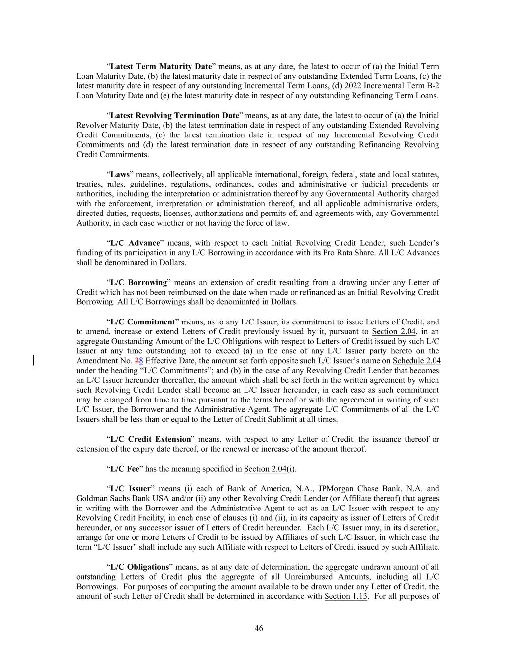 “Latest Term Maturity Date” means, as at any date, the latest to occur of (a) the Initial Term Loan Maturity Date, (b) the latest maturity date in respect of any outstanding Extended Term Loans, (c) the latest maturity date in respect of any outstanding Incremental Term Loans, (d) 2022 Incremental Term B-2 Loan Maturity Date and (e) the latest maturity date in respect of any outstanding Refinancing Term Loans. “Latest Revolving Termination Date” means, as at any date, the latest to occur of (a) the Initial Revolver Maturity Date, (b) the latest termination date in respect of any outstanding Extended Revolving Credit Commitments, (c) the latest termination date in respect of any Incremental Revolving Credit Commitments and (d) the latest termination date in respect of any outstanding Refinancing Revolving Credit Commitments. “Laws” means, collectively, all applicable international, foreign, federal, state and local statutes, treaties, rules, guidelines, regulations, ordinances, codes and administrative or judicial precedents or authorities, including the interpretation or administration thereof by any Governmental Authority charged with the enforcement, interpretation or administration thereof, and all applicable administrative orders, directed duties, requests, licenses, authorizations and permits of, and agreements with, any Governmental Authority, in each case whether or not having the force of law. “L/C Advance” means, with respect to each Initial Revolving Credit Lender, such Lender’s funding of its participation in any L/C Borrowing in accordance with its Pro Rata Share. All L/C Advances shall be denominated in Dollars. “L/C Borrowing” means an extension of credit resulting from a drawing under any Letter of Credit which has not been reimbursed on the date when made or refinanced as an Initial Revolving Credit Borrowing. All L/C Borrowings shall be denominated in Dollars. “L/C Commitment” means, as to any L/C Issuer, its commitment to issue Letters of Credit, and to amend, increase or extend Letters of Credit previously issued by it, pursuant to Section 2.04, in an aggregate Outstanding Amount of the L/C Obligations with respect to Letters of Credit issued by such L/C Issuer at any time outstanding not to exceed (a) in the case of any L/C Issuer party hereto on the Amendment No. 28 Effective Date, the amount set forth opposite such L/C Issuer’s name on Schedule 2.04 under the heading “L/C Commitments”; and (b) in the case of any Revolving Credit Lender that becomes an L/C Issuer hereunder thereafter, the amount which shall be set forth in the written agreement by which such Revolving Credit Lender shall become an L/C Issuer hereunder, in each case as such commitment may be changed from time to time pursuant to the terms hereof or with the agreement in writing of such L/C Issuer, the Borrower and the Administrative Agent. The aggregate L/C Commitments of all the L/C Issuers shall be less than or equal to the Letter of Credit Sublimit at all times. “L/C Credit Extension” means, with respect to any Letter of Credit, the issuance thereof or extension of the expiry date thereof, or the renewal or increase of the amount thereof. “L/C Fee” has the meaning specified in Section 2.04(i). “L/C Issuer” means (i) each of Bank of America, N.A., JPMorgan Chase Bank, N.A. and Goldman Sachs Bank USA and/or (ii) any other Revolving Credit Lender (or Affiliate thereof) that agrees in writing with the Borrower and the Administrative Agent to act as an L/C Issuer with respect to any Revolving Credit Facility, in each case of clauses (i) and (ii), in its capacity as issuer of Letters of Credit hereunder, or any successor issuer of Letters of Credit hereunder. Each L/C Issuer may, in its discretion, arrange for one or more Letters of Credit to be issued by Affiliates of such L/C Issuer, in which case the term “L/C Issuer” shall include any such Affiliate with respect to Letters of Credit issued by such Affiliate. “L/C Obligations” means, as at any date of determination, the aggregate undrawn amount of all outstanding Letters of Credit plus the aggregate of all Unreimbursed Amounts, including all L/C Borrowings. For purposes of computing the amount available to be drawn under any Letter of Credit, the amount of such Letter of Credit shall be determined in accordance with Section 1.13. For all purposes of 46
