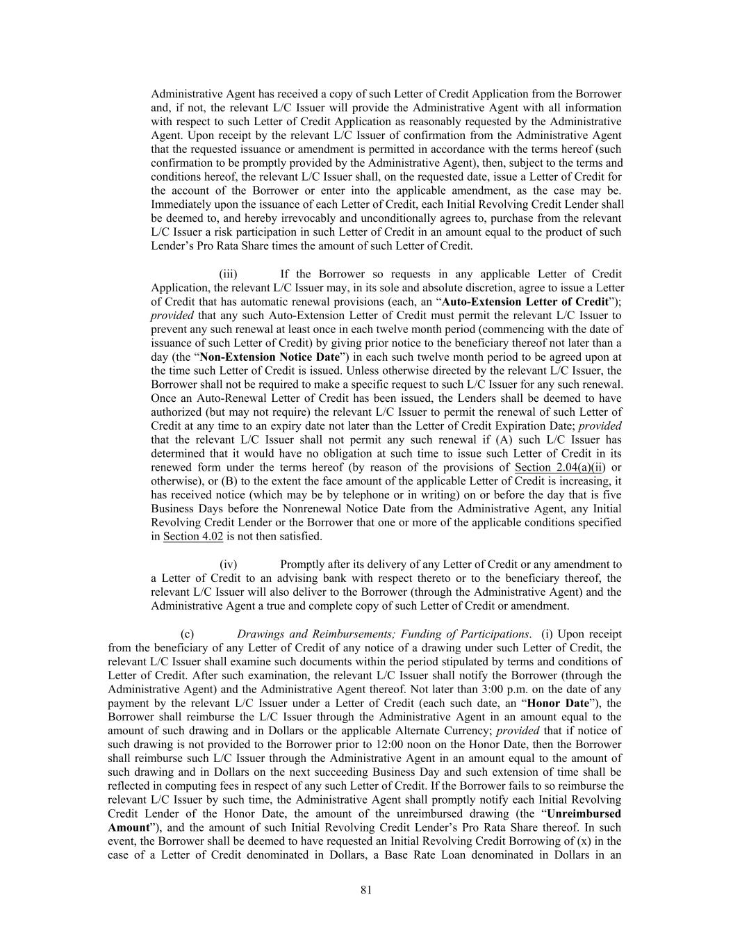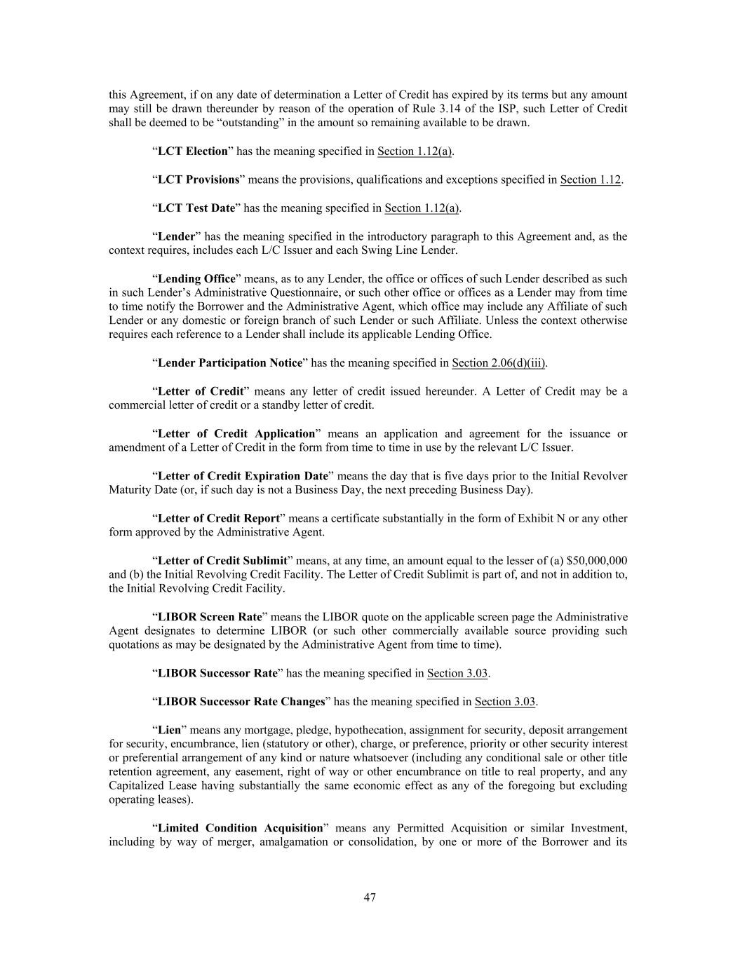this Agreement, if on any date of determination a Letter of Credit has expired by its terms but any amount may still be drawn thereunder by reason of the operation of Rule 3.14 of the ISP, such Letter of Credit shall be deemed to be “outstanding” in the amount so remaining available to be drawn. “LCT Election” has the meaning specified in Section 1.12(a). “LCT Provisions” means the provisions, qualifications and exceptions specified in Section 1.12. “LCT Test Date” has the meaning specified in Section 1.12(a). “Lender” has the meaning specified in the introductory paragraph to this Agreement and, as the context requires, includes each L/C Issuer and each Swing Line Lender. “Lending Office” means, as to any Lender, the office or offices of such Lender described as such in such Lender’s Administrative Questionnaire, or such other office or offices as a Lender may from time to time notify the Borrower and the Administrative Agent, which office may include any Affiliate of such Lender or any domestic or foreign branch of such Lender or such Affiliate. Unless the context otherwise requires each reference to a Lender shall include its applicable Lending Office. “Lender Participation Notice” has the meaning specified in Section 2.06(d)(iii). “Letter of Credit” means any letter of credit issued hereunder. A Letter of Credit may be a commercial letter of credit or a standby letter of credit. “Letter of Credit Application” means an application and agreement for the issuance or amendment of a Letter of Credit in the form from time to time in use by the relevant L/C Issuer. “Letter of Credit Expiration Date” means the day that is five days prior to the Initial Revolver Maturity Date (or, if such day is not a Business Day, the next preceding Business Day). “Letter of Credit Report” means a certificate substantially in the form of Exhibit N or any other form approved by the Administrative Agent. “Letter of Credit Sublimit” means, at any time, an amount equal to the lesser of (a) $50,000,000 and (b) the Initial Revolving Credit Facility. The Letter of Credit Sublimit is part of, and not in addition to, the Initial Revolving Credit Facility. “LIBOR Screen Rate” means the LIBOR quote on the applicable screen page the Administrative Agent designates to determine LIBOR (or such other commercially available source providing such quotations as may be designated by the Administrative Agent from time to time). “LIBOR Successor Rate” has the meaning specified in Section 3.03. “LIBOR Successor Rate Changes” has the meaning specified in Section 3.03. “Lien” means any mortgage, pledge, hypothecation, assignment for security, deposit arrangement for security, encumbrance, lien (statutory or other), charge, or preference, priority or other security interest or preferential arrangement of any kind or nature whatsoever (including any conditional sale or other title retention agreement, any easement, right of way or other encumbrance on title to real property, and any Capitalized Lease having substantially the same economic effect as any of the foregoing but excluding operating leases). “Limited Condition Acquisition” means any Permitted Acquisition or similar Investment, including by way of merger, amalgamation or consolidation, by one or more of the Borrower and its 47