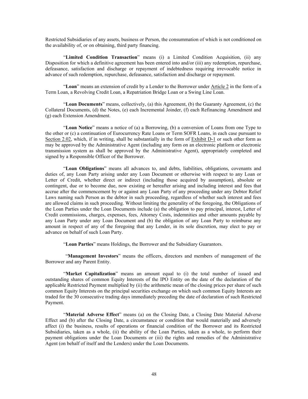 Restricted Subsidiaries of any assets, business or Person, the consummation of which is not conditioned on the availability of, or on obtaining, third party financing. “Limited Condition Transaction” means (i) a Limited Condition Acquisition, (ii) any Disposition for which a definitive agreement has been entered into and/or (iii) any redemption, repurchase, defeasance, satisfaction and discharge or repayment of indebtedness requiring irrevocable notice in advance of such redemption, repurchase, defeasance, satisfaction and discharge or repayment. “Loan” means an extension of credit by a Lender to the Borrower under Article 2 in the form of a Term Loan, a Revolving Credit Loan, a Repatriation Bridge Loan or a Swing Line Loan. “Loan Documents” means, collectively, (a) this Agreement, (b) the Guaranty Agreement, (c) the Collateral Documents, (d) the Notes, (e) each Incremental Joinder, (f) each Refinancing Amendment and (g) each Extension Amendment. “Loan Notice” means a notice of (a) a Borrowing, (b) a conversion of Loans from one Type to the other or (c) a continuation of Eurocurrency Rate Loans or Term SOFR Loans, in each case pursuant to Section 2.02, which, if in writing, shall be substantially in the form of Exhibit D-1 or such other form as may be approved by the Administrative Agent (including any form on an electronic platform or electronic transmission system as shall be approved by the Administrative Agent), appropriately completed and signed by a Responsible Officer of the Borrower. “Loan Obligations” means all advances to, and debts, liabilities, obligations, covenants and duties of, any Loan Party arising under any Loan Document or otherwise with respect to any Loan or Letter of Credit, whether direct or indirect (including those acquired by assumption), absolute or contingent, due or to become due, now existing or hereafter arising and including interest and fees that accrue after the commencement by or against any Loan Party of any proceeding under any Debtor Relief Laws naming such Person as the debtor in such proceeding, regardless of whether such interest and fees are allowed claims in such proceeding. Without limiting the generality of the foregoing, the Obligations of the Loan Parties under the Loan Documents include (a) the obligation to pay principal, interest, Letter of Credit commissions, charges, expenses, fees, Attorney Costs, indemnities and other amounts payable by any Loan Party under any Loan Document and (b) the obligation of any Loan Party to reimburse any amount in respect of any of the foregoing that any Lender, in its sole discretion, may elect to pay or advance on behalf of such Loan Party. “Loan Parties” means Holdings, the Borrower and the Subsidiary Guarantors. “Management Investors” means the officers, directors and members of management of the Borrower and any Parent Entity. “Market Capitalization” means an amount equal to (i) the total number of issued and outstanding shares of common Equity Interests of the IPO Entity on the date of the declaration of the applicable Restricted Payment multiplied by (ii) the arithmetic mean of the closing prices per share of such common Equity Interests on the principal securities exchange on which such common Equity Interests are traded for the 30 consecutive trading days immediately preceding the date of declaration of such Restricted Payment. “Material Adverse Effect” means (a) on the Closing Date, a Closing Date Material Adverse Effect and (b) after the Closing Date, a circumstance or condition that would materially and adversely affect (i) the business, results of operations or financial condition of the Borrower and its Restricted Subsidiaries, taken as a whole, (ii) the ability of the Loan Parties, taken as a whole, to perform their payment obligations under the Loan Documents or (iii) the rights and remedies of the Administrative Agent (on behalf of itself and the Lenders) under the Loan Documents. 48