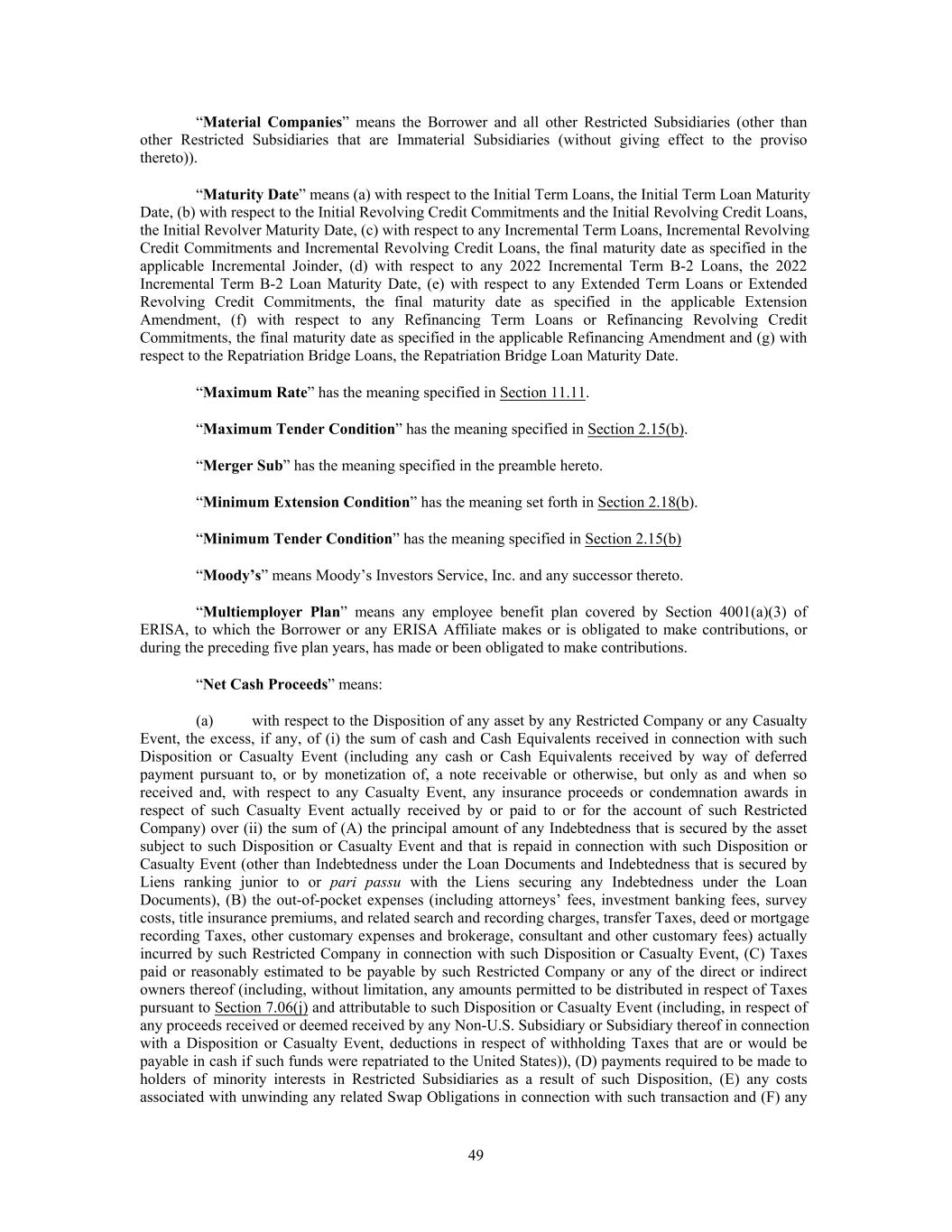 “Material Companies” means the Borrower and all other Restricted Subsidiaries (other than other Restricted Subsidiaries that are Immaterial Subsidiaries (without giving effect to the proviso thereto)). “Maturity Date” means (a) with respect to the Initial Term Loans, the Initial Term Loan Maturity Date, (b) with respect to the Initial Revolving Credit Commitments and the Initial Revolving Credit Loans, the Initial Revolver Maturity Date, (c) with respect to any Incremental Term Loans, Incremental Revolving Credit Commitments and Incremental Revolving Credit Loans, the final maturity date as specified in the applicable Incremental Joinder, (d) with respect to any 2022 Incremental Term B-2 Loans, the 2022 Incremental Term B-2 Loan Maturity Date, (e) with respect to any Extended Term Loans or Extended Revolving Credit Commitments, the final maturity date as specified in the applicable Extension Amendment, (f) with respect to any Refinancing Term Loans or Refinancing Revolving Credit Commitments, the final maturity date as specified in the applicable Refinancing Amendment and (g) with respect to the Repatriation Bridge Loans, the Repatriation Bridge Loan Maturity Date. “Maximum Rate” has the meaning specified in Section 11.11. “Maximum Tender Condition” has the meaning specified in Section 2.15(b). “Merger Sub” has the meaning specified in the preamble hereto. “Minimum Extension Condition” has the meaning set forth in Section 2.18(b). “Minimum Tender Condition” has the meaning specified in Section 2.15(b) “Moody’s” means Moody’s Investors Service, Inc. and any successor thereto. “Multiemployer Plan” means any employee benefit plan covered by Section 4001(a)(3) of ERISA, to which the Borrower or any ERISA Affiliate makes or is obligated to make contributions, or during the preceding five plan years, has made or been obligated to make contributions. “Net Cash Proceeds” means: (a) with respect to the Disposition of any asset by any Restricted Company or any Casualty Event, the excess, if any, of (i) the sum of cash and Cash Equivalents received in connection with such Disposition or Casualty Event (including any cash or Cash Equivalents received by way of deferred payment pursuant to, or by monetization of, a note receivable or otherwise, but only as and when so received and, with respect to any Casualty Event, any insurance proceeds or condemnation awards in respect of such Casualty Event actually received by or paid to or for the account of such Restricted Company) over (ii) the sum of (A) the principal amount of any Indebtedness that is secured by the asset subject to such Disposition or Casualty Event and that is repaid in connection with such Disposition or Casualty Event (other than Indebtedness under the Loan Documents and Indebtedness that is secured by Liens ranking junior to or pari passu with the Liens securing any Indebtedness under the Loan Documents), (B) the out-of-pocket expenses (including attorneys’ fees, investment banking fees, survey costs, title insurance premiums, and related search and recording charges, transfer Taxes, deed or mortgage recording Taxes, other customary expenses and brokerage, consultant and other customary fees) actually incurred by such Restricted Company in connection with such Disposition or Casualty Event, (C) Taxes paid or reasonably estimated to be payable by such Restricted Company or any of the direct or indirect owners thereof (including, without limitation, any amounts permitted to be distributed in respect of Taxes pursuant to Section 7.06(j) and attributable to such Disposition or Casualty Event (including, in respect of any proceeds received or deemed received by any Non-U.S. Subsidiary or Subsidiary thereof in connection with a Disposition or Casualty Event, deductions in respect of withholding Taxes that are or would be payable in cash if such funds were repatriated to the United States)), (D) payments required to be made to holders of minority interests in Restricted Subsidiaries as a result of such Disposition, (E) any costs associated with unwinding any related Swap Obligations in connection with such transaction and (F) any 49