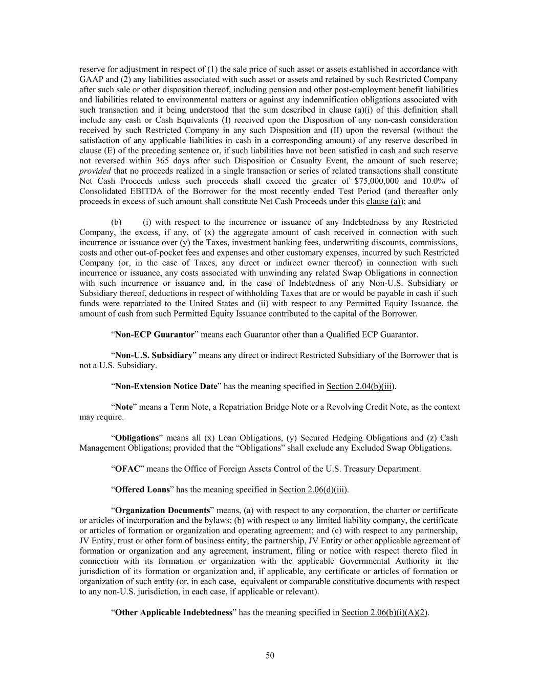 reserve for adjustment in respect of (1) the sale price of such asset or assets established in accordance with GAAP and (2) any liabilities associated with such asset or assets and retained by such Restricted Company after such sale or other disposition thereof, including pension and other post-employment benefit liabilities and liabilities related to environmental matters or against any indemnification obligations associated with such transaction and it being understood that the sum described in clause (a)(i) of this definition shall include any cash or Cash Equivalents (I) received upon the Disposition of any non-cash consideration received by such Restricted Company in any such Disposition and (II) upon the reversal (without the satisfaction of any applicable liabilities in cash in a corresponding amount) of any reserve described in clause (E) of the preceding sentence or, if such liabilities have not been satisfied in cash and such reserve not reversed within 365 days after such Disposition or Casualty Event, the amount of such reserve; provided that no proceeds realized in a single transaction or series of related transactions shall constitute Net Cash Proceeds unless such proceeds shall exceed the greater of $75,000,000 and 10.0% of Consolidated EBITDA of the Borrower for the most recently ended Test Period (and thereafter only proceeds in excess of such amount shall constitute Net Cash Proceeds under this clause (a)); and (b) (i) with respect to the incurrence or issuance of any Indebtedness by any Restricted Company, the excess, if any, of (x) the aggregate amount of cash received in connection with such incurrence or issuance over (y) the Taxes, investment banking fees, underwriting discounts, commissions, costs and other out-of-pocket fees and expenses and other customary expenses, incurred by such Restricted Company (or, in the case of Taxes, any direct or indirect owner thereof) in connection with such incurrence or issuance, any costs associated with unwinding any related Swap Obligations in connection with such incurrence or issuance and, in the case of Indebtedness of any Non-U.S. Subsidiary or Subsidiary thereof, deductions in respect of withholding Taxes that are or would be payable in cash if such funds were repatriated to the United States and (ii) with respect to any Permitted Equity Issuance, the amount of cash from such Permitted Equity Issuance contributed to the capital of the Borrower. “Non-ECP Guarantor” means each Guarantor other than a Qualified ECP Guarantor. “Non-U.S. Subsidiary” means any direct or indirect Restricted Subsidiary of the Borrower that is not a U.S. Subsidiary. “Non-Extension Notice Date” has the meaning specified in Section 2.04(b)(iii). “Note” means a Term Note, a Repatriation Bridge Note or a Revolving Credit Note, as the context may require. “Obligations” means all (x) Loan Obligations, (y) Secured Hedging Obligations and (z) Cash Management Obligations; provided that the “Obligations” shall exclude any Excluded Swap Obligations. “OFAC” means the Office of Foreign Assets Control of the U.S. Treasury Department. “Offered Loans” has the meaning specified in Section 2.06(d)(iii). “Organization Documents” means, (a) with respect to any corporation, the charter or certificate or articles of incorporation and the bylaws; (b) with respect to any limited liability company, the certificate or articles of formation or organization and operating agreement; and (c) with respect to any partnership, JV Entity, trust or other form of business entity, the partnership, JV Entity or other applicable agreement of formation or organization and any agreement, instrument, filing or notice with respect thereto filed in connection with its formation or organization with the applicable Governmental Authority in the jurisdiction of its formation or organization and, if applicable, any certificate or articles of formation or organization of such entity (or, in each case, equivalent or comparable constitutive documents with respect to any non-U.S. jurisdiction, in each case, if applicable or relevant). “Other Applicable Indebtedness” has the meaning specified in Section 2.06(b)(i)(A)(2). 50