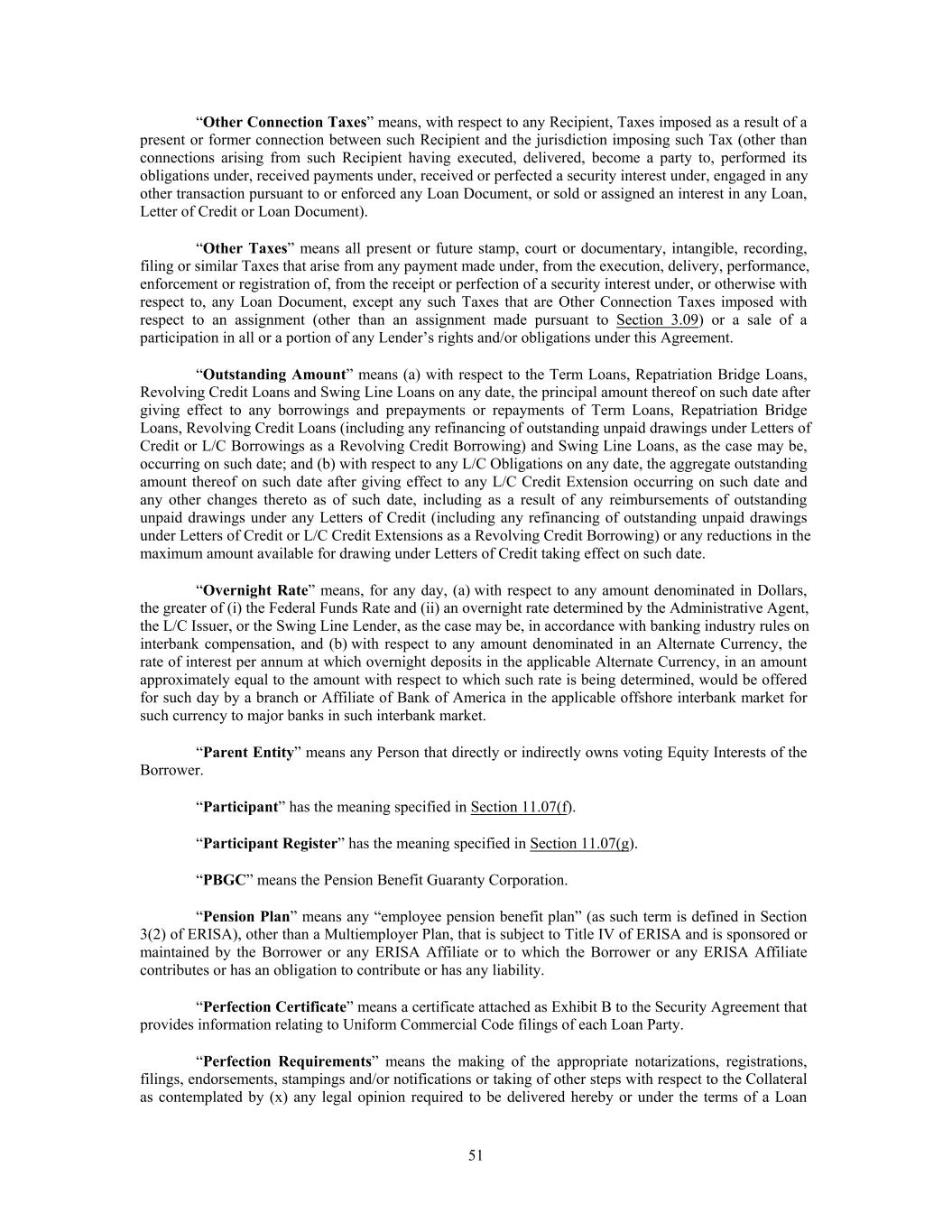 “Other Connection Taxes” means, with respect to any Recipient, Taxes imposed as a result of a present or former connection between such Recipient and the jurisdiction imposing such Tax (other than connections arising from such Recipient having executed, delivered, become a party to, performed its obligations under, received payments under, received or perfected a security interest under, engaged in any other transaction pursuant to or enforced any Loan Document, or sold or assigned an interest in any Loan, Letter of Credit or Loan Document). “Other Taxes” means all present or future stamp, court or documentary, intangible, recording, filing or similar Taxes that arise from any payment made under, from the execution, delivery, performance, enforcement or registration of, from the receipt or perfection of a security interest under, or otherwise with respect to, any Loan Document, except any such Taxes that are Other Connection Taxes imposed with respect to an assignment (other than an assignment made pursuant to Section 3.09) or a sale of a participation in all or a portion of any Lender’s rights and/or obligations under this Agreement. “Outstanding Amount” means (a) with respect to the Term Loans, Repatriation Bridge Loans, Revolving Credit Loans and Swing Line Loans on any date, the principal amount thereof on such date after giving effect to any borrowings and prepayments or repayments of Term Loans, Repatriation Bridge Loans, Revolving Credit Loans (including any refinancing of outstanding unpaid drawings under Letters of Credit or L/C Borrowings as a Revolving Credit Borrowing) and Swing Line Loans, as the case may be, occurring on such date; and (b) with respect to any L/C Obligations on any date, the aggregate outstanding amount thereof on such date after giving effect to any L/C Credit Extension occurring on such date and any other changes thereto as of such date, including as a result of any reimbursements of outstanding unpaid drawings under any Letters of Credit (including any refinancing of outstanding unpaid drawings under Letters of Credit or L/C Credit Extensions as a Revolving Credit Borrowing) or any reductions in the maximum amount available for drawing under Letters of Credit taking effect on such date. “Overnight Rate” means, for any day, (a) with respect to any amount denominated in Dollars, the greater of (i) the Federal Funds Rate and (ii) an overnight rate determined by the Administrative Agent, the L/C Issuer, or the Swing Line Lender, as the case may be, in accordance with banking industry rules on interbank compensation, and (b) with respect to any amount denominated in an Alternate Currency, the rate of interest per annum at which overnight deposits in the applicable Alternate Currency, in an amount approximately equal to the amount with respect to which such rate is being determined, would be offered for such day by a branch or Affiliate of Bank of America in the applicable offshore interbank market for such currency to major banks in such interbank market. “Parent Entity” means any Person that directly or indirectly owns voting Equity Interests of the Borrower. “Participant” has the meaning specified in Section 11.07(f). “Participant Register” has the meaning specified in Section 11.07(g). “PBGC” means the Pension Benefit Guaranty Corporation. “Pension Plan” means any “employee pension benefit plan” (as such term is defined in Section 3(2) of ERISA), other than a Multiemployer Plan, that is subject to Title IV of ERISA and is sponsored or maintained by the Borrower or any ERISA Affiliate or to which the Borrower or any ERISA Affiliate contributes or has an obligation to contribute or has any liability. “Perfection Certificate” means a certificate attached as Exhibit B to the Security Agreement that provides information relating to Uniform Commercial Code filings of each Loan Party. “Perfection Requirements” means the making of the appropriate notarizations, registrations, filings, endorsements, stampings and/or notifications or taking of other steps with respect to the Collateral as contemplated by (x) any legal opinion required to be delivered hereby or under the terms of a Loan 51