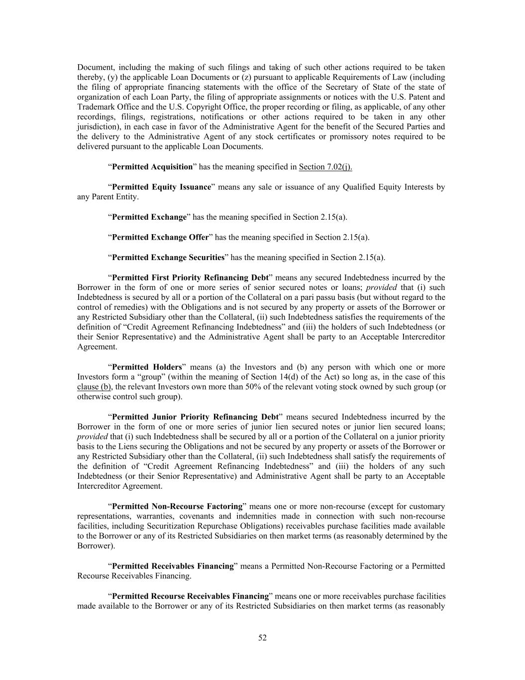 Document, including the making of such filings and taking of such other actions required to be taken thereby, (y) the applicable Loan Documents or (z) pursuant to applicable Requirements of Law (including the filing of appropriate financing statements with the office of the Secretary of State of the state of organization of each Loan Party, the filing of appropriate assignments or notices with the U.S. Patent and Trademark Office and the U.S. Copyright Office, the proper recording or filing, as applicable, of any other recordings, filings, registrations, notifications or other actions required to be taken in any other jurisdiction), in each case in favor of the Administrative Agent for the benefit of the Secured Parties and the delivery to the Administrative Agent of any stock certificates or promissory notes required to be delivered pursuant to the applicable Loan Documents. “Permitted Acquisition” has the meaning specified in Section 7.02(j). “Permitted Equity Issuance” means any sale or issuance of any Qualified Equity Interests by any Parent Entity. “Permitted Exchange” has the meaning specified in Section 2.15(a). “Permitted Exchange Offer” has the meaning specified in Section 2.15(a). “Permitted Exchange Securities” has the meaning specified in Section 2.15(a). “Permitted First Priority Refinancing Debt” means any secured Indebtedness incurred by the Borrower in the form of one or more series of senior secured notes or loans; provided that (i) such Indebtedness is secured by all or a portion of the Collateral on a pari passu basis (but without regard to the control of remedies) with the Obligations and is not secured by any property or assets of the Borrower or any Restricted Subsidiary other than the Collateral, (ii) such Indebtedness satisfies the requirements of the definition of “Credit Agreement Refinancing Indebtedness” and (iii) the holders of such Indebtedness (or their Senior Representative) and the Administrative Agent shall be party to an Acceptable Intercreditor Agreement. “Permitted Holders” means (a) the Investors and (b) any person with which one or more Investors form a “group” (within the meaning of Section 14(d) of the Act) so long as, in the case of this clause (b), the relevant Investors own more than 50% of the relevant voting stock owned by such group (or otherwise control such group). “Permitted Junior Priority Refinancing Debt” means secured Indebtedness incurred by the Borrower in the form of one or more series of junior lien secured notes or junior lien secured loans; provided that (i) such Indebtedness shall be secured by all or a portion of the Collateral on a junior priority basis to the Liens securing the Obligations and not be secured by any property or assets of the Borrower or any Restricted Subsidiary other than the Collateral, (ii) such Indebtedness shall satisfy the requirements of the definition of “Credit Agreement Refinancing Indebtedness” and (iii) the holders of any such Indebtedness (or their Senior Representative) and Administrative Agent shall be party to an Acceptable Intercreditor Agreement. “Permitted Non-Recourse Factoring” means one or more non-recourse (except for customary representations, warranties, covenants and indemnities made in connection with such non-recourse facilities, including Securitization Repurchase Obligations) receivables purchase facilities made available to the Borrower or any of its Restricted Subsidiaries on then market terms (as reasonably determined by the Borrower). “Permitted Receivables Financing” means a Permitted Non-Recourse Factoring or a Permitted Recourse Receivables Financing. “Permitted Recourse Receivables Financing” means one or more receivables purchase facilities made available to the Borrower or any of its Restricted Subsidiaries on then market terms (as reasonably 52