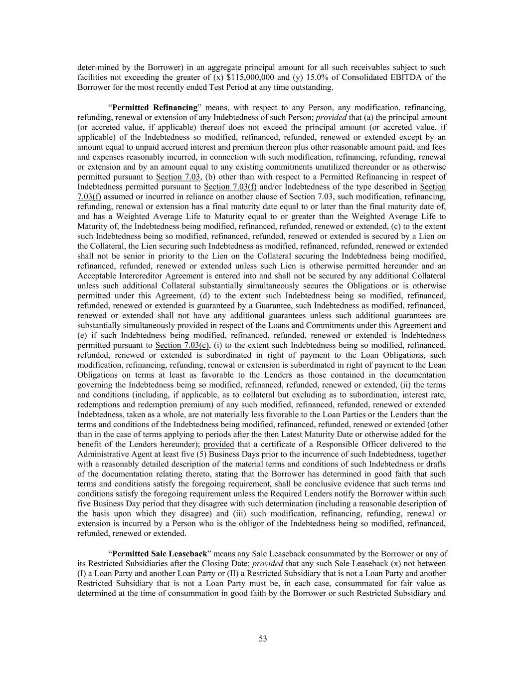 deter-mined by the Borrower) in an aggregate principal amount for all such receivables subject to such facilities not exceeding the greater of (x) $115,000,000 and (y) 15.0% of Consolidated EBITDA of the Borrower for the most recently ended Test Period at any time outstanding. “Permitted Refinancing” means, with respect to any Person, any modification, refinancing, refunding, renewal or extension of any Indebtedness of such Person; provided that (a) the principal amount (or accreted value, if applicable) thereof does not exceed the principal amount (or accreted value, if applicable) of the Indebtedness so modified, refinanced, refunded, renewed or extended except by an amount equal to unpaid accrued interest and premium thereon plus other reasonable amount paid, and fees and expenses reasonably incurred, in connection with such modification, refinancing, refunding, renewal or extension and by an amount equal to any existing commitments unutilized thereunder or as otherwise permitted pursuant to Section 7.03, (b) other than with respect to a Permitted Refinancing in respect of Indebtedness permitted pursuant to Section 7.03(f) and/or Indebtedness of the type described in Section 7.03(f) assumed or incurred in reliance on another clause of Section 7.03, such modification, refinancing, refunding, renewal or extension has a final maturity date equal to or later than the final maturity date of, and has a Weighted Average Life to Maturity equal to or greater than the Weighted Average Life to Maturity of, the Indebtedness being modified, refinanced, refunded, renewed or extended, (c) to the extent such Indebtedness being so modified, refinanced, refunded, renewed or extended is secured by a Lien on the Collateral, the Lien securing such Indebtedness as modified, refinanced, refunded, renewed or extended shall not be senior in priority to the Lien on the Collateral securing the Indebtedness being modified, refinanced, refunded, renewed or extended unless such Lien is otherwise permitted hereunder and an Acceptable Intercreditor Agreement is entered into and shall not be secured by any additional Collateral unless such additional Collateral substantially simultaneously secures the Obligations or is otherwise permitted under this Agreement, (d) to the extent such Indebtedness being so modified, refinanced, refunded, renewed or extended is guaranteed by a Guarantee, such Indebtedness as modified, refinanced, renewed or extended shall not have any additional guarantees unless such additional guarantees are substantially simultaneously provided in respect of the Loans and Commitments under this Agreement and (e) if such Indebtedness being modified, refinanced, refunded, renewed or extended is Indebtedness permitted pursuant to Section 7.03(c), (i) to the extent such Indebtedness being so modified, refinanced, refunded, renewed or extended is subordinated in right of payment to the Loan Obligations, such modification, refinancing, refunding, renewal or extension is subordinated in right of payment to the Loan Obligations on terms at least as favorable to the Lenders as those contained in the documentation governing the Indebtedness being so modified, refinanced, refunded, renewed or extended, (ii) the terms and conditions (including, if applicable, as to collateral but excluding as to subordination, interest rate, redemptions and redemption premium) of any such modified, refinanced, refunded, renewed or extended Indebtedness, taken as a whole, are not materially less favorable to the Loan Parties or the Lenders than the terms and conditions of the Indebtedness being modified, refinanced, refunded, renewed or extended (other than in the case of terms applying to periods after the then Latest Maturity Date or otherwise added for the benefit of the Lenders hereunder); provided that a certificate of a Responsible Officer delivered to the Administrative Agent at least five (5) Business Days prior to the incurrence of such Indebtedness, together with a reasonably detailed description of the material terms and conditions of such Indebtedness or drafts of the documentation relating thereto, stating that the Borrower has determined in good faith that such terms and conditions satisfy the foregoing requirement, shall be conclusive evidence that such terms and conditions satisfy the foregoing requirement unless the Required Lenders notify the Borrower within such five Business Day period that they disagree with such determination (including a reasonable description of the basis upon which they disagree) and (iii) such modification, refinancing, refunding, renewal or extension is incurred by a Person who is the obligor of the Indebtedness being so modified, refinanced, refunded, renewed or extended. “Permitted Sale Leaseback” means any Sale Leaseback consummated by the Borrower or any of its Restricted Subsidiaries after the Closing Date; provided that any such Sale Leaseback (x) not between (I) a Loan Party and another Loan Party or (II) a Restricted Subsidiary that is not a Loan Party and another Restricted Subsidiary that is not a Loan Party must be, in each case, consummated for fair value as determined at the time of consummation in good faith by the Borrower or such Restricted Subsidiary and 53