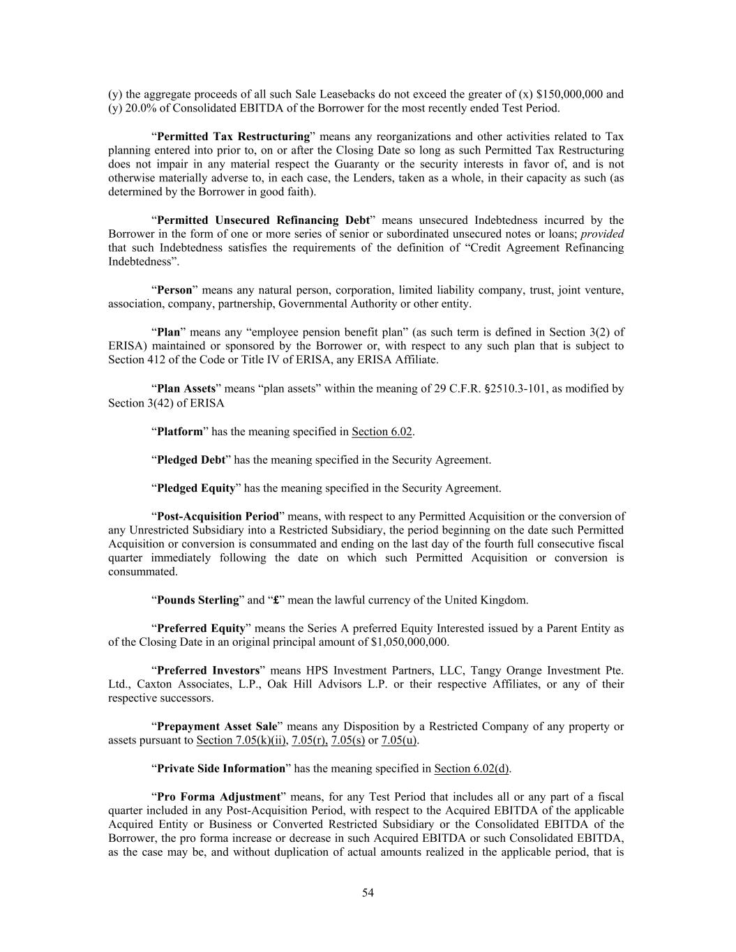 (y) the aggregate proceeds of all such Sale Leasebacks do not exceed the greater of (x) $150,000,000 and (y) 20.0% of Consolidated EBITDA of the Borrower for the most recently ended Test Period. “Permitted Tax Restructuring” means any reorganizations and other activities related to Tax planning entered into prior to, on or after the Closing Date so long as such Permitted Tax Restructuring does not impair in any material respect the Guaranty or the security interests in favor of, and is not otherwise materially adverse to, in each case, the Lenders, taken as a whole, in their capacity as such (as determined by the Borrower in good faith). “Permitted Unsecured Refinancing Debt” means unsecured Indebtedness incurred by the Borrower in the form of one or more series of senior or subordinated unsecured notes or loans; provided that such Indebtedness satisfies the requirements of the definition of “Credit Agreement Refinancing Indebtedness”. “Person” means any natural person, corporation, limited liability company, trust, joint venture, association, company, partnership, Governmental Authority or other entity. “Plan” means any “employee pension benefit plan” (as such term is defined in Section 3(2) of ERISA) maintained or sponsored by the Borrower or, with respect to any such plan that is subject to Section 412 of the Code or Title IV of ERISA, any ERISA Affiliate. “Plan Assets” means “plan assets” within the meaning of 29 C.F.R. §2510.3-101, as modified by Section 3(42) of ERISA “Platform” has the meaning specified in Section 6.02. “Pledged Debt” has the meaning specified in the Security Agreement. “Pledged Equity” has the meaning specified in the Security Agreement. “Post-Acquisition Period” means, with respect to any Permitted Acquisition or the conversion of any Unrestricted Subsidiary into a Restricted Subsidiary, the period beginning on the date such Permitted Acquisition or conversion is consummated and ending on the last day of the fourth full consecutive fiscal quarter immediately following the date on which such Permitted Acquisition or conversion is consummated. “Pounds Sterling” and “£” mean the lawful currency of the United Kingdom. “Preferred Equity” means the Series A preferred Equity Interested issued by a Parent Entity as of the Closing Date in an original principal amount of $1,050,000,000. “Preferred Investors” means HPS Investment Partners, LLC, Tangy Orange Investment Pte. Ltd., Caxton Associates, L.P., Oak Hill Advisors L.P. or their respective Affiliates, or any of their respective successors. “Prepayment Asset Sale” means any Disposition by a Restricted Company of any property or assets pursuant to Section 7.05(k)(ii), 7.05(r), 7.05(s) or 7.05(u). “Private Side Information” has the meaning specified in Section 6.02(d). “Pro Forma Adjustment” means, for any Test Period that includes all or any part of a fiscal quarter included in any Post-Acquisition Period, with respect to the Acquired EBITDA of the applicable Acquired Entity or Business or Converted Restricted Subsidiary or the Consolidated EBITDA of the Borrower, the pro forma increase or decrease in such Acquired EBITDA or such Consolidated EBITDA, as the case may be, and without duplication of actual amounts realized in the applicable period, that is 54
