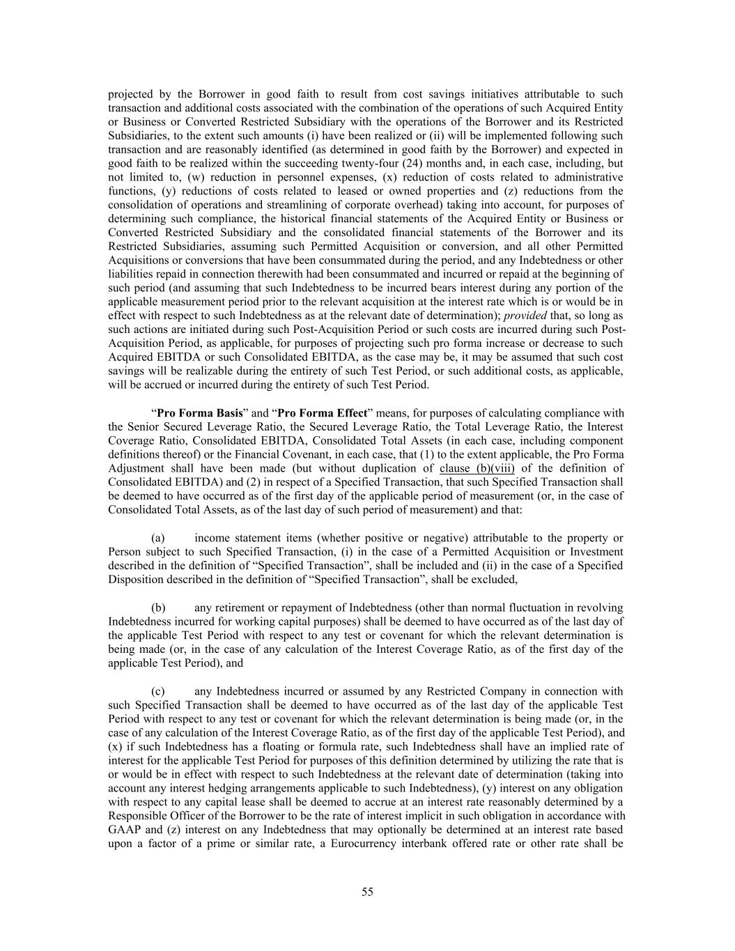 projected by the Borrower in good faith to result from cost savings initiatives attributable to such transaction and additional costs associated with the combination of the operations of such Acquired Entity or Business or Converted Restricted Subsidiary with the operations of the Borrower and its Restricted Subsidiaries, to the extent such amounts (i) have been realized or (ii) will be implemented following such transaction and are reasonably identified (as determined in good faith by the Borrower) and expected in good faith to be realized within the succeeding twenty-four (24) months and, in each case, including, but not limited to, (w) reduction in personnel expenses, (x) reduction of costs related to administrative functions, (y) reductions of costs related to leased or owned properties and (z) reductions from the consolidation of operations and streamlining of corporate overhead) taking into account, for purposes of determining such compliance, the historical financial statements of the Acquired Entity or Business or Converted Restricted Subsidiary and the consolidated financial statements of the Borrower and its Restricted Subsidiaries, assuming such Permitted Acquisition or conversion, and all other Permitted Acquisitions or conversions that have been consummated during the period, and any Indebtedness or other liabilities repaid in connection therewith had been consummated and incurred or repaid at the beginning of such period (and assuming that such Indebtedness to be incurred bears interest during any portion of the applicable measurement period prior to the relevant acquisition at the interest rate which is or would be in effect with respect to such Indebtedness as at the relevant date of determination); provided that, so long as such actions are initiated during such Post-Acquisition Period or such costs are incurred during such Post- Acquisition Period, as applicable, for purposes of projecting such pro forma increase or decrease to such Acquired EBITDA or such Consolidated EBITDA, as the case may be, it may be assumed that such cost savings will be realizable during the entirety of such Test Period, or such additional costs, as applicable, will be accrued or incurred during the entirety of such Test Period. “Pro Forma Basis” and “Pro Forma Effect” means, for purposes of calculating compliance with the Senior Secured Leverage Ratio, the Secured Leverage Ratio, the Total Leverage Ratio, the Interest Coverage Ratio, Consolidated EBITDA, Consolidated Total Assets (in each case, including component definitions thereof) or the Financial Covenant, in each case, that (1) to the extent applicable, the Pro Forma Adjustment shall have been made (but without duplication of clause (b)(viii) of the definition of Consolidated EBITDA) and (2) in respect of a Specified Transaction, that such Specified Transaction shall be deemed to have occurred as of the first day of the applicable period of measurement (or, in the case of Consolidated Total Assets, as of the last day of such period of measurement) and that: (a) income statement items (whether positive or negative) attributable to the property or Person subject to such Specified Transaction, (i) in the case of a Permitted Acquisition or Investment described in the definition of “Specified Transaction”, shall be included and (ii) in the case of a Specified Disposition described in the definition of “Specified Transaction”, shall be excluded, (b) any retirement or repayment of Indebtedness (other than normal fluctuation in revolving Indebtedness incurred for working capital purposes) shall be deemed to have occurred as of the last day of the applicable Test Period with respect to any test or covenant for which the relevant determination is being made (or, in the case of any calculation of the Interest Coverage Ratio, as of the first day of the applicable Test Period), and (c) any Indebtedness incurred or assumed by any Restricted Company in connection with such Specified Transaction shall be deemed to have occurred as of the last day of the applicable Test Period with respect to any test or covenant for which the relevant determination is being made (or, in the case of any calculation of the Interest Coverage Ratio, as of the first day of the applicable Test Period), and (x) if such Indebtedness has a floating or formula rate, such Indebtedness shall have an implied rate of interest for the applicable Test Period for purposes of this definition determined by utilizing the rate that is or would be in effect with respect to such Indebtedness at the relevant date of determination (taking into account any interest hedging arrangements applicable to such Indebtedness), (y) interest on any obligation with respect to any capital lease shall be deemed to accrue at an interest rate reasonably determined by a Responsible Officer of the Borrower to be the rate of interest implicit in such obligation in accordance with GAAP and (z) interest on any Indebtedness that may optionally be determined at an interest rate based upon a factor of a prime or similar rate, a Eurocurrency interbank offered rate or other rate shall be 55