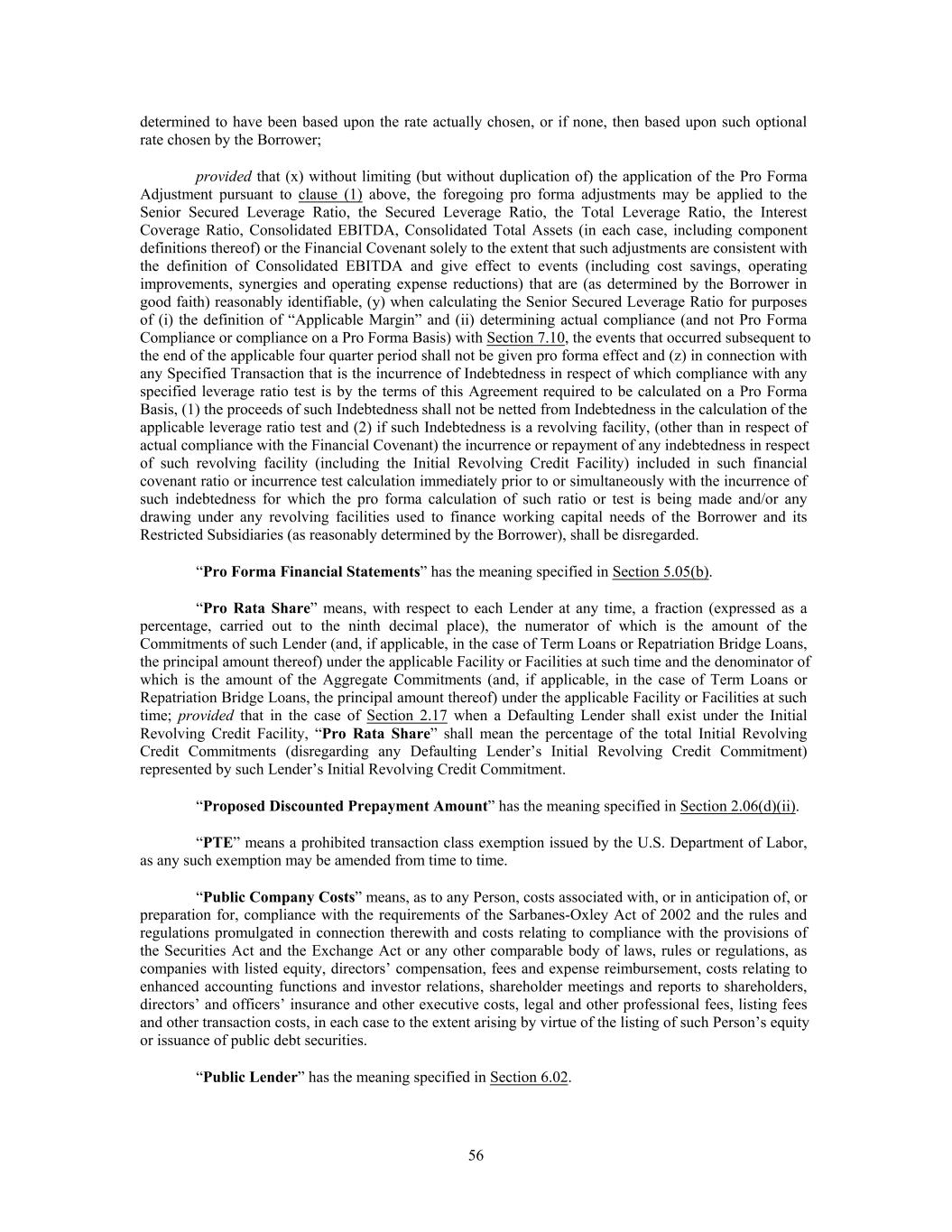 determined to have been based upon the rate actually chosen, or if none, then based upon such optional rate chosen by the Borrower; provided that (x) without limiting (but without duplication of) the application of the Pro Forma Adjustment pursuant to clause (1) above, the foregoing pro forma adjustments may be applied to the Senior Secured Leverage Ratio, the Secured Leverage Ratio, the Total Leverage Ratio, the Interest Coverage Ratio, Consolidated EBITDA, Consolidated Total Assets (in each case, including component definitions thereof) or the Financial Covenant solely to the extent that such adjustments are consistent with the definition of Consolidated EBITDA and give effect to events (including cost savings, operating improvements, synergies and operating expense reductions) that are (as determined by the Borrower in good faith) reasonably identifiable, (y) when calculating the Senior Secured Leverage Ratio for purposes of (i) the definition of “Applicable Margin” and (ii) determining actual compliance (and not Pro Forma Compliance or compliance on a Pro Forma Basis) with Section 7.10, the events that occurred subsequent to the end of the applicable four quarter period shall not be given pro forma effect and (z) in connection with any Specified Transaction that is the incurrence of Indebtedness in respect of which compliance with any specified leverage ratio test is by the terms of this Agreement required to be calculated on a Pro Forma Basis, (1) the proceeds of such Indebtedness shall not be netted from Indebtedness in the calculation of the applicable leverage ratio test and (2) if such Indebtedness is a revolving facility, (other than in respect of actual compliance with the Financial Covenant) the incurrence or repayment of any indebtedness in respect of such revolving facility (including the Initial Revolving Credit Facility) included in such financial covenant ratio or incurrence test calculation immediately prior to or simultaneously with the incurrence of such indebtedness for which the pro forma calculation of such ratio or test is being made and/or any drawing under any revolving facilities used to finance working capital needs of the Borrower and its Restricted Subsidiaries (as reasonably determined by the Borrower), shall be disregarded. “Pro Forma Financial Statements” has the meaning specified in Section 5.05(b). “Pro Rata Share” means, with respect to each Lender at any time, a fraction (expressed as a percentage, carried out to the ninth decimal place), the numerator of which is the amount of the Commitments of such Lender (and, if applicable, in the case of Term Loans or Repatriation Bridge Loans, the principal amount thereof) under the applicable Facility or Facilities at such time and the denominator of which is the amount of the Aggregate Commitments (and, if applicable, in the case of Term Loans or Repatriation Bridge Loans, the principal amount thereof) under the applicable Facility or Facilities at such time; provided that in the case of Section 2.17 when a Defaulting Lender shall exist under the Initial Revolving Credit Facility, “Pro Rata Share” shall mean the percentage of the total Initial Revolving Credit Commitments (disregarding any Defaulting Lender’s Initial Revolving Credit Commitment) represented by such Lender’s Initial Revolving Credit Commitment. “Proposed Discounted Prepayment Amount” has the meaning specified in Section 2.06(d)(ii). “PTE” means a prohibited transaction class exemption issued by the U.S. Department of Labor, as any such exemption may be amended from time to time. “Public Company Costs” means, as to any Person, costs associated with, or in anticipation of, or preparation for, compliance with the requirements of the Sarbanes-Oxley Act of 2002 and the rules and regulations promulgated in connection therewith and costs relating to compliance with the provisions of the Securities Act and the Exchange Act or any other comparable body of laws, rules or regulations, as companies with listed equity, directors’ compensation, fees and expense reimbursement, costs relating to enhanced accounting functions and investor relations, shareholder meetings and reports to shareholders, directors’ and officers’ insurance and other executive costs, legal and other professional fees, listing fees and other transaction costs, in each case to the extent arising by virtue of the listing of such Person’s equity or issuance of public debt securities. “Public Lender” has the meaning specified in Section 6.02. 56