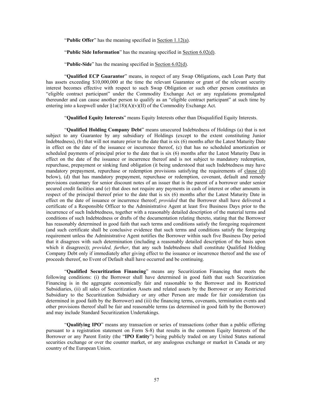 “Public Offer” has the meaning specified in Section 1.12(a). “Public Side Information” has the meaning specified in Section 6.02(d). “Public-Side” has the meaning specified in Section 6.02(d). “Qualified ECP Guarantor” means, in respect of any Swap Obligations, each Loan Party that has assets exceeding $10,000,000 at the time the relevant Guarantee or grant of the relevant security interest becomes effective with respect to such Swap Obligation or such other person constitutes an “eligible contract participant” under the Commodity Exchange Act or any regulations promulgated thereunder and can cause another person to qualify as an “eligible contract participant” at such time by entering into a keepwell under §1a(18)(A)(v)(II) of the Commodity Exchange Act. “Qualified Equity Interests” means Equity Interests other than Disqualified Equity Interests. “Qualified Holding Company Debt” means unsecured Indebtedness of Holdings (a) that is not subject to any Guarantee by any subsidiary of Holdings (except to the extent constituting Junior Indebtedness), (b) that will not mature prior to the date that is six (6) months after the Latest Maturity Date in effect on the date of the issuance or incurrence thereof, (c) that has no scheduled amortization or scheduled payments of principal prior to the date that is six (6) months after the Latest Maturity Date in effect on the date of the issuance or incurrence thereof and is not subject to mandatory redemption, repurchase, prepayment or sinking fund obligation (it being understood that such Indebtedness may have mandatory prepayment, repurchase or redemption provisions satisfying the requirements of clause (d) below), (d) that has mandatory prepayment, repurchase or redemption, covenant, default and remedy provisions customary for senior discount notes of an issuer that is the parent of a borrower under senior secured credit facilities and (e) that does not require any payments in cash of interest or other amounts in respect of the principal thereof prior to the date that is six (6) months after the Latest Maturity Date in effect on the date of issuance or incurrence thereof; provided that the Borrower shall have delivered a certificate of a Responsible Officer to the Administrative Agent at least five Business Days prior to the incurrence of such Indebtedness, together with a reasonably detailed description of the material terms and conditions of such Indebtedness or drafts of the documentation relating thereto, stating that the Borrower has reasonably determined in good faith that such terms and conditions satisfy the foregoing requirement (and such certificate shall be conclusive evidence that such terms and conditions satisfy the foregoing requirement unless the Administrative Agent notifies the Borrower within such five Business Day period that it disagrees with such determination (including a reasonably detailed description of the basis upon which it disagrees)); provided, further, that any such Indebtedness shall constitute Qualified Holding Company Debt only if immediately after giving effect to the issuance or incurrence thereof and the use of proceeds thereof, no Event of Default shall have occurred and be continuing. “Qualified Securitization Financing” means any Securitization Financing that meets the following conditions: (i) the Borrower shall have determined in good faith that such Securitization Financing is in the aggregate economically fair and reasonable to the Borrower and its Restricted Subsidiaries, (ii) all sales of Securitization Assets and related assets by the Borrower or any Restricted Subsidiary to the Securitization Subsidiary or any other Person are made for fair consideration (as determined in good faith by the Borrower) and (iii) the financing terms, covenants, termination events and other provisions thereof shall be fair and reasonable terms (as determined in good faith by the Borrower) and may include Standard Securitization Undertakings. “Qualifying IPO” means any transaction or series of transactions (other than a public offering pursuant to a registration statement on Form S-8) that results in the common Equity Interests of the Borrower or any Parent Entity (the “IPO Entity”) being publicly traded on any United States national securities exchange or over the counter market, or any analogous exchange or market in Canada or any country of the European Union. 57