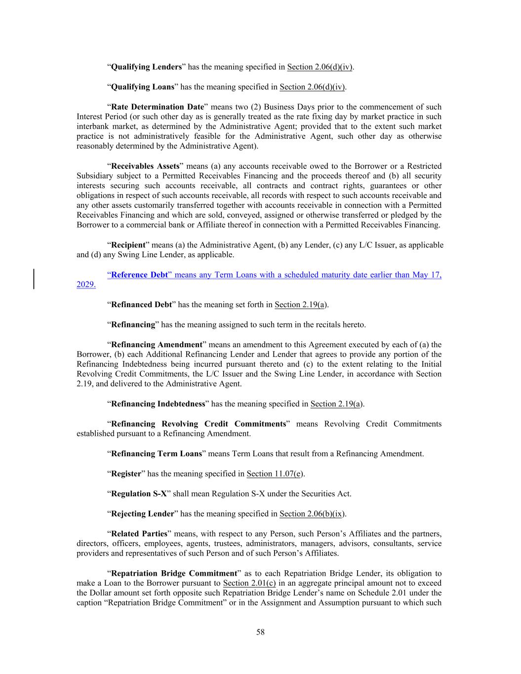 “Qualifying Lenders” has the meaning specified in Section 2.06(d)(iv). “Qualifying Loans” has the meaning specified in Section 2.06(d)(iv). “Rate Determination Date” means two (2) Business Days prior to the commencement of such Interest Period (or such other day as is generally treated as the rate fixing day by market practice in such interbank market, as determined by the Administrative Agent; provided that to the extent such market practice is not administratively feasible for the Administrative Agent, such other day as otherwise reasonably determined by the Administrative Agent). “Receivables Assets” means (a) any accounts receivable owed to the Borrower or a Restricted Subsidiary subject to a Permitted Receivables Financing and the proceeds thereof and (b) all security interests securing such accounts receivable, all contracts and contract rights, guarantees or other obligations in respect of such accounts receivable, all records with respect to such accounts receivable and any other assets customarily transferred together with accounts receivable in connection with a Permitted Receivables Financing and which are sold, conveyed, assigned or otherwise transferred or pledged by the Borrower to a commercial bank or Affiliate thereof in connection with a Permitted Receivables Financing. “Recipient” means (a) the Administrative Agent, (b) any Lender, (c) any L/C Issuer, as applicable and (d) any Swing Line Lender, as applicable. “Reference Debt” means any Term Loans with a scheduled maturity date earlier than May 17, 2029. “Refinanced Debt” has the meaning set forth in Section 2.19(a). “Refinancing” has the meaning assigned to such term in the recitals hereto. “Refinancing Amendment” means an amendment to this Agreement executed by each of (a) the Borrower, (b) each Additional Refinancing Lender and Lender that agrees to provide any portion of the Refinancing Indebtedness being incurred pursuant thereto and (c) to the extent relating to the Initial Revolving Credit Commitments, the L/C Issuer and the Swing Line Lender, in accordance with Section 2.19, and delivered to the Administrative Agent. “Refinancing Indebtedness” has the meaning specified in Section 2.19(a). “Refinancing Revolving Credit Commitments” means Revolving Credit Commitments established pursuant to a Refinancing Amendment. “Refinancing Term Loans” means Term Loans that result from a Refinancing Amendment. “Register” has the meaning specified in Section 11.07(e). “Regulation S-X” shall mean Regulation S-X under the Securities Act. “Rejecting Lender” has the meaning specified in Section 2.06(b)(ix). “Related Parties” means, with respect to any Person, such Person’s Affiliates and the partners, directors, officers, employees, agents, trustees, administrators, managers, advisors, consultants, service providers and representatives of such Person and of such Person’s Affiliates. “Repatriation Bridge Commitment” as to each Repatriation Bridge Lender, its obligation to make a Loan to the Borrower pursuant to Section 2.01(c) in an aggregate principal amount not to exceed the Dollar amount set forth opposite such Repatriation Bridge Lender’s name on Schedule 2.01 under the caption “Repatriation Bridge Commitment” or in the Assignment and Assumption pursuant to which such 58
