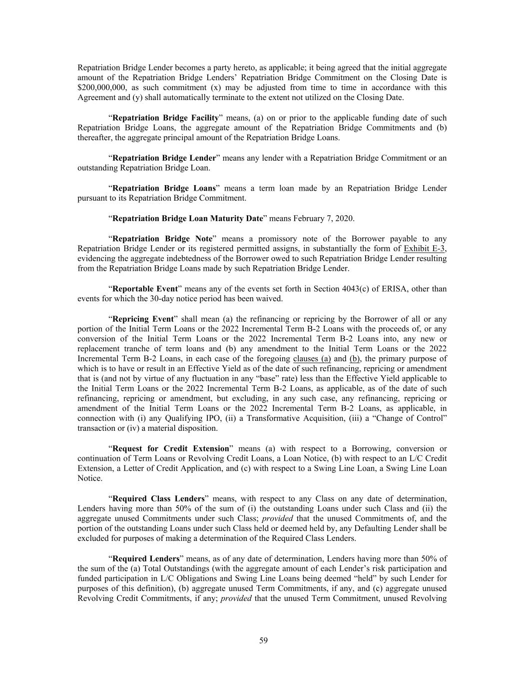 Repatriation Bridge Lender becomes a party hereto, as applicable; it being agreed that the initial aggregate amount of the Repatriation Bridge Lenders’ Repatriation Bridge Commitment on the Closing Date is $200,000,000, as such commitment (x) may be adjusted from time to time in accordance with this Agreement and (y) shall automatically terminate to the extent not utilized on the Closing Date. “Repatriation Bridge Facility” means, (a) on or prior to the applicable funding date of such Repatriation Bridge Loans, the aggregate amount of the Repatriation Bridge Commitments and (b) thereafter, the aggregate principal amount of the Repatriation Bridge Loans. “Repatriation Bridge Lender” means any lender with a Repatriation Bridge Commitment or an outstanding Repatriation Bridge Loan. “Repatriation Bridge Loans” means a term loan made by an Repatriation Bridge Lender pursuant to its Repatriation Bridge Commitment. “Repatriation Bridge Loan Maturity Date” means February 7, 2020. “Repatriation Bridge Note” means a promissory note of the Borrower payable to any Repatriation Bridge Lender or its registered permitted assigns, in substantially the form of Exhibit E-3, evidencing the aggregate indebtedness of the Borrower owed to such Repatriation Bridge Lender resulting from the Repatriation Bridge Loans made by such Repatriation Bridge Lender. “Reportable Event” means any of the events set forth in Section 4043(c) of ERISA, other than events for which the 30-day notice period has been waived. “Repricing Event” shall mean (a) the refinancing or repricing by the Borrower of all or any portion of the Initial Term Loans or the 2022 Incremental Term B-2 Loans with the proceeds of, or any conversion of the Initial Term Loans or the 2022 Incremental Term B-2 Loans into, any new or replacement tranche of term loans and (b) any amendment to the Initial Term Loans or the 2022 Incremental Term B-2 Loans, in each case of the foregoing clauses (a) and (b), the primary purpose of which is to have or result in an Effective Yield as of the date of such refinancing, repricing or amendment that is (and not by virtue of any fluctuation in any “base” rate) less than the Effective Yield applicable to the Initial Term Loans or the 2022 Incremental Term B-2 Loans, as applicable, as of the date of such refinancing, repricing or amendment, but excluding, in any such case, any refinancing, repricing or amendment of the Initial Term Loans or the 2022 Incremental Term B-2 Loans, as applicable, in connection with (i) any Qualifying IPO, (ii) a Transformative Acquisition, (iii) a “Change of Control” transaction or (iv) a material disposition. “Request for Credit Extension” means (a) with respect to a Borrowing, conversion or continuation of Term Loans or Revolving Credit Loans, a Loan Notice, (b) with respect to an L/C Credit Extension, a Letter of Credit Application, and (c) with respect to a Swing Line Loan, a Swing Line Loan Notice. “Required Class Lenders” means, with respect to any Class on any date of determination, Lenders having more than 50% of the sum of (i) the outstanding Loans under such Class and (ii) the aggregate unused Commitments under such Class; provided that the unused Commitments of, and the portion of the outstanding Loans under such Class held or deemed held by, any Defaulting Lender shall be excluded for purposes of making a determination of the Required Class Lenders. “Required Lenders” means, as of any date of determination, Lenders having more than 50% of the sum of the (a) Total Outstandings (with the aggregate amount of each Lender’s risk participation and funded participation in L/C Obligations and Swing Line Loans being deemed “held” by such Lender for purposes of this definition), (b) aggregate unused Term Commitments, if any, and (c) aggregate unused Revolving Credit Commitments, if any; provided that the unused Term Commitment, unused Revolving 59