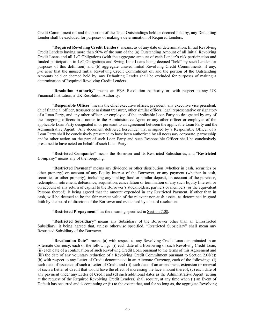 Credit Commitment of, and the portion of the Total Outstandings held or deemed held by, any Defaulting Lender shall be excluded for purposes of making a determination of Required Lenders. “Required Revolving Credit Lenders” means, as of any date of determination, Initial Revolving Credit Lenders having more than 50% of the sum of the (a) Outstanding Amount of all Initial Revolving Credit Loans and all L/C Obligations (with the aggregate amount of each Lender’s risk participation and funded participation in L/C Obligations and Swing Line Loans being deemed “held” by such Lender for purposes of this definition) and (b) aggregate unused Initial Revolving Credit Commitments, if any; provided that the unused Initial Revolving Credit Commitment of, and the portion of the Outstanding Amounts held or deemed held by, any Defaulting Lender shall be excluded for purposes of making a determination of Required Revolving Credit Lenders. “Resolution Authority” means an EEA Resolution Authority or, with respect to any UK Financial Institution, a UK Resolution Authority. “Responsible Officer” means the chief executive officer, president, any executive vice president, chief financial officer, treasurer or assistant treasurer, other similar officer, legal representative or signatory of a Loan Party, and any other officer or employee of the applicable Loan Party so designated by any of the foregoing officers in a notice to the Administrative Agent or any other officer or employee of the applicable Loan Party designated in or pursuant to an agreement between the applicable Loan Party and the Administrative Agent. Any document delivered hereunder that is signed by a Responsible Officer of a Loan Party shall be conclusively presumed to have been authorized by all necessary corporate, partnership and/or other action on the part of such Loan Party and such Responsible Officer shall be conclusively presumed to have acted on behalf of such Loan Party. “Restricted Companies” means the Borrower and its Restricted Subsidiaries, and “Restricted Company” means any of the foregoing. “Restricted Payment” means any dividend or other distribution (whether in cash, securities or other property) on account of any Equity Interest of the Borrower, or any payment (whether in cash, securities or other property), including any sinking fund or similar deposit, on account of the purchase, redemption, retirement, defeasance, acquisition, cancellation or termination of any such Equity Interest, or on account of any return of capital to the Borrower’s stockholders, partners or members (or the equivalent Persons thereof); it being agreed that the amount expended in any Restricted Payment, if other than in cash, will be deemed to be the fair market value of the relevant non-cash assets, as determined in good faith by the board of directors of the Borrower and evidenced by a board resolution. “Restricted Prepayment” has the meaning specified in Section 7.08. “Restricted Subsidiary” means any Subsidiary of the Borrower other than an Unrestricted Subsidiary; it being agreed that, unless otherwise specified, “Restricted Subsidiary” shall mean any Restricted Subsidiary of the Borrower. “Revaluation Date” means (a) with respect to any Revolving Credit Loan denominated in an Alternate Currency, each of the following: (i) each date of a Borrowing of such Revolving Credit Loan, (ii) each date of a continuation of such Revolving Credit Loan pursuant to the terms of this Agreement and (iii) the date of any voluntary reduction of a Revolving Credit Commitment pursuant to Section 2.08(c); (b) with respect to any Letter of Credit denominated in an Alternate Currency, each of the following: (i) each date of issuance of such a Letter of Credit and (ii) each date of an amendment, extension or renewal of such a Letter of Credit that would have the effect of increasing the face amount thereof; (c) each date of any payment under any Letter of Credit and (d) such additional dates as the Administrative Agent (acting at the request of the Required Revolving Credit Lenders) shall require, at any time when (i) an Event of Default has occurred and is continuing or (ii) to the extent that, and for so long as, the aggregate Revolving 60