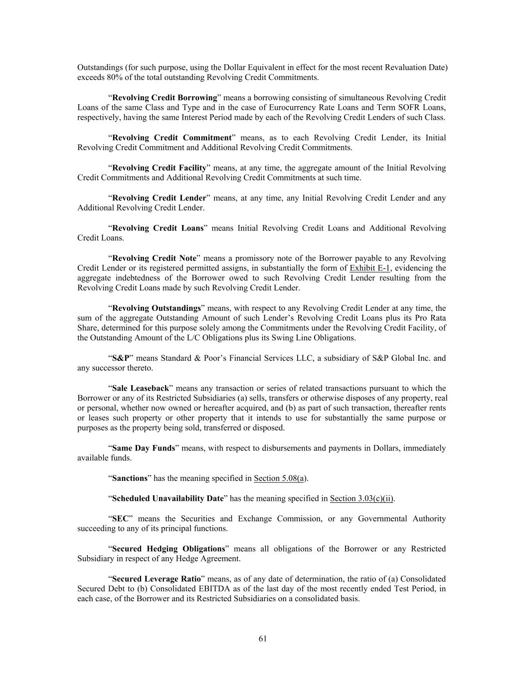 Outstandings (for such purpose, using the Dollar Equivalent in effect for the most recent Revaluation Date) exceeds 80% of the total outstanding Revolving Credit Commitments. “Revolving Credit Borrowing” means a borrowing consisting of simultaneous Revolving Credit Loans of the same Class and Type and in the case of Eurocurrency Rate Loans and Term SOFR Loans, respectively, having the same Interest Period made by each of the Revolving Credit Lenders of such Class. “Revolving Credit Commitment” means, as to each Revolving Credit Lender, its Initial Revolving Credit Commitment and Additional Revolving Credit Commitments. “Revolving Credit Facility” means, at any time, the aggregate amount of the Initial Revolving Credit Commitments and Additional Revolving Credit Commitments at such time. “Revolving Credit Lender” means, at any time, any Initial Revolving Credit Lender and any Additional Revolving Credit Lender. “Revolving Credit Loans” means Initial Revolving Credit Loans and Additional Revolving Credit Loans. “Revolving Credit Note” means a promissory note of the Borrower payable to any Revolving Credit Lender or its registered permitted assigns, in substantially the form of Exhibit E-1, evidencing the aggregate indebtedness of the Borrower owed to such Revolving Credit Lender resulting from the Revolving Credit Loans made by such Revolving Credit Lender. “Revolving Outstandings” means, with respect to any Revolving Credit Lender at any time, the sum of the aggregate Outstanding Amount of such Lender’s Revolving Credit Loans plus its Pro Rata Share, determined for this purpose solely among the Commitments under the Revolving Credit Facility, of the Outstanding Amount of the L/C Obligations plus its Swing Line Obligations. “S&P” means Standard & Poor’s Financial Services LLC, a subsidiary of S&P Global Inc. and any successor thereto. “Sale Leaseback” means any transaction or series of related transactions pursuant to which the Borrower or any of its Restricted Subsidiaries (a) sells, transfers or otherwise disposes of any property, real or personal, whether now owned or hereafter acquired, and (b) as part of such transaction, thereafter rents or leases such property or other property that it intends to use for substantially the same purpose or purposes as the property being sold, transferred or disposed. “Same Day Funds” means, with respect to disbursements and payments in Dollars, immediately available funds. “Sanctions” has the meaning specified in Section 5.08(a). “Scheduled Unavailability Date” has the meaning specified in Section 3.03(c)(ii). “SEC” means the Securities and Exchange Commission, or any Governmental Authority succeeding to any of its principal functions. “Secured Hedging Obligations” means all obligations of the Borrower or any Restricted Subsidiary in respect of any Hedge Agreement. “Secured Leverage Ratio” means, as of any date of determination, the ratio of (a) Consolidated Secured Debt to (b) Consolidated EBITDA as of the last day of the most recently ended Test Period, in each case, of the Borrower and its Restricted Subsidiaries on a consolidated basis. 61