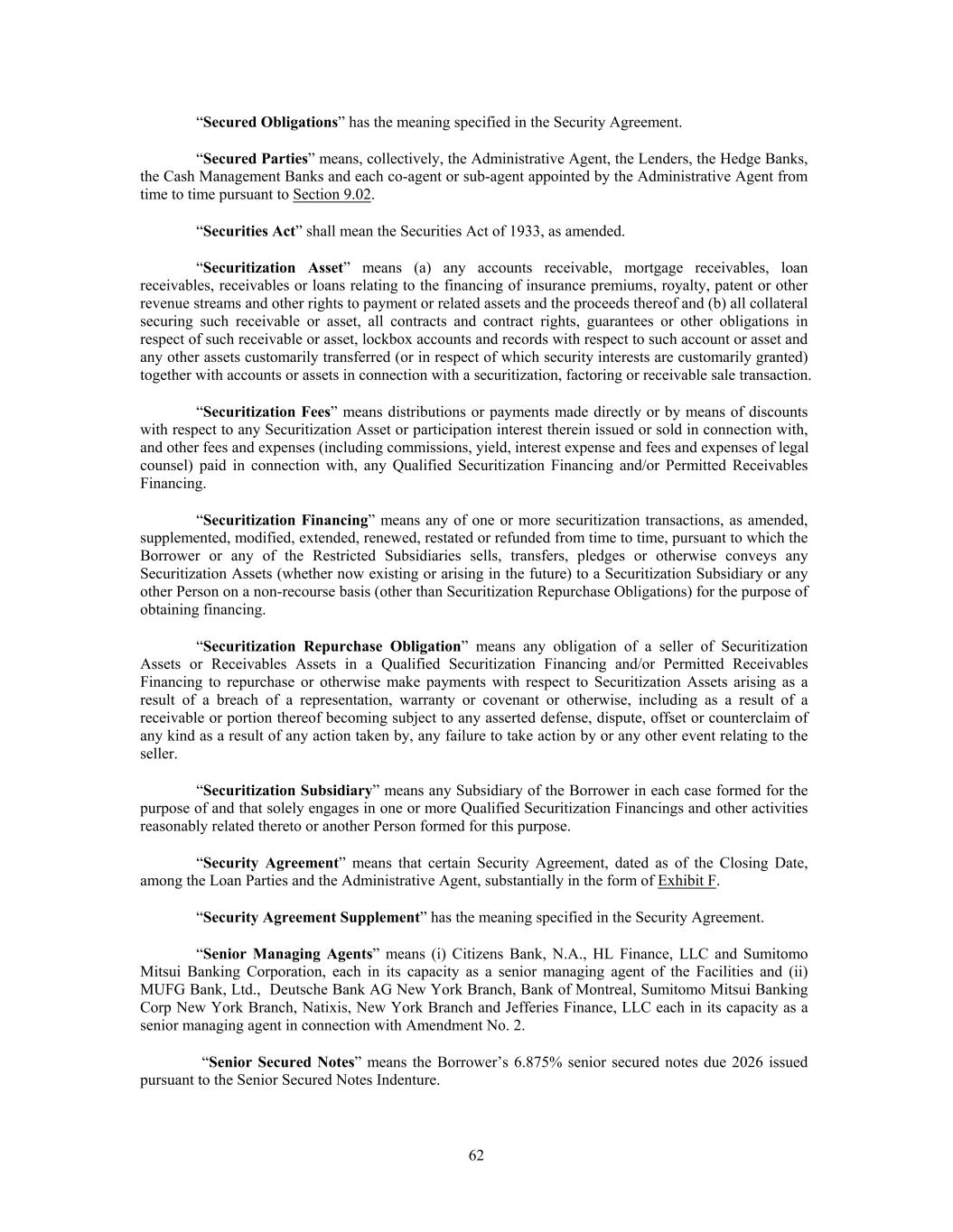 “Secured Obligations” has the meaning specified in the Security Agreement. “Secured Parties” means, collectively, the Administrative Agent, the Lenders, the Hedge Banks, the Cash Management Banks and each co-agent or sub-agent appointed by the Administrative Agent from time to time pursuant to Section 9.02. “Securities Act” shall mean the Securities Act of 1933, as amended. “Securitization Asset” means (a) any accounts receivable, mortgage receivables, loan receivables, receivables or loans relating to the financing of insurance premiums, royalty, patent or other revenue streams and other rights to payment or related assets and the proceeds thereof and (b) all collateral securing such receivable or asset, all contracts and contract rights, guarantees or other obligations in respect of such receivable or asset, lockbox accounts and records with respect to such account or asset and any other assets customarily transferred (or in respect of which security interests are customarily granted) together with accounts or assets in connection with a securitization, factoring or receivable sale transaction. “Securitization Fees” means distributions or payments made directly or by means of discounts with respect to any Securitization Asset or participation interest therein issued or sold in connection with, and other fees and expenses (including commissions, yield, interest expense and fees and expenses of legal counsel) paid in connection with, any Qualified Securitization Financing and/or Permitted Receivables Financing. “Securitization Financing” means any of one or more securitization transactions, as amended, supplemented, modified, extended, renewed, restated or refunded from time to time, pursuant to which the Borrower or any of the Restricted Subsidiaries sells, transfers, pledges or otherwise conveys any Securitization Assets (whether now existing or arising in the future) to a Securitization Subsidiary or any other Person on a non-recourse basis (other than Securitization Repurchase Obligations) for the purpose of obtaining financing. “Securitization Repurchase Obligation” means any obligation of a seller of Securitization Assets or Receivables Assets in a Qualified Securitization Financing and/or Permitted Receivables Financing to repurchase or otherwise make payments with respect to Securitization Assets arising as a result of a breach of a representation, warranty or covenant or otherwise, including as a result of a receivable or portion thereof becoming subject to any asserted defense, dispute, offset or counterclaim of any kind as a result of any action taken by, any failure to take action by or any other event relating to the seller. “Securitization Subsidiary” means any Subsidiary of the Borrower in each case formed for the purpose of and that solely engages in one or more Qualified Securitization Financings and other activities reasonably related thereto or another Person formed for this purpose. “Security Agreement” means that certain Security Agreement, dated as of the Closing Date, among the Loan Parties and the Administrative Agent, substantially in the form of Exhibit F. “Security Agreement Supplement” has the meaning specified in the Security Agreement. “Senior Managing Agents” means (i) Citizens Bank, N.A., HL Finance, LLC and Sumitomo Mitsui Banking Corporation, each in its capacity as a senior managing agent of the Facilities and (ii) MUFG Bank, Ltd., Deutsche Bank AG New York Branch, Bank of Montreal, Sumitomo Mitsui Banking Corp New York Branch, Natixis, New York Branch and Jefferies Finance, LLC each in its capacity as a senior managing agent in connection with Amendment No. 2. “Senior Secured Notes” means the Borrower’s 6.875% senior secured notes due 2026 issued pursuant to the Senior Secured Notes Indenture. 62