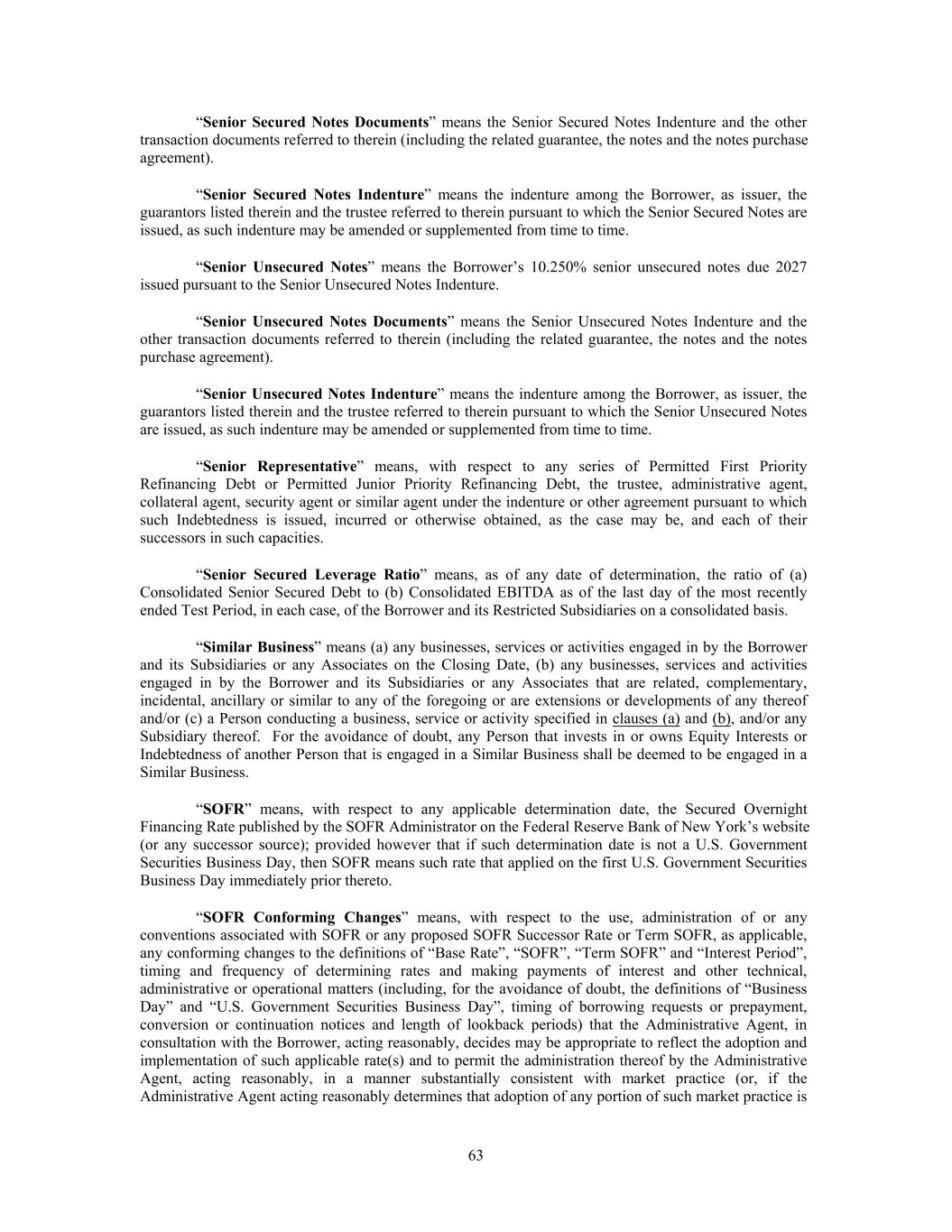 “Senior Secured Notes Documents” means the Senior Secured Notes Indenture and the other transaction documents referred to therein (including the related guarantee, the notes and the notes purchase agreement). “Senior Secured Notes Indenture” means the indenture among the Borrower, as issuer, the guarantors listed therein and the trustee referred to therein pursuant to which the Senior Secured Notes are issued, as such indenture may be amended or supplemented from time to time. “Senior Unsecured Notes” means the Borrower’s 10.250% senior unsecured notes due 2027 issued pursuant to the Senior Unsecured Notes Indenture. “Senior Unsecured Notes Documents” means the Senior Unsecured Notes Indenture and the other transaction documents referred to therein (including the related guarantee, the notes and the notes purchase agreement). “Senior Unsecured Notes Indenture” means the indenture among the Borrower, as issuer, the guarantors listed therein and the trustee referred to therein pursuant to which the Senior Unsecured Notes are issued, as such indenture may be amended or supplemented from time to time. “Senior Representative” means, with respect to any series of Permitted First Priority Refinancing Debt or Permitted Junior Priority Refinancing Debt, the trustee, administrative agent, collateral agent, security agent or similar agent under the indenture or other agreement pursuant to which such Indebtedness is issued, incurred or otherwise obtained, as the case may be, and each of their successors in such capacities. “Senior Secured Leverage Ratio” means, as of any date of determination, the ratio of (a) Consolidated Senior Secured Debt to (b) Consolidated EBITDA as of the last day of the most recently ended Test Period, in each case, of the Borrower and its Restricted Subsidiaries on a consolidated basis. “Similar Business” means (a) any businesses, services or activities engaged in by the Borrower and its Subsidiaries or any Associates on the Closing Date, (b) any businesses, services and activities engaged in by the Borrower and its Subsidiaries or any Associates that are related, complementary, incidental, ancillary or similar to any of the foregoing or are extensions or developments of any thereof and/or (c) a Person conducting a business, service or activity specified in clauses (a) and (b), and/or any Subsidiary thereof. For the avoidance of doubt, any Person that invests in or owns Equity Interests or Indebtedness of another Person that is engaged in a Similar Business shall be deemed to be engaged in a Similar Business. “SOFR” means, with respect to any applicable determination date, the Secured Overnight Financing Rate published by the SOFR Administrator on the Federal Reserve Bank of New York’s website (or any successor source); provided however that if such determination date is not a U.S. Government Securities Business Day, then SOFR means such rate that applied on the first U.S. Government Securities Business Day immediately prior thereto. “SOFR Conforming Changes” means, with respect to the use, administration of or any conventions associated with SOFR or any proposed SOFR Successor Rate or Term SOFR, as applicable, any conforming changes to the definitions of “Base Rate”, “SOFR”, “Term SOFR” and “Interest Period”, timing and frequency of determining rates and making payments of interest and other technical, administrative or operational matters (including, for the avoidance of doubt, the definitions of “Business Day” and “U.S. Government Securities Business Day”, timing of borrowing requests or prepayment, conversion or continuation notices and length of lookback periods) that the Administrative Agent, in consultation with the Borrower, acting reasonably, decides may be appropriate to reflect the adoption and implementation of such applicable rate(s) and to permit the administration thereof by the Administrative Agent, acting reasonably, in a manner substantially consistent with market practice (or, if the Administrative Agent acting reasonably determines that adoption of any portion of such market practice is 63