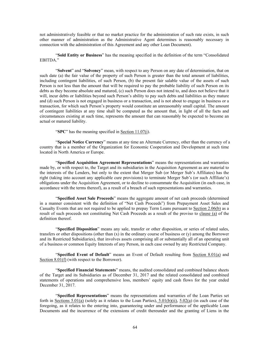 not administratively feasible or that no market practice for the administration of such rate exists, in such other manner of administration as the Administrative Agent determines is reasonably necessary in connection with the administration of this Agreement and any other Loan Document). “Sold Entity or Business” has the meaning specified in the definition of the term “Consolidated EBITDA.” “Solvent” and “Solvency” mean, with respect to any Person on any date of determination, that on such date (a) the fair value of the property of such Person is greater than the total amount of liabilities, including contingent liabilities, of such Person, (b) the present fair salable value of the assets of such Person is not less than the amount that will be required to pay the probable liability of such Person on its debts as they become absolute and matured, (c) such Person does not intend to, and does not believe that it will, incur debts or liabilities beyond such Person’s ability to pay such debts and liabilities as they mature and (d) such Person is not engaged in business or a transaction, and is not about to engage in business or a transaction, for which such Person’s property would constitute an unreasonably small capital. The amount of contingent liabilities at any time shall be computed as the amount that, in light of all the facts and circumstances existing at such time, represents the amount that can reasonably be expected to become an actual or matured liability. “SPC” has the meaning specified in Section 11.07(i). “Special Notice Currency” means at any time an Alternate Currency, other than the currency of a country that is a member of the Organization for Economic Cooperation and Development at such time located in North America or Europe. “Specified Acquisition Agreement Representations” means the representations and warranties made by, or with respect to, the Target and its subsidiaries in the Acquisition Agreement as are material to the interests of the Lenders, but only to the extent that Merger Sub (or Merger Sub’s Affiliates) has the right (taking into account any applicable cure provisions) to terminate Merger Sub’s (or such Affiliate’s) obligations under the Acquisition Agreement, or to decline to consummate the Acquisition (in each case, in accordance with the terms thereof), as a result of a breach of such representations and warranties. “Specified Asset Sale Proceeds” means the aggregate amount of net cash proceeds (determined in a manner consistent with the definition of “Net Cash Proceeds”) from Prepayment Asset Sales and Casualty Events that are not required to be applied to prepay Term Loans pursuant to Section 2.06(b) as a result of such proceeds not constituting Net Cash Proceeds as a result of the proviso to clause (a) of the definition thereof. “Specified Disposition” means any sale, transfer or other disposition, or series of related sales, transfers or other dispositions (other than (x) in the ordinary course of business or (y) among the Borrower and its Restricted Subsidiaries), that involves assets comprising all or substantially all of an operating unit of a business or common Equity Interests of any Person, in each case owned by any Restricted Company. “Specified Event of Default” means an Event of Default resulting from Section 8.01(a) and Section 8.01(f) (with respect to the Borrower). “Specified Financial Statements” means, the audited consolidated and combined balance sheets of the Target and its Subsidiaries as of December 31, 2017 and the related consolidated and combined statements of operations and comprehensive loss, members’ equity and cash flows for the year ended December 31, 2017. “Specified Representations” means the representations and warranties of the Loan Parties set forth in Sections 5.01(a) (solely as it relates to the Loan Parties), 5.01(b)(ii), 5.02(a) (in each case of the foregoing, as it relates to the entering into, guaranteeing under and performance of the applicable Loan Documents and the incurrence of the extensions of credit thereunder and the granting of Liens in the 64