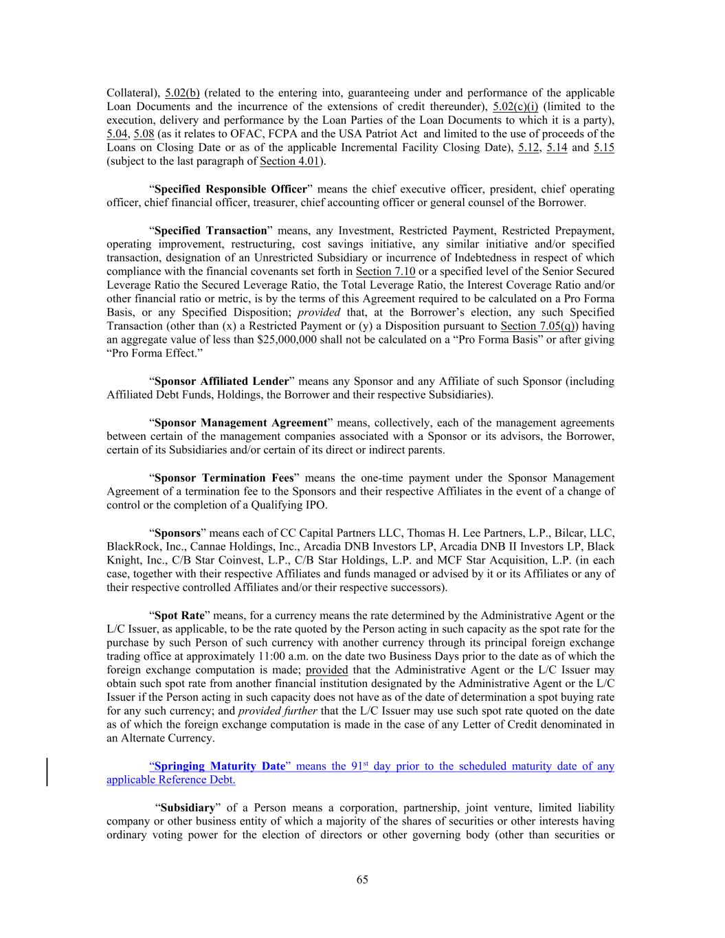 Collateral), 5.02(b) (related to the entering into, guaranteeing under and performance of the applicable Loan Documents and the incurrence of the extensions of credit thereunder), 5.02(c)(i) (limited to the execution, delivery and performance by the Loan Parties of the Loan Documents to which it is a party), 5.04, 5.08 (as it relates to OFAC, FCPA and the USA Patriot Act and limited to the use of proceeds of the Loans on Closing Date or as of the applicable Incremental Facility Closing Date), 5.12, 5.14 and 5.15 (subject to the last paragraph of Section 4.01). “Specified Responsible Officer” means the chief executive officer, president, chief operating officer, chief financial officer, treasurer, chief accounting officer or general counsel of the Borrower. “Specified Transaction” means, any Investment, Restricted Payment, Restricted Prepayment, operating improvement, restructuring, cost savings initiative, any similar initiative and/or specified transaction, designation of an Unrestricted Subsidiary or incurrence of Indebtedness in respect of which compliance with the financial covenants set forth in Section 7.10 or a specified level of the Senior Secured Leverage Ratio the Secured Leverage Ratio, the Total Leverage Ratio, the Interest Coverage Ratio and/or other financial ratio or metric, is by the terms of this Agreement required to be calculated on a Pro Forma Basis, or any Specified Disposition; provided that, at the Borrower’s election, any such Specified Transaction (other than (x) a Restricted Payment or (y) a Disposition pursuant to Section 7.05(q)) having an aggregate value of less than $25,000,000 shall not be calculated on a “Pro Forma Basis” or after giving “Pro Forma Effect.” “Sponsor Affiliated Lender” means any Sponsor and any Affiliate of such Sponsor (including Affiliated Debt Funds, Holdings, the Borrower and their respective Subsidiaries). “Sponsor Management Agreement” means, collectively, each of the management agreements between certain of the management companies associated with a Sponsor or its advisors, the Borrower, certain of its Subsidiaries and/or certain of its direct or indirect parents. “Sponsor Termination Fees” means the one-time payment under the Sponsor Management Agreement of a termination fee to the Sponsors and their respective Affiliates in the event of a change of control or the completion of a Qualifying IPO. “Sponsors” means each of CC Capital Partners LLC, Thomas H. Lee Partners, L.P., Bilcar, LLC, BlackRock, Inc., Cannae Holdings, Inc., Arcadia DNB Investors LP, Arcadia DNB II Investors LP, Black Knight, Inc., C/B Star Coinvest, L.P., C/B Star Holdings, L.P. and MCF Star Acquisition, L.P. (in each case, together with their respective Affiliates and funds managed or advised by it or its Affiliates or any of their respective controlled Affiliates and/or their respective successors). “Spot Rate” means, for a currency means the rate determined by the Administrative Agent or the L/C Issuer, as applicable, to be the rate quoted by the Person acting in such capacity as the spot rate for the purchase by such Person of such currency with another currency through its principal foreign exchange trading office at approximately 11:00 a.m. on the date two Business Days prior to the date as of which the foreign exchange computation is made; provided that the Administrative Agent or the L/C Issuer may obtain such spot rate from another financial institution designated by the Administrative Agent or the L/C Issuer if the Person acting in such capacity does not have as of the date of determination a spot buying rate for any such currency; and provided further that the L/C Issuer may use such spot rate quoted on the date as of which the foreign exchange computation is made in the case of any Letter of Credit denominated in an Alternate Currency. “Springing Maturity Date” means the 91st day prior to the scheduled maturity date of any applicable Reference Debt. “Subsidiary” of a Person means a corporation, partnership, joint venture, limited liability company or other business entity of which a majority of the shares of securities or other interests having ordinary voting power for the election of directors or other governing body (other than securities or 65