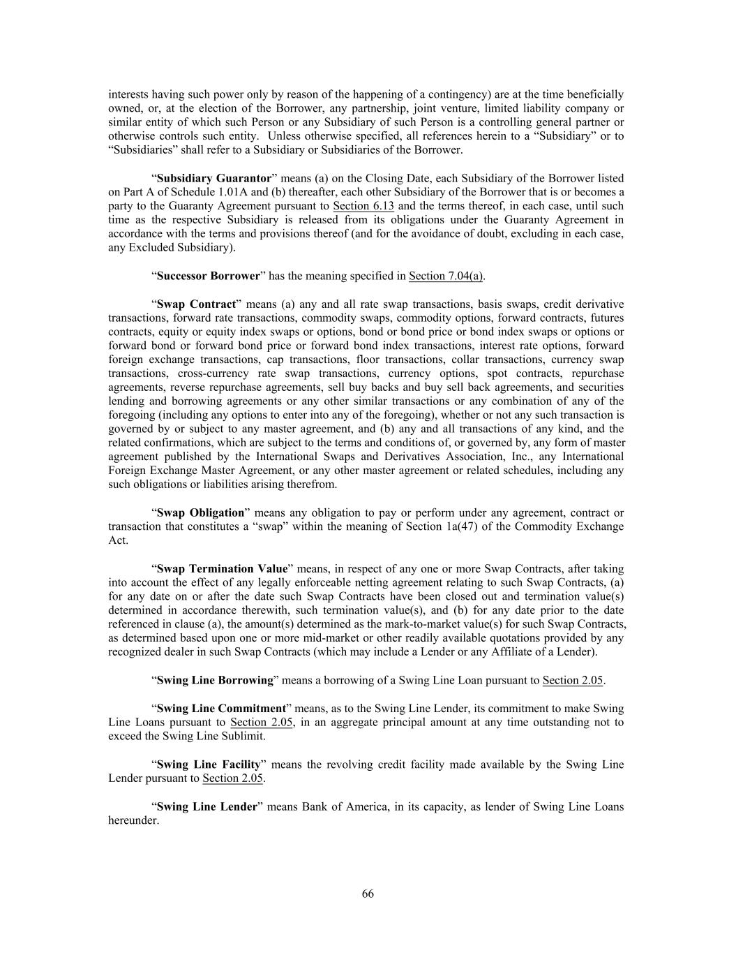 interests having such power only by reason of the happening of a contingency) are at the time beneficially owned, or, at the election of the Borrower, any partnership, joint venture, limited liability company or similar entity of which such Person or any Subsidiary of such Person is a controlling general partner or otherwise controls such entity. Unless otherwise specified, all references herein to a “Subsidiary” or to “Subsidiaries” shall refer to a Subsidiary or Subsidiaries of the Borrower. “Subsidiary Guarantor” means (a) on the Closing Date, each Subsidiary of the Borrower listed on Part A of Schedule 1.01A and (b) thereafter, each other Subsidiary of the Borrower that is or becomes a party to the Guaranty Agreement pursuant to Section 6.13 and the terms thereof, in each case, until such time as the respective Subsidiary is released from its obligations under the Guaranty Agreement in accordance with the terms and provisions thereof (and for the avoidance of doubt, excluding in each case, any Excluded Subsidiary). “Successor Borrower” has the meaning specified in Section 7.04(a). “Swap Contract” means (a) any and all rate swap transactions, basis swaps, credit derivative transactions, forward rate transactions, commodity swaps, commodity options, forward contracts, futures contracts, equity or equity index swaps or options, bond or bond price or bond index swaps or options or forward bond or forward bond price or forward bond index transactions, interest rate options, forward foreign exchange transactions, cap transactions, floor transactions, collar transactions, currency swap transactions, cross-currency rate swap transactions, currency options, spot contracts, repurchase agreements, reverse repurchase agreements, sell buy backs and buy sell back agreements, and securities lending and borrowing agreements or any other similar transactions or any combination of any of the foregoing (including any options to enter into any of the foregoing), whether or not any such transaction is governed by or subject to any master agreement, and (b) any and all transactions of any kind, and the related confirmations, which are subject to the terms and conditions of, or governed by, any form of master agreement published by the International Swaps and Derivatives Association, Inc., any International Foreign Exchange Master Agreement, or any other master agreement or related schedules, including any such obligations or liabilities arising therefrom. “Swap Obligation” means any obligation to pay or perform under any agreement, contract or transaction that constitutes a “swap” within the meaning of Section 1a(47) of the Commodity Exchange Act. “Swap Termination Value” means, in respect of any one or more Swap Contracts, after taking into account the effect of any legally enforceable netting agreement relating to such Swap Contracts, (a) for any date on or after the date such Swap Contracts have been closed out and termination value(s) determined in accordance therewith, such termination value(s), and (b) for any date prior to the date referenced in clause (a), the amount(s) determined as the mark-to-market value(s) for such Swap Contracts, as determined based upon one or more mid-market or other readily available quotations provided by any recognized dealer in such Swap Contracts (which may include a Lender or any Affiliate of a Lender). “Swing Line Borrowing” means a borrowing of a Swing Line Loan pursuant to Section 2.05. “Swing Line Commitment” means, as to the Swing Line Lender, its commitment to make Swing Line Loans pursuant to Section 2.05, in an aggregate principal amount at any time outstanding not to exceed the Swing Line Sublimit. “Swing Line Facility” means the revolving credit facility made available by the Swing Line Lender pursuant to Section 2.05. “Swing Line Lender” means Bank of America, in its capacity, as lender of Swing Line Loans hereunder. 66
