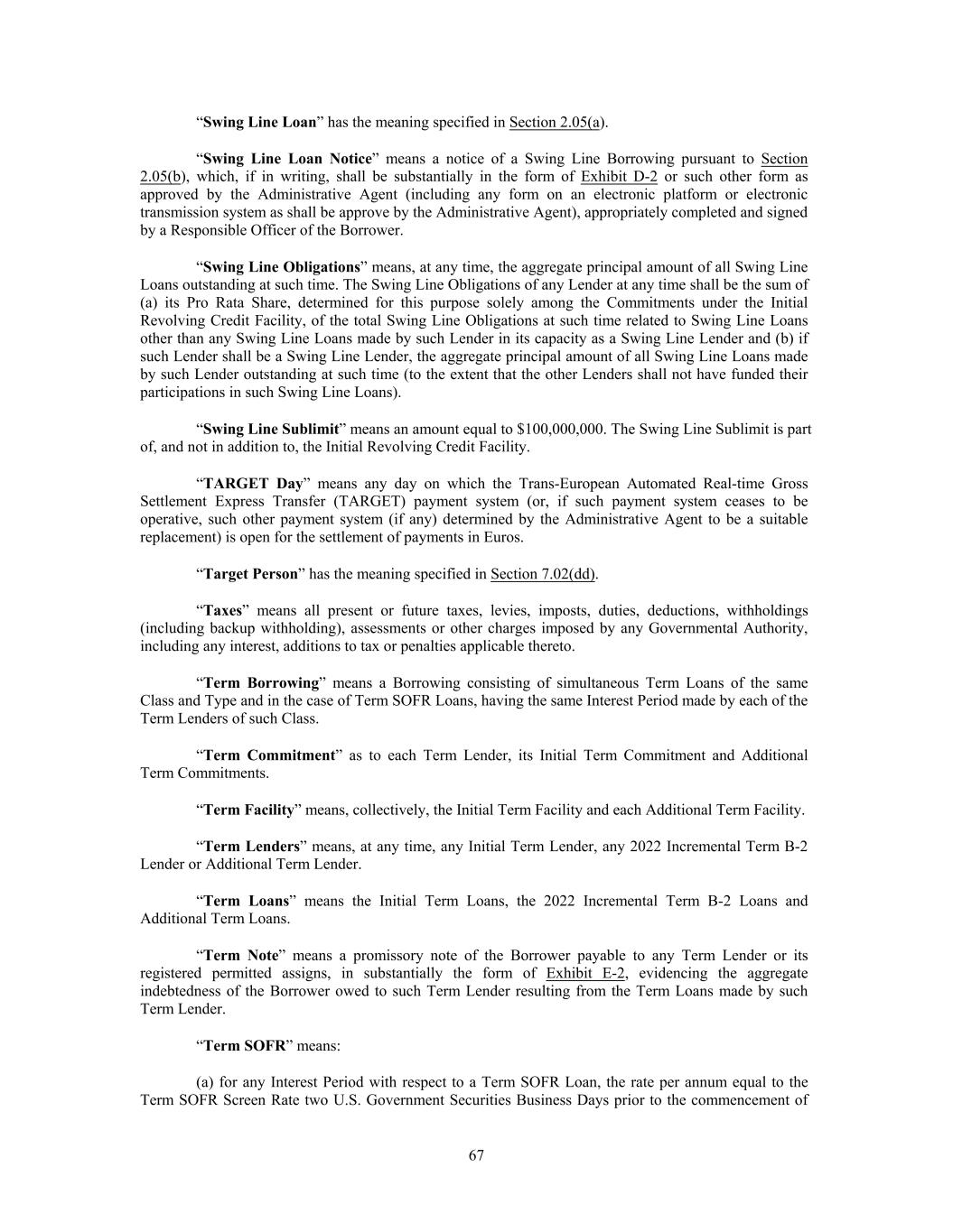 “Swing Line Loan” has the meaning specified in Section 2.05(a). “Swing Line Loan Notice” means a notice of a Swing Line Borrowing pursuant to Section 2.05(b), which, if in writing, shall be substantially in the form of Exhibit D-2 or such other form as approved by the Administrative Agent (including any form on an electronic platform or electronic transmission system as shall be approve by the Administrative Agent), appropriately completed and signed by a Responsible Officer of the Borrower. “Swing Line Obligations” means, at any time, the aggregate principal amount of all Swing Line Loans outstanding at such time. The Swing Line Obligations of any Lender at any time shall be the sum of (a) its Pro Rata Share, determined for this purpose solely among the Commitments under the Initial Revolving Credit Facility, of the total Swing Line Obligations at such time related to Swing Line Loans other than any Swing Line Loans made by such Lender in its capacity as a Swing Line Lender and (b) if such Lender shall be a Swing Line Lender, the aggregate principal amount of all Swing Line Loans made by such Lender outstanding at such time (to the extent that the other Lenders shall not have funded their participations in such Swing Line Loans). “Swing Line Sublimit” means an amount equal to $100,000,000. The Swing Line Sublimit is part of, and not in addition to, the Initial Revolving Credit Facility. “TARGET Day” means any day on which the Trans-European Automated Real-time Gross Settlement Express Transfer (TARGET) payment system (or, if such payment system ceases to be operative, such other payment system (if any) determined by the Administrative Agent to be a suitable replacement) is open for the settlement of payments in Euros. “Target Person” has the meaning specified in Section 7.02(dd). “Taxes” means all present or future taxes, levies, imposts, duties, deductions, withholdings (including backup withholding), assessments or other charges imposed by any Governmental Authority, including any interest, additions to tax or penalties applicable thereto. “Term Borrowing” means a Borrowing consisting of simultaneous Term Loans of the same Class and Type and in the case of Term SOFR Loans, having the same Interest Period made by each of the Term Lenders of such Class. “Term Commitment” as to each Term Lender, its Initial Term Commitment and Additional Term Commitments. “Term Facility” means, collectively, the Initial Term Facility and each Additional Term Facility. “Term Lenders” means, at any time, any Initial Term Lender, any 2022 Incremental Term B-2 Lender or Additional Term Lender. “Term Loans” means the Initial Term Loans, the 2022 Incremental Term B-2 Loans and Additional Term Loans. “Term Note” means a promissory note of the Borrower payable to any Term Lender or its registered permitted assigns, in substantially the form of Exhibit E-2, evidencing the aggregate indebtedness of the Borrower owed to such Term Lender resulting from the Term Loans made by such Term Lender. “Term SOFR” means: (a) for any Interest Period with respect to a Term SOFR Loan, the rate per annum equal to the Term SOFR Screen Rate two U.S. Government Securities Business Days prior to the commencement of 67