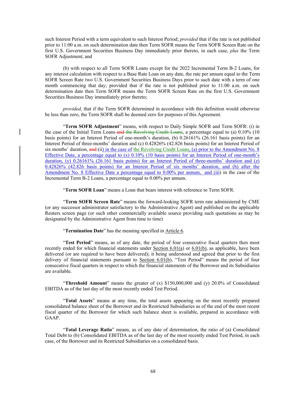 such Interest Period with a term equivalent to such Interest Period; provided that if the rate is not published prior to 11:00 a.m. on such determination date then Term SOFR means the Term SOFR Screen Rate on the first U.S. Government Securities Business Day immediately prior thereto, in each case, plus the Term SOFR Adjustment; and (b) with respect to all Term SOFR Loans except for the 2022 Incremental Term B-2 Loans, for any interest calculation with respect to a Base Rate Loan on any date, the rate per annum equal to the Term SOFR Screen Rate two U.S. Government Securities Business Days prior to such date with a term of one month commencing that day; provided that if the rate is not published prior to 11:00 a.m. on such determination date then Term SOFR means the Term SOFR Screen Rate on the first U.S. Government Securities Business Day immediately prior thereto; provided, that if the Term SOFR determined in accordance with this definition would otherwise be less than zero, the Term SOFR shall be deemed zero for purposes of this Agreement. “Term SOFR Adjustment” means, with respect to Daily Simple SOFR and Term SOFR: (i) in the case of the Initial Term Loans and the Revolving Credit Loans, a percentage equal to (a) 0.10% (10 basis points) for an Interest Period of one-month’s duration, (b) 0.26161% (26.161 basis points) for an Interest Period of three-months’ duration and (c) 0.42826% (42.826 basis points) for an Interest Period of six months’ duration, and (ii) in the case of the Revolving Credit Loans, (a) prior to the Amendment No. 8 Effective Date, a percentage equal to (x) 0.10% (10 basis points) for an Interest Period of one-month’s duration, (y) 0.26161% (26.161 basis points) for an Interest Period of three-months’ duration and (z) 0.42826% (42.826 basis points) for an Interest Period of six months’ duration, and (b) after the Amendment No. 8 Effective Date a percentage equal to 0.00% per annum, and (iii) in the case of the Incremental Term B-2 Loans, a percentage equal to 0.00% per annum. “Term SOFR Loan” means a Loan that bears interest with reference to Term SOFR. “Term SOFR Screen Rate” means the forward-looking SOFR term rate administered by CME (or any successor administrator satisfactory to the Administrative Agent) and published on the applicable Reuters screen page (or such other commercially available source providing such quotations as may be designated by the Administrative Agent from time to time) “Termination Date” has the meaning specified in Article 6. “Test Period” means, as of any date, the period of four consecutive fiscal quarters then most recently ended for which financial statements under Section 6.01(a) or 6.01(b), as applicable, have been delivered (or are required to have been delivered); it being understood and agreed that prior to the first delivery of financial statements pursuant to Section 6.01(b), “Test Period” means the period of four consecutive fiscal quarters in respect to which the financial statements of the Borrower and its Subsidiaries are available. “Threshold Amount” means the greater of (x) $150,000,000 and (y) 20.0% of Consolidated EBITDA as of the last day of the most recently ended Test Period. “Total Assets” means at any time, the total assets appearing on the most recently prepared consolidated balance sheet of the Borrower and its Restricted Subsidiaries as of the end of the most recent fiscal quarter of the Borrower for which such balance sheet is available, prepared in accordance with GAAP. “Total Leverage Ratio” means, as of any date of determination, the ratio of (a) Consolidated Total Debt to (b) Consolidated EBITDA as of the last day of the most recently ended Test Period, in each case, of the Borrower and its Restricted Subsidiaries on a consolidated basis. 68