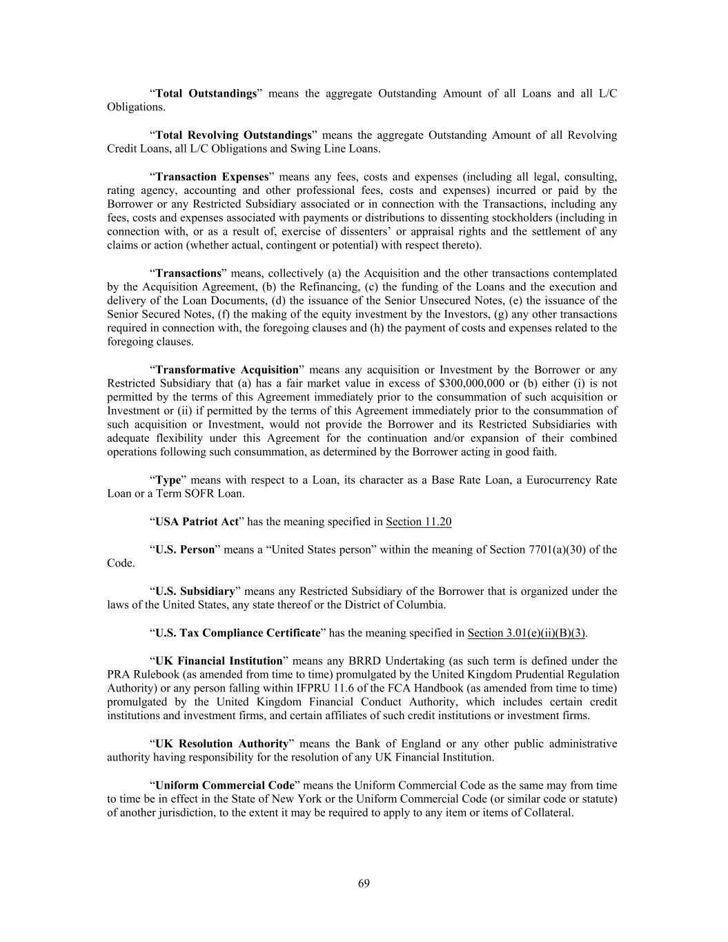 “Total Outstandings” means the aggregate Outstanding Amount of all Loans and all L/C Obligations. “Total Revolving Outstandings” means the aggregate Outstanding Amount of all Revolving Credit Loans, all L/C Obligations and Swing Line Loans. “Transaction Expenses” means any fees, costs and expenses (including all legal, consulting, rating agency, accounting and other professional fees, costs and expenses) incurred or paid by the Borrower or any Restricted Subsidiary associated or in connection with the Transactions, including any fees, costs and expenses associated with payments or distributions to dissenting stockholders (including in connection with, or as a result of, exercise of dissenters’ or appraisal rights and the settlement of any claims or action (whether actual, contingent or potential) with respect thereto). “Transactions” means, collectively (a) the Acquisition and the other transactions contemplated by the Acquisition Agreement, (b) the Refinancing, (c) the funding of the Loans and the execution and delivery of the Loan Documents, (d) the issuance of the Senior Unsecured Notes, (e) the issuance of the Senior Secured Notes, (f) the making of the equity investment by the Investors, (g) any other transactions required in connection with, the foregoing clauses and (h) the payment of costs and expenses related to the foregoing clauses. “Transformative Acquisition” means any acquisition or Investment by the Borrower or any Restricted Subsidiary that (a) has a fair market value in excess of $300,000,000 or (b) either (i) is not permitted by the terms of this Agreement immediately prior to the consummation of such acquisition or Investment or (ii) if permitted by the terms of this Agreement immediately prior to the consummation of such acquisition or Investment, would not provide the Borrower and its Restricted Subsidiaries with adequate flexibility under this Agreement for the continuation and/or expansion of their combined operations following such consummation, as determined by the Borrower acting in good faith. “Type” means with respect to a Loan, its character as a Base Rate Loan, a Eurocurrency Rate Loan or a Term SOFR Loan. “USA Patriot Act” has the meaning specified in Section 11.20 “U.S. Person” means a “United States person” within the meaning of Section 7701(a)(30) of the Code. “U.S. Subsidiary” means any Restricted Subsidiary of the Borrower that is organized under the laws of the United States, any state thereof or the District of Columbia. “U.S. Tax Compliance Certificate” has the meaning specified in Section 3.01(e)(ii)(B)(3). “UK Financial Institution” means any BRRD Undertaking (as such term is defined under the PRA Rulebook (as amended from time to time) promulgated by the United Kingdom Prudential Regulation Authority) or any person falling within IFPRU 11.6 of the FCA Handbook (as amended from time to time) promulgated by the United Kingdom Financial Conduct Authority, which includes certain credit institutions and investment firms, and certain affiliates of such credit institutions or investment firms. “UK Resolution Authority” means the Bank of England or any other public administrative authority having responsibility for the resolution of any UK Financial Institution. “Uniform Commercial Code” means the Uniform Commercial Code as the same may from time to time be in effect in the State of New York or the Uniform Commercial Code (or similar code or statute) of another jurisdiction, to the extent it may be required to apply to any item or items of Collateral. 69