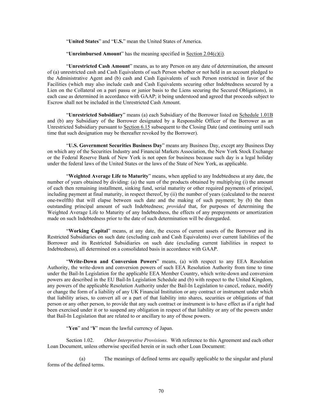 “United States” and “U.S.” mean the United States of America. “Unreimbursed Amount” has the meaning specified in Section 2.04(c)(i). “Unrestricted Cash Amount” means, as to any Person on any date of determination, the amount of (a) unrestricted cash and Cash Equivalents of such Person whether or not held in an account pledged to the Administrative Agent and (b) cash and Cash Equivalents of such Person restricted in favor of the Facilities (which may also include cash and Cash Equivalents securing other Indebtedness secured by a Lien on the Collateral on a pari passu or junior basis to the Liens securing the Secured Obligations), in each case as determined in accordance with GAAP; it being understood and agreed that proceeds subject to Escrow shall not be included in the Unrestricted Cash Amount. “Unrestricted Subsidiary” means (a) each Subsidiary of the Borrower listed on Schedule 1.01B and (b) any Subsidiary of the Borrower designated by a Responsible Officer of the Borrower as an Unrestricted Subsidiary pursuant to Section 6.15 subsequent to the Closing Date (and continuing until such time that such designation may be thereafter revoked by the Borrower). “U.S. Government Securities Business Day” means any Business Day, except any Business Day on which any of the Securities Industry and Financial Markets Association, the New York Stock Exchange or the Federal Reserve Bank of New York is not open for business because such day is a legal holiday under the federal laws of the United States or the laws of the State of New York, as applicable. “Weighted Average Life to Maturity” means, when applied to any Indebtedness at any date, the number of years obtained by dividing: (a) the sum of the products obtained by multiplying (i) the amount of each then remaining installment, sinking fund, serial maturity or other required payments of principal, including payment at final maturity, in respect thereof, by (ii) the number of years (calculated to the nearest one-twelfth) that will elapse between such date and the making of such payment; by (b) the then outstanding principal amount of such Indebtedness; provided that, for purposes of determining the Weighted Average Life to Maturity of any Indebtedness, the effects of any prepayments or amortization made on such Indebtedness prior to the date of such determination will be disregarded. “Working Capital” means, at any date, the excess of current assets of the Borrower and its Restricted Subsidiaries on such date (excluding cash and Cash Equivalents) over current liabilities of the Borrower and its Restricted Subsidiaries on such date (excluding current liabilities in respect to Indebtedness), all determined on a consolidated basis in accordance with GAAP. “Write-Down and Conversion Powers” means, (a) with respect to any EEA Resolution Authority, the write-down and conversion powers of such EEA Resolution Authority from time to time under the Bail-In Legislation for the applicable EEA Member Country, which write-down and conversion powers are described in the EU Bail-In Legislation Schedule and (b) with respect to the United Kingdom, any powers of the applicable Resolution Authority under the Bail-In Legislation to cancel, reduce, modify or change the form of a liability of any UK Financial Institution or any contract or instrument under which that liability arises, to convert all or a part of that liability into shares, securities or obligations of that person or any other person, to provide that any such contract or instrument is to have effect as if a right had been exercised under it or to suspend any obligation in respect of that liability or any of the powers under that Bail-In Legislation that are related to or ancillary to any of those powers. “Yen” and “¥” mean the lawful currency of Japan. Section 1.02. Other Interpretive Provisions. With reference to this Agreement and each other Loan Document, unless otherwise specified herein or in such other Loan Document: (a) The meanings of defined terms are equally applicable to the singular and plural forms of the defined terms. 70