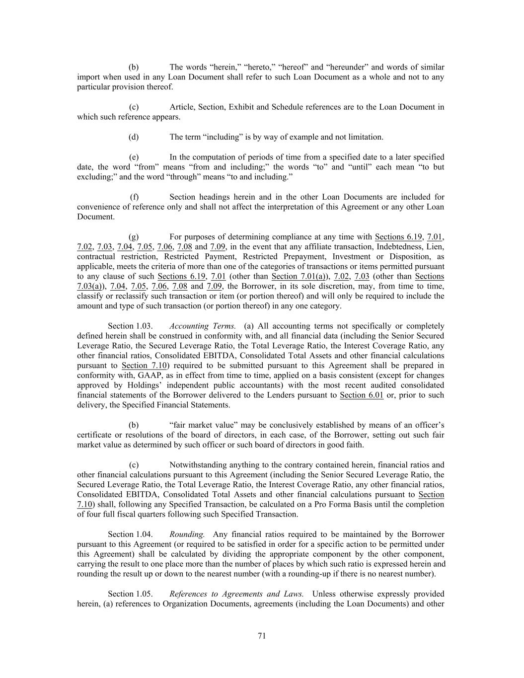 (b) The words “herein,” “hereto,” “hereof” and “hereunder” and words of similar import when used in any Loan Document shall refer to such Loan Document as a whole and not to any particular provision thereof. (c) Article, Section, Exhibit and Schedule references are to the Loan Document in which such reference appears. (d) The term “including” is by way of example and not limitation. (e) In the computation of periods of time from a specified date to a later specified date, the word “from” means “from and including;” the words “to” and “until” each mean “to but excluding;” and the word “through” means “to and including.” (f) Section headings herein and in the other Loan Documents are included for convenience of reference only and shall not affect the interpretation of this Agreement or any other Loan Document. (g) For purposes of determining compliance at any time with Sections 6.19, 7.01, 7.02, 7.03, 7.04, 7.05, 7.06, 7.08 and 7.09, in the event that any affiliate transaction, Indebtedness, Lien, contractual restriction, Restricted Payment, Restricted Prepayment, Investment or Disposition, as applicable, meets the criteria of more than one of the categories of transactions or items permitted pursuant to any clause of such Sections 6.19, 7.01 (other than Section 7.01(a)), 7.02, 7.03 (other than Sections 7.03(a)), 7.04, 7.05, 7.06, 7.08 and 7.09, the Borrower, in its sole discretion, may, from time to time, classify or reclassify such transaction or item (or portion thereof) and will only be required to include the amount and type of such transaction (or portion thereof) in any one category. Section 1.03. Accounting Terms. (a) All accounting terms not specifically or completely defined herein shall be construed in conformity with, and all financial data (including the Senior Secured Leverage Ratio, the Secured Leverage Ratio, the Total Leverage Ratio, the Interest Coverage Ratio, any other financial ratios, Consolidated EBITDA, Consolidated Total Assets and other financial calculations pursuant to Section 7.10) required to be submitted pursuant to this Agreement shall be prepared in conformity with, GAAP, as in effect from time to time, applied on a basis consistent (except for changes approved by Holdings’ independent public accountants) with the most recent audited consolidated financial statements of the Borrower delivered to the Lenders pursuant to Section 6.01 or, prior to such delivery, the Specified Financial Statements. (b) “fair market value” may be conclusively established by means of an officer’s certificate or resolutions of the board of directors, in each case, of the Borrower, setting out such fair market value as determined by such officer or such board of directors in good faith. (c) Notwithstanding anything to the contrary contained herein, financial ratios and other financial calculations pursuant to this Agreement (including the Senior Secured Leverage Ratio, the Secured Leverage Ratio, the Total Leverage Ratio, the Interest Coverage Ratio, any other financial ratios, Consolidated EBITDA, Consolidated Total Assets and other financial calculations pursuant to Section 7.10) shall, following any Specified Transaction, be calculated on a Pro Forma Basis until the completion of four full fiscal quarters following such Specified Transaction. Section 1.04. Rounding. Any financial ratios required to be maintained by the Borrower pursuant to this Agreement (or required to be satisfied in order for a specific action to be permitted under this Agreement) shall be calculated by dividing the appropriate component by the other component, carrying the result to one place more than the number of places by which such ratio is expressed herein and rounding the result up or down to the nearest number (with a rounding-up if there is no nearest number). Section 1.05. References to Agreements and Laws. Unless otherwise expressly provided herein, (a) references to Organization Documents, agreements (including the Loan Documents) and other 71