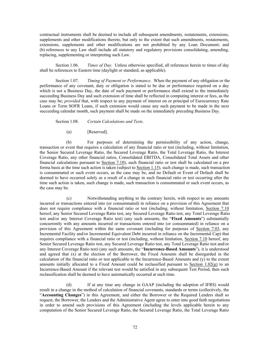contractual instruments shall be deemed to include all subsequent amendments, restatements, extensions, supplements and other modifications thereto, but only to the extent that such amendments, restatements, extensions, supplements and other modifications are not prohibited by any Loan Document; and (b) references to any Law shall include all statutory and regulatory provisions consolidating, amending, replacing, supplementing or interpreting such Law. Section 1.06. Times of Day. Unless otherwise specified, all references herein to times of day shall be references to Eastern time (daylight or standard, as applicable). Section 1.07. Timing of Payment or Performance. When the payment of any obligation or the performance of any covenant, duty or obligation is stated to be due or performance required on a day which is not a Business Day, the date of such payment or performance shall extend to the immediately succeeding Business Day and such extension of time shall be reflected in computing interest or fees, as the case may be; provided that, with respect to any payment of interest on or principal of Eurocurrency Rate Loans or Term SOFR Loans, if such extension would cause any such payment to be made in the next succeeding calendar month, such payment shall be made on the immediately preceding Business Day. Section 1.08. Certain Calculations and Tests. (a) [Reserved]. (b) For purposes of determining the permissibility of any action, change, transaction or event that requires a calculation of any financial ratio or test (including, without limitation, the Senior Secured Leverage Ratio, the Secured Leverage Ratio, the Total Leverage Ratio, the Interest Coverage Ratio, any other financial ratios, Consolidated EBITDA, Consolidated Total Assets and other financial calculations pursuant to Section 7.10), such financial ratio or test shall be calculated on a pro forma basis at the time such action is taken (subject to Section 1.15), such change is made, such transaction is consummated or such event occurs, as the case may be, and no Default or Event of Default shall be deemed to have occurred solely as a result of a change in such financial ratio or test occurring after the time such action is taken, such change is made, such transaction is consummated or such event occurs, as the case may be. (c) Notwithstanding anything to the contrary herein, with respect to any amounts incurred or transactions entered into (or consummated) in reliance on a provision of this Agreement that does not require compliance with a financial ratio or test (including, without limitation, Section 7.10 hereof, any Senior Secured Leverage Ratio test, any Secured Leverage Ratio test, any Total Leverage Ratio test and/or any Interest Coverage Ratio test) (any such amounts, the “Fixed Amounts”) substantially concurrently with any amounts incurred or transactions entered into (or consummated) in reliance on a provision of this Agreement within the same covenant (including for purposes of Section 7.03, any Incremental Facility and/or Incremental Equivalent Debt incurred in reliance on the Incremental Cap) that requires compliance with a financial ratio or test (including, without limitation, Section 7.10 hereof, any Senior Secured Leverage Ratio test, any Secured Leverage Ratio test, any Total Leverage Ratio test and/or any Interest Coverage Ratio test) (any such amounts, the “Incurrence-Based Amounts”), it is understood and agreed that (x) at the election of the Borrower, the Fixed Amounts shall be disregarded in the calculation of the financial ratio or test applicable to the Incurrence-Based Amounts and (y) to the extent amounts initially allocated to a Fixed Amount could be reclassified pursuant to Section 1.02(g) to an Incurrence-Based Amount if the relevant test would be satisfied in any subsequent Test Period, then such reclassification shall be deemed to have automatically occurred at such time. (d) If at any time any change in GAAP (including the adoption of IFRS) would result in a change in the method of calculation of financial covenants, standards or terms (collectively, the “Accounting Changes”) in this Agreement, and either the Borrower or the Required Lenders shall so request, the Borrower, the Lenders and the Administrative Agent agree to enter into good faith negotiations in order to amend such provisions of this Agreement (including the levels applicable herein to any computation of the Senior Secured Leverage Ratio, the Secured Leverage Ratio, the Total Leverage Ratio 72