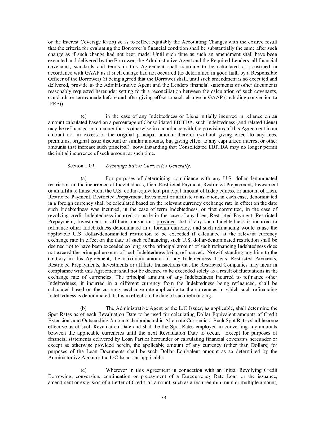 or the Interest Coverage Ratio) so as to reflect equitably the Accounting Changes with the desired result that the criteria for evaluating the Borrower’s financial condition shall be substantially the same after such change as if such change had not been made. Until such time as such an amendment shall have been executed and delivered by the Borrower, the Administrative Agent and the Required Lenders, all financial covenants, standards and terms in this Agreement shall continue to be calculated or construed in accordance with GAAP as if such change had not occurred (as determined in good faith by a Responsible Officer of the Borrower) (it being agreed that the Borrower shall, until such amendment is so executed and delivered, provide to the Administrative Agent and the Lenders financial statements or other documents reasonably requested hereunder setting forth a reconciliation between the calculation of such covenants, standards or terms made before and after giving effect to such change in GAAP (including conversion to IFRS)). (e) in the case of any Indebtedness or Liens initially incurred in reliance on an amount calculated based on a percentage of Consolidated EBITDA, such Indebtedness (and related Liens) may be refinanced in a manner that is otherwise in accordance with the provisions of this Agreement in an amount not in excess of the original principal amount therefor (without giving effect to any fees, premiums, original issue discount or similar amounts, but giving effect to any capitalized interest or other amounts that increase such principal), notwithstanding that Consolidated EBITDA may no longer permit the initial incurrence of such amount at such time. Section 1.09. Exchange Rates; Currencies Generally. (a) For purposes of determining compliance with any U.S. dollar-denominated restriction on the incurrence of Indebtedness, Lien, Restricted Payment, Restricted Prepayment, Investment or an affiliate transaction, the U.S. dollar-equivalent principal amount of Indebtedness, or amount of Lien, Restricted Payment, Restricted Prepayment, Investment or affiliate transaction, in each case, denominated in a foreign currency shall be calculated based on the relevant currency exchange rate in effect on the date such Indebtedness was incurred, in the case of term Indebtedness, or first committed, in the case of revolving credit Indebtedness incurred or made in the case of any Lien, Restricted Payment, Restricted Prepayment, Investment or affiliate transaction; provided that if any such Indebtedness is incurred to refinance other Indebtedness denominated in a foreign currency, and such refinancing would cause the applicable U.S. dollar-denominated restriction to be exceeded if calculated at the relevant currency exchange rate in effect on the date of such refinancing, such U.S. dollar-denominated restriction shall be deemed not to have been exceeded so long as the principal amount of such refinancing Indebtedness does not exceed the principal amount of such Indebtedness being refinanced. Notwithstanding anything to the contrary in this Agreement, the maximum amount of any Indebtedness, Liens, Restricted Payments, Restricted Prepayments, Investments or affiliate transactions that the Restricted Companies may incur in compliance with this Agreement shall not be deemed to be exceeded solely as a result of fluctuations in the exchange rate of currencies. The principal amount of any Indebtedness incurred to refinance other Indebtedness, if incurred in a different currency from the Indebtedness being refinanced, shall be calculated based on the currency exchange rate applicable to the currencies in which such refinancing Indebtedness is denominated that is in effect on the date of such refinancing. (b) The Administrative Agent or the L/C Issuer, as applicable, shall determine the Spot Rates as of each Revaluation Date to be used for calculating Dollar Equivalent amounts of Credit Extensions and Outstanding Amounts denominated in Alternate Currencies. Such Spot Rates shall become effective as of such Revaluation Date and shall be the Spot Rates employed in converting any amounts between the applicable currencies until the next Revaluation Date to occur. Except for purposes of financial statements delivered by Loan Parties hereunder or calculating financial covenants hereunder or except as otherwise provided herein, the applicable amount of any currency (other than Dollars) for purposes of the Loan Documents shall be such Dollar Equivalent amount as so determined by the Administrative Agent or the L/C Issuer, as applicable. (c) Wherever in this Agreement in connection with an Initial Revolving Credit Borrowing, conversion, continuation or prepayment of a Eurocurrency Rate Loan or the issuance, amendment or extension of a Letter of Credit, an amount, such as a required minimum or multiple amount, 73