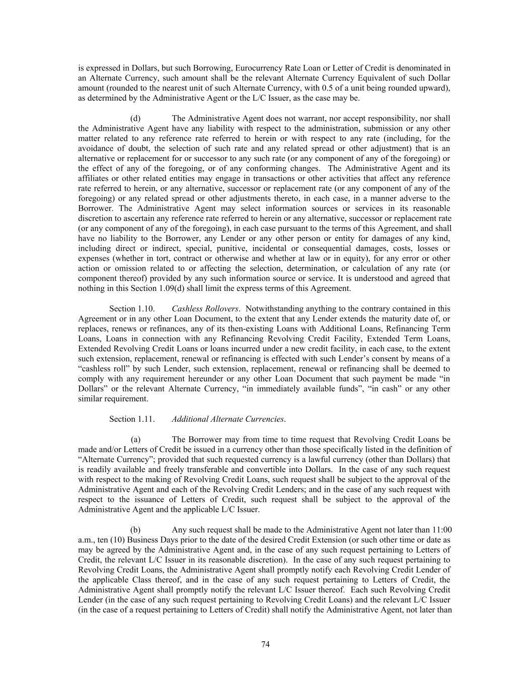 is expressed in Dollars, but such Borrowing, Eurocurrency Rate Loan or Letter of Credit is denominated in an Alternate Currency, such amount shall be the relevant Alternate Currency Equivalent of such Dollar amount (rounded to the nearest unit of such Alternate Currency, with 0.5 of a unit being rounded upward), as determined by the Administrative Agent or the L/C Issuer, as the case may be. (d) The Administrative Agent does not warrant, nor accept responsibility, nor shall the Administrative Agent have any liability with respect to the administration, submission or any other matter related to any reference rate referred to herein or with respect to any rate (including, for the avoidance of doubt, the selection of such rate and any related spread or other adjustment) that is an alternative or replacement for or successor to any such rate (or any component of any of the foregoing) or the effect of any of the foregoing, or of any conforming changes. The Administrative Agent and its affiliates or other related entities may engage in transactions or other activities that affect any reference rate referred to herein, or any alternative, successor or replacement rate (or any component of any of the foregoing) or any related spread or other adjustments thereto, in each case, in a manner adverse to the Borrower. The Administrative Agent may select information sources or services in its reasonable discretion to ascertain any reference rate referred to herein or any alternative, successor or replacement rate (or any component of any of the foregoing), in each case pursuant to the terms of this Agreement, and shall have no liability to the Borrower, any Lender or any other person or entity for damages of any kind, including direct or indirect, special, punitive, incidental or consequential damages, costs, losses or expenses (whether in tort, contract or otherwise and whether at law or in equity), for any error or other action or omission related to or affecting the selection, determination, or calculation of any rate (or component thereof) provided by any such information source or service. It is understood and agreed that nothing in this Section 1.09(d) shall limit the express terms of this Agreement. Section 1.10. Cashless Rollovers. Notwithstanding anything to the contrary contained in this Agreement or in any other Loan Document, to the extent that any Lender extends the maturity date of, or replaces, renews or refinances, any of its then-existing Loans with Additional Loans, Refinancing Term Loans, Loans in connection with any Refinancing Revolving Credit Facility, Extended Term Loans, Extended Revolving Credit Loans or loans incurred under a new credit facility, in each case, to the extent such extension, replacement, renewal or refinancing is effected with such Lender’s consent by means of a “cashless roll” by such Lender, such extension, replacement, renewal or refinancing shall be deemed to comply with any requirement hereunder or any other Loan Document that such payment be made “in Dollars” or the relevant Alternate Currency, “in immediately available funds”, “in cash” or any other similar requirement. Section 1.11. Additional Alternate Currencies. (a) The Borrower may from time to time request that Revolving Credit Loans be made and/or Letters of Credit be issued in a currency other than those specifically listed in the definition of “Alternate Currency”; provided that such requested currency is a lawful currency (other than Dollars) that is readily available and freely transferable and convertible into Dollars. In the case of any such request with respect to the making of Revolving Credit Loans, such request shall be subject to the approval of the Administrative Agent and each of the Revolving Credit Lenders; and in the case of any such request with respect to the issuance of Letters of Credit, such request shall be subject to the approval of the Administrative Agent and the applicable L/C Issuer. (b) Any such request shall be made to the Administrative Agent not later than 11:00 a.m., ten (10) Business Days prior to the date of the desired Credit Extension (or such other time or date as may be agreed by the Administrative Agent and, in the case of any such request pertaining to Letters of Credit, the relevant L/C Issuer in its reasonable discretion). In the case of any such request pertaining to Revolving Credit Loans, the Administrative Agent shall promptly notify each Revolving Credit Lender of the applicable Class thereof, and in the case of any such request pertaining to Letters of Credit, the Administrative Agent shall promptly notify the relevant L/C Issuer thereof. Each such Revolving Credit Lender (in the case of any such request pertaining to Revolving Credit Loans) and the relevant L/C Issuer (in the case of a request pertaining to Letters of Credit) shall notify the Administrative Agent, not later than 74